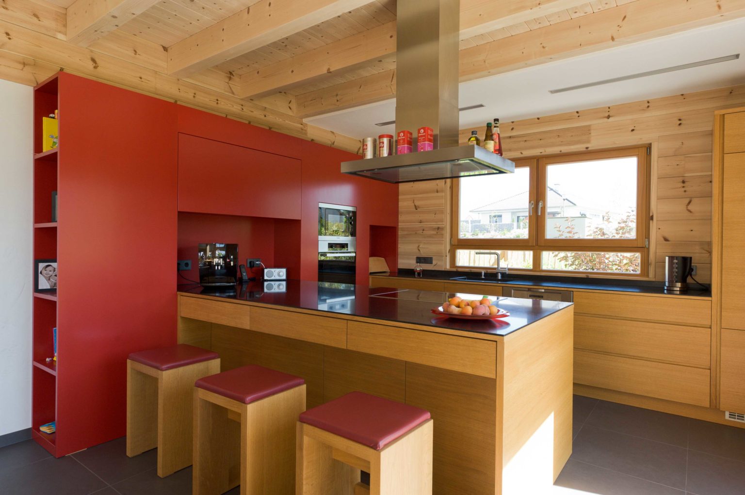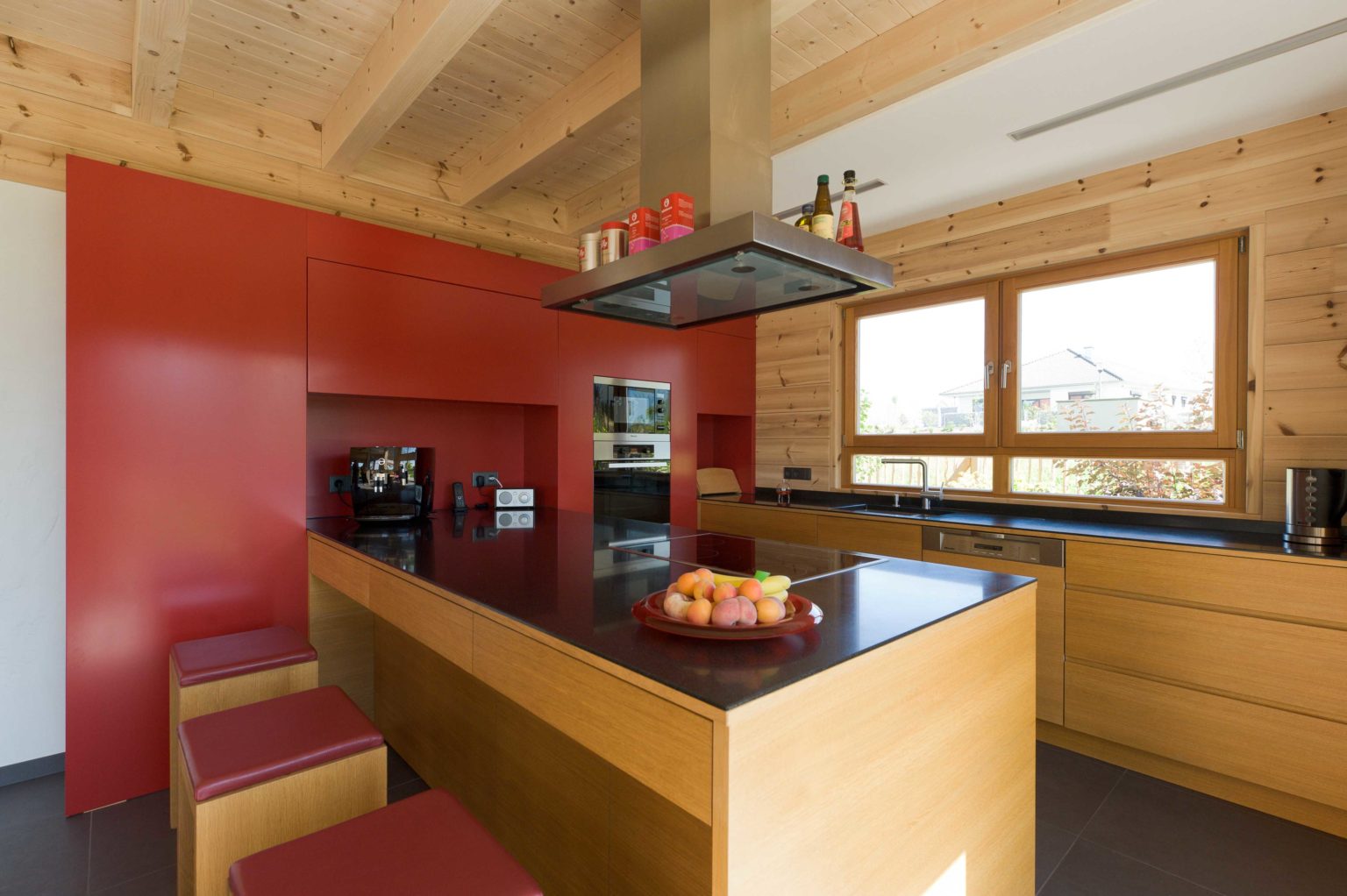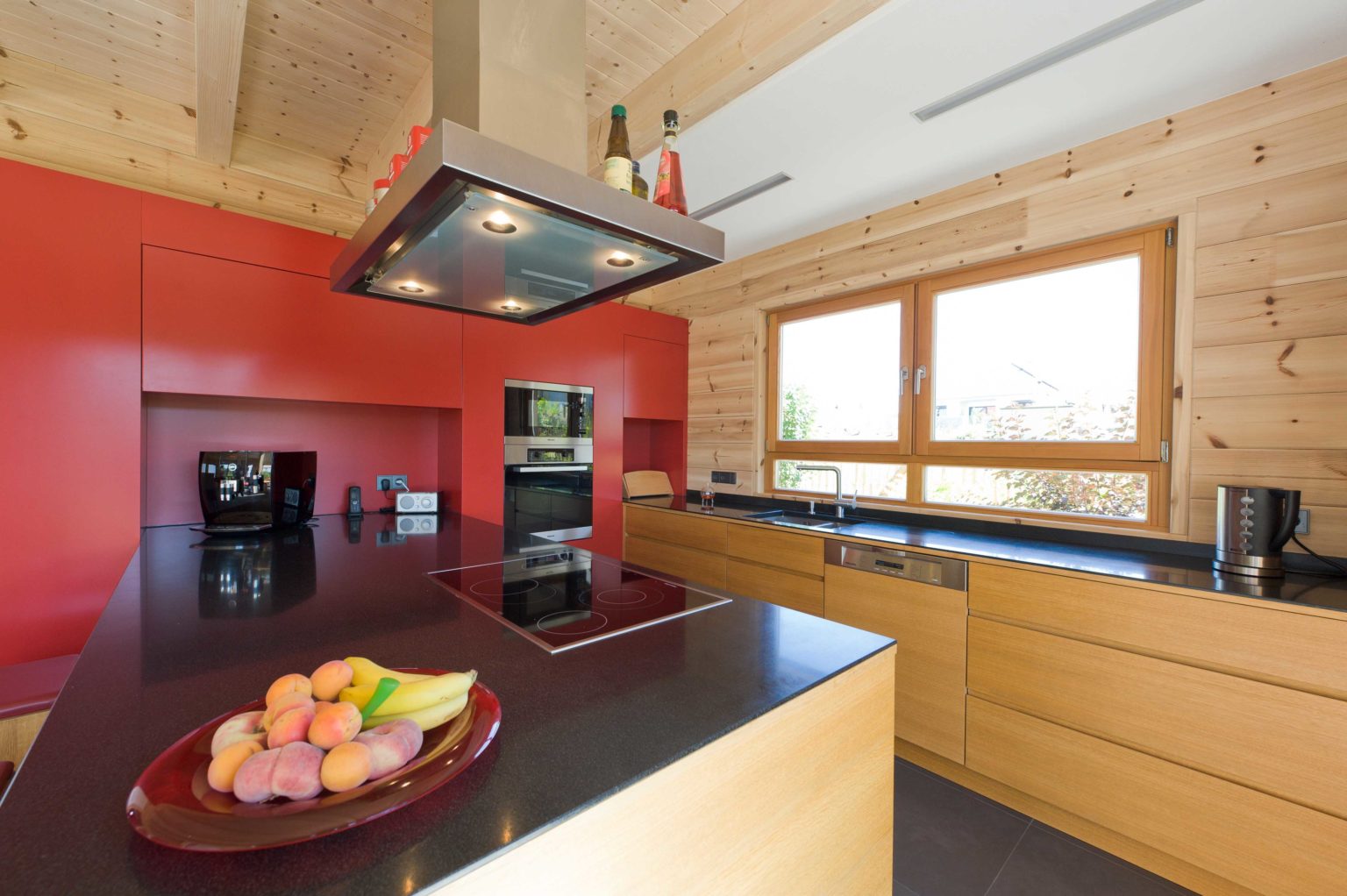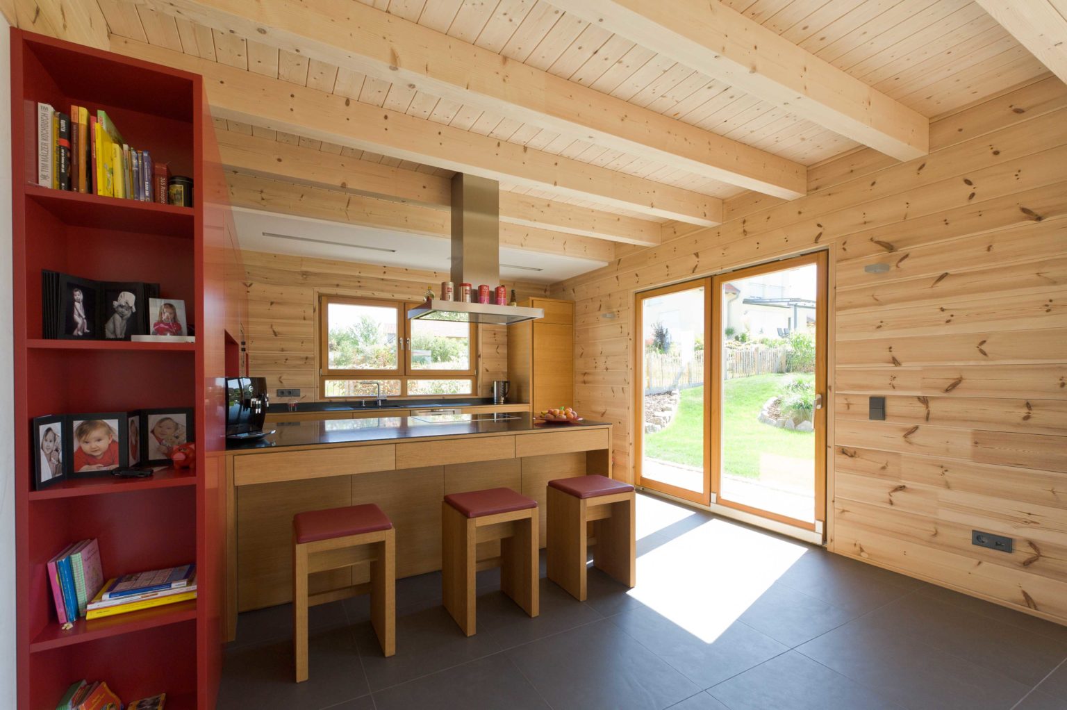 „Ursprünglich wollten wir mein geerbtes Elternhaus renovieren, modernisieren und einen Holzanbau daran machen, aber das wäre alles sehr viel Arbeit gewesen und natürlich auch sehr kostspielig. Bereits voll mit der Planung des Anbaus beschäftigt, dachten wir dann: warum nicht lieber gleich einen Traum realisieren anstatt nur zweckmäßig und vernünftig zu handeln?“, berichtet Hausherr Bruno. Für den Holzhaus-Spezialisten, dessen Musterhaus den Berndts so gut gefiel, war das kein Problem; gerne warf man dort alle Pläne über den Haufen und fing wieder bei Null an. „Zum Traumhaus aus Holz gehörte für uns unbedingt ein schönes Grundstück im Grünen, das wir dann auch schnell gefunden haben.“, erklärt das Ehepaar einstimmig. Sehr modern („bloß nicht rustikal“), hell, luftig und offen planten sie mit Hilfe des Holzhausherstellers ihr Traumhaus. Klare, sachliche Linien ziehen sich nun durchs ganze Holzhaus; kontrastreiche Wandflächen beleben das Ambiente: weich und sanft wirkende Massivholzwände werden durch glatte, verputzte Wandflächen und eine grobe Natursteinwand betont. Daraus ist ein harmonisches Wechselspiel entstanden, das angenehme Abwechslung und auch Gliederung ins Holzhaus bringt. Ganz konsequent bestimmen ausschließlich Naturmaterialien den Charakter des Hauses, so auch die zum Wohn-Essbereich offene Küche aus massiver Eiche. „Eine Kunststoffküche passt nicht in ein massives Holzhaus.“, meint der Hausherr. „Da das Holz der Kiefernwände relativ astlochreich ist, haben wir vom Schreiner eine Küche aus astlochlosem Eichenholz bauen lassen.“, erklärt er weiter. Übrigens sind fast alle Holzmöbel im Hause vom Schreiner gefertigt worden.