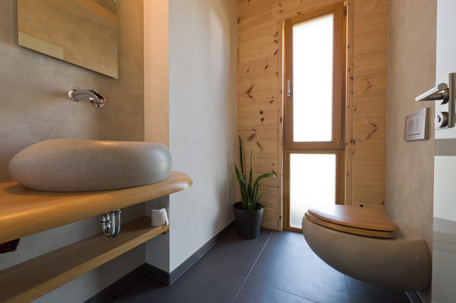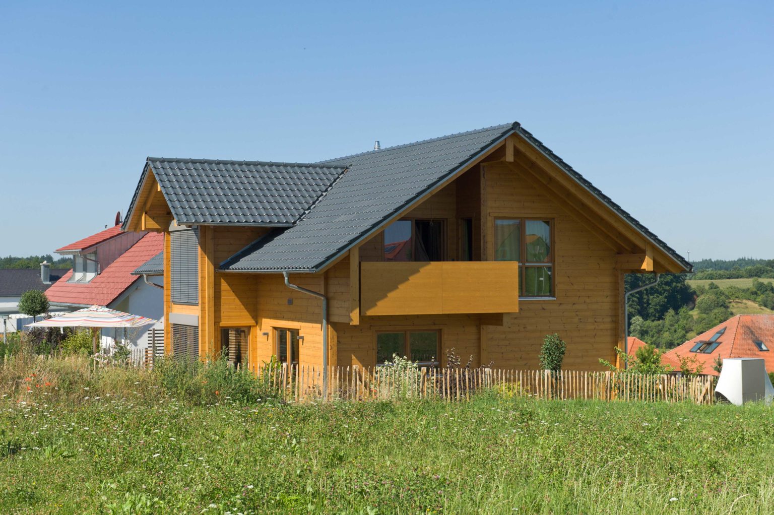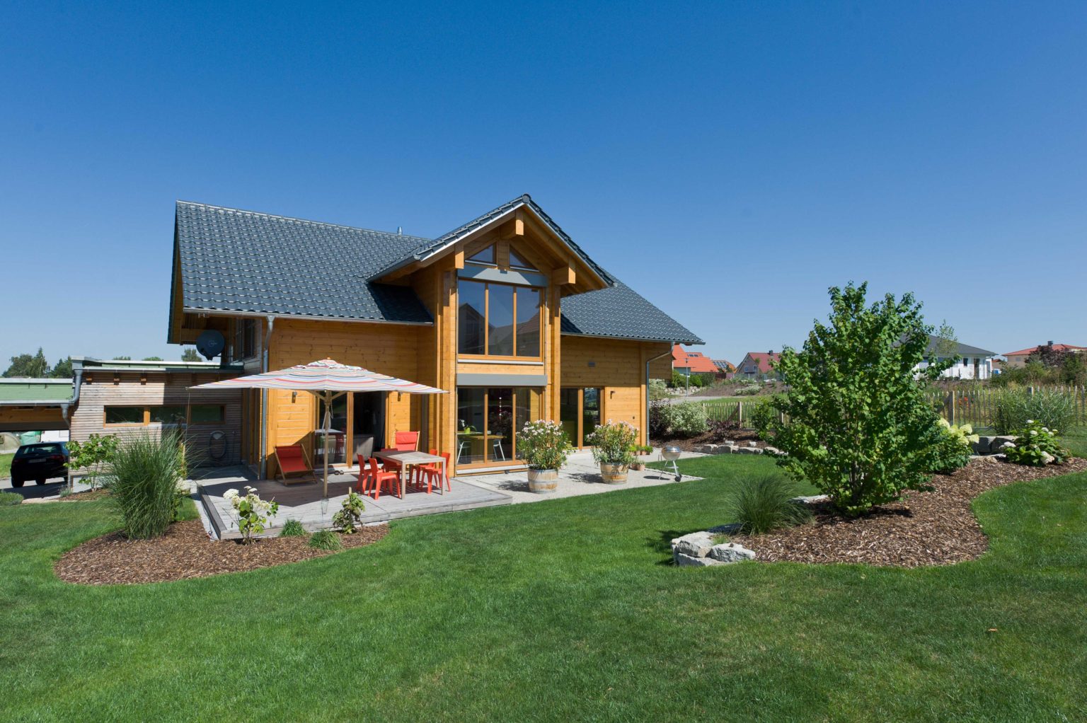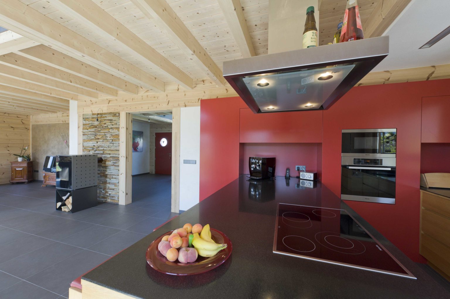 „Ursprünglich wollten wir mein geerbtes Elternhaus renovieren, modernisieren und einen Holzanbau daran machen, aber das wäre alles sehr viel Arbeit gewesen und natürlich auch sehr kostspielig. Bereits voll mit der Planung des Anbaus beschäftigt, dachten wir dann: warum nicht lieber gleich einen Traum realisieren anstatt nur zweckmäßig und vernünftig zu handeln?“, berichtet Hausherr Bruno. Für den Holzhaus-Spezialisten, dessen Musterhaus den Berndts so gut gefiel, war das kein Problem; gerne warf man dort alle Pläne über den Haufen und fing wieder bei Null an. „Zum Traumhaus aus Holz gehörte für uns unbedingt ein schönes Grundstück im Grünen, das wir dann auch schnell gefunden haben.“, erklärt das Ehepaar einstimmig. Sehr modern („bloß nicht rustikal“), hell, luftig und offen planten sie mit Hilfe des Holzhausherstellers ihr Traumhaus. Klare, sachliche Linien ziehen sich nun durchs ganze Holzhaus; kontrastreiche Wandflächen beleben das Ambiente: weich und sanft wirkende Massivholzwände werden durch glatte, verputzte Wandflächen und eine grobe Natursteinwand betont. Daraus ist ein harmonisches Wechselspiel entstanden, das angenehme Abwechslung und auch Gliederung ins Holzhaus bringt. Ganz konsequent bestimmen ausschließlich Naturmaterialien den Charakter des Hauses, so auch die zum Wohn-Essbereich offene Küche aus massiver Eiche. „Eine Kunststoffküche passt nicht in ein massives Holzhaus.“, meint der Hausherr. „Da das Holz der Kiefernwände relativ astlochreich ist, haben wir vom Schreiner eine Küche aus astlochlosem Eichenholz bauen lassen.“, erklärt er weiter. Übrigens sind fast alle Holzmöbel im Hause vom Schreiner gefertigt worden.