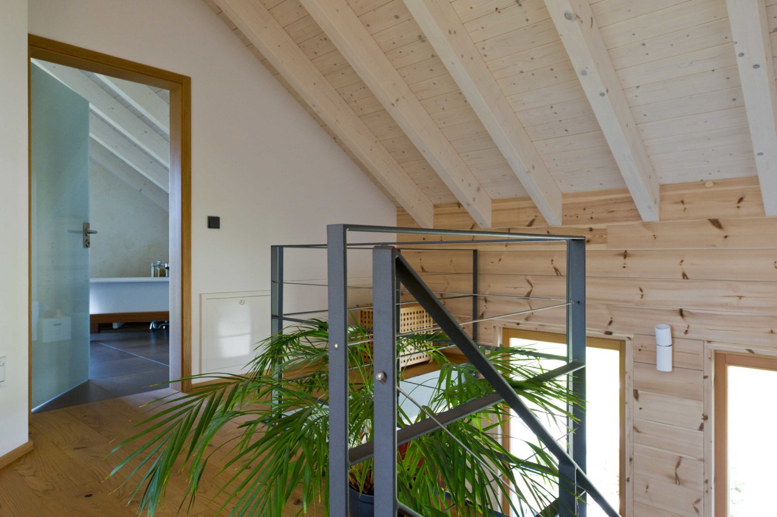 Holzhaus „Haselhof“ besitzt eine gut durchdachte, funktionelle Raumplanung: das Erdgeschoss steht, ganz klassisch, der Familie und Besuchern zur Verfügung – hier wird offen kommuniziert und Gäste können nicht nur bewirtet sondern auch im eigenen Gästezimmer untergebracht werden; das Obergeschoss bietet mit seinen drei Schlaf- und Kinderzimmern sowie dem Wohn-Badezimmer für jedes der vier Familienmitglieder genug Rückzugsmöglichkeiten und Privatsphäre. Ein großes Maß an Offenheit herrscht aber auch oben, wo man von der bis zum First offenen Galerie hinunter in den Essbereich sehen kann. Im zweistöckigen, zum Garten ausgerichteten, voll verglasten Erkervorbau befindet sich der große Esstisch (aus Eiche, wie gewachsen) mit – ausnahmsweise – Aluminiumstühlen in modernem Design. Überhaupt ist der Wohn-Ess-Kochbereich von großzügigen, bodentiefen Fenstern umgeben und somit von hellem Tageslicht verwöhnt. Auch das Obergeschoss profitiert sehr vom Blick ins Grüne und dem rund-um-die-Uhr einfallenden Tageslicht. Das Erdgeschoss ist zudem sinnvoll in zwei Bereiche unterteilt, nämlich Ankommen und Wohnen: Gäste betreten Holzhaus „Haselhof“ an der Nord-West-Seite, wo sie zuerst in den Eingangsbereich mit Garderobe gelangen, weiter geht es über einen Flur in die Diele mit offener Geschosstreppe und zum Gäste-WC. Ein Nebeneingang an der Westseite führt die Hausbewohner vom Carport durch einen Anbau, der als Hauswirtschaftsraum dient, direkt in den Eingangsbereich. So gelangt man immer trockenen Fußes vom Auto ins Holzhaus und umgekehrt. Von der Diele geht es entweder ins Gästezimmer, oder in den großzügigen Wohnbereich, oder ins Obergeschoss. Oben gibt es an der Nord-Ost Seite des Hauses einen Balkon, der die Hälfte der Stirnseiten einnimmt. Das Eltern-Schlafzimmer und ein Kinderzimmer besitzen je einen Zugang zum Balkon.
