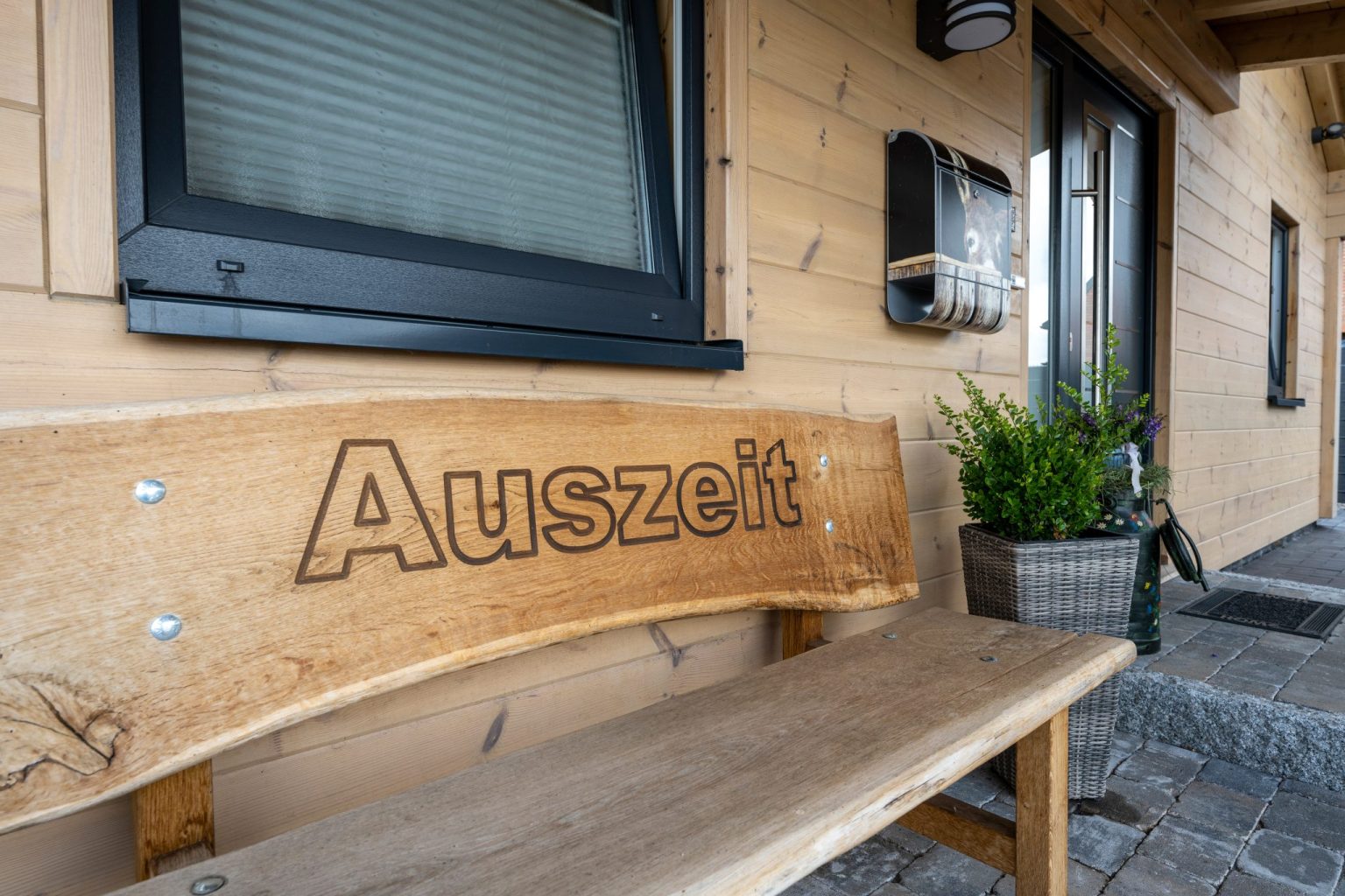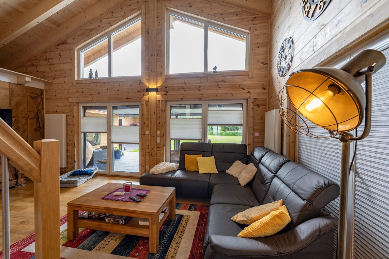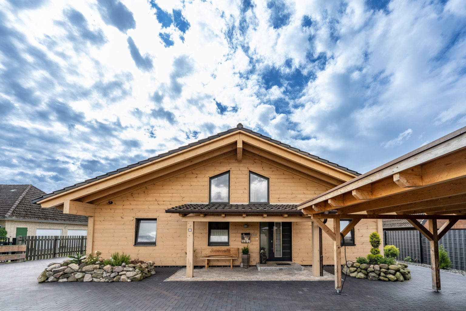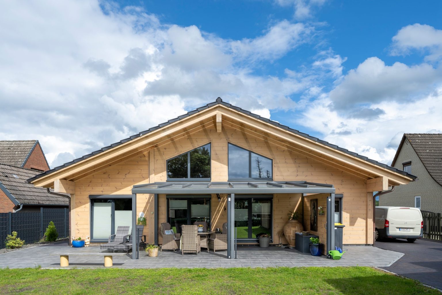 Holzhaus „Hercenthorpe“ besticht durch seine Geradlinigkeit, seine sehr hellen Holzwände und seine kontrastreich ergänzten Elemente (Fenster, Dachziegel, Terrassendach und Haustüre) in anthrazit. Insgesamt wirkt der durch die flache Dachneigung eigentlich gedrungene Baukörper sehr modern und schlank. Außen wurden die Blockwände im Farbton „Kiefer“ lasiert, wodurch ein natürliches Vergrauen des Holzes vermieden wird. Drinnen trug der Hausherr UV-Schutz gegen das Nachdunkeln durch Sonneneinstrahlung auf die Holzwände, die Balkendecken sowie den Sichtdachstuhl auf. Große Fenster – innen sind die Rahmen weiß! – bis unters Dach der Giebelseiten lassen reichlich natürliches Licht in den Wohnbereich und die Schlaf- sowie Kinderzimmer eindringen. Unterschiedlich gestaltete Wandverkleidungen bringen viel Abwechslung ins Haus und die Bodenfliesen des Koch-/Essbereichs grenzen diesen optisch vom restlichen, mit Holzdielen ausgelegten Wohnbereich ab.
