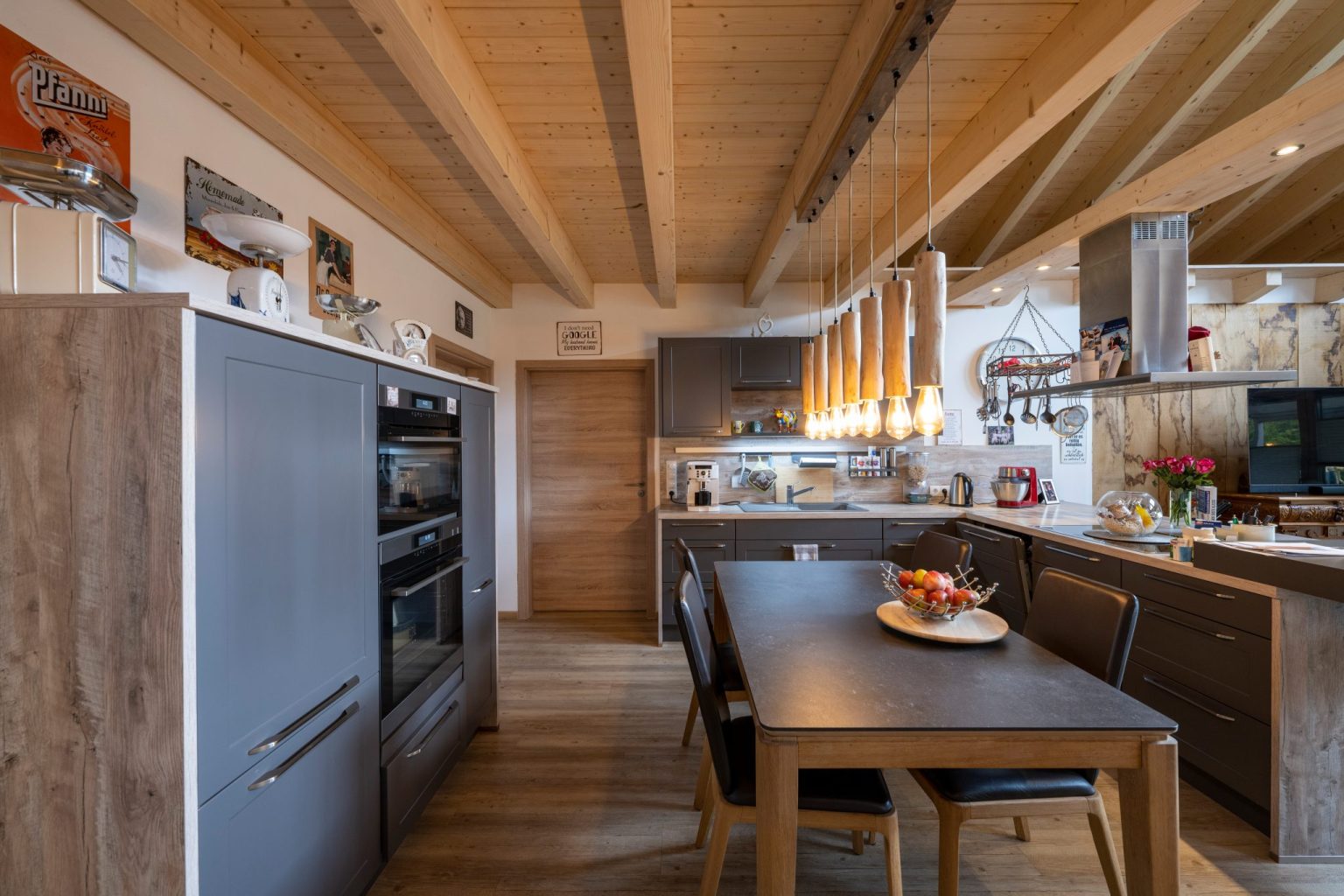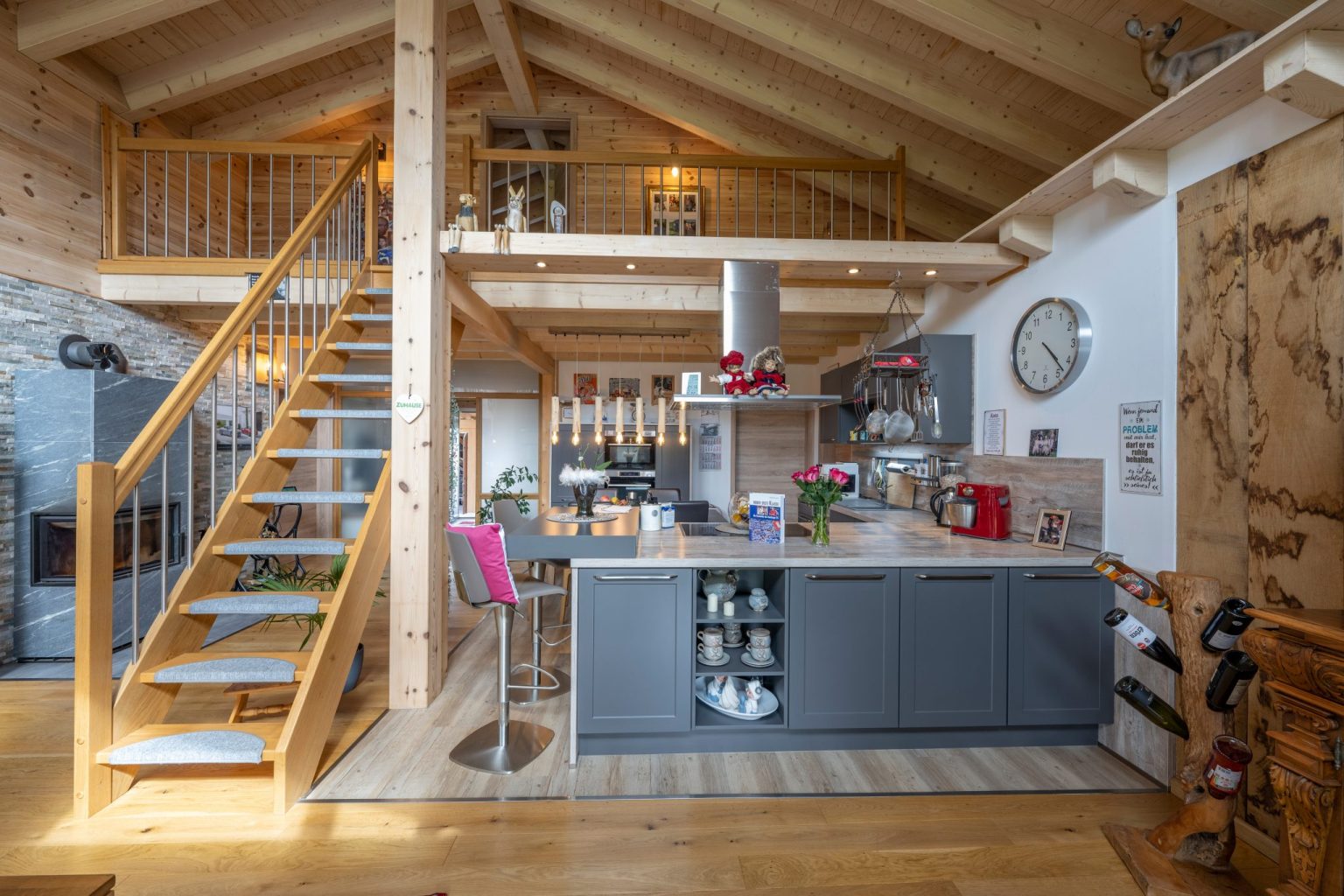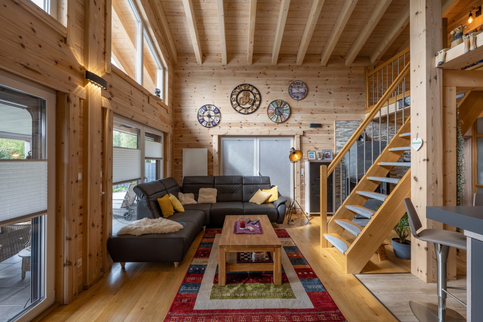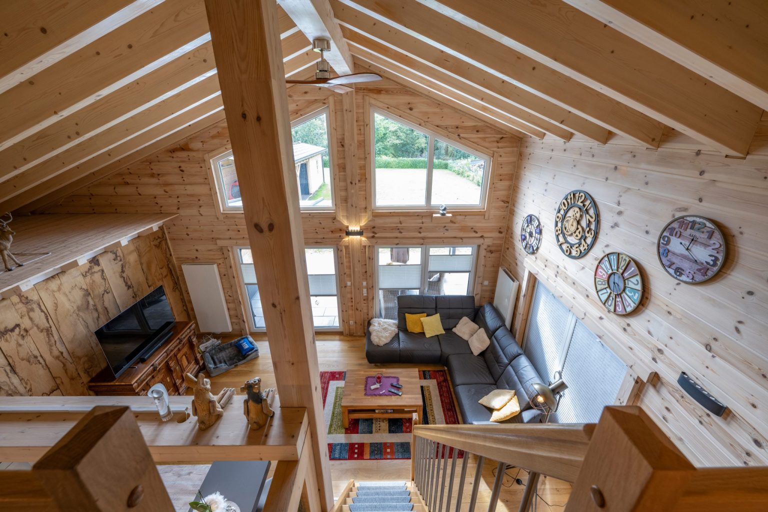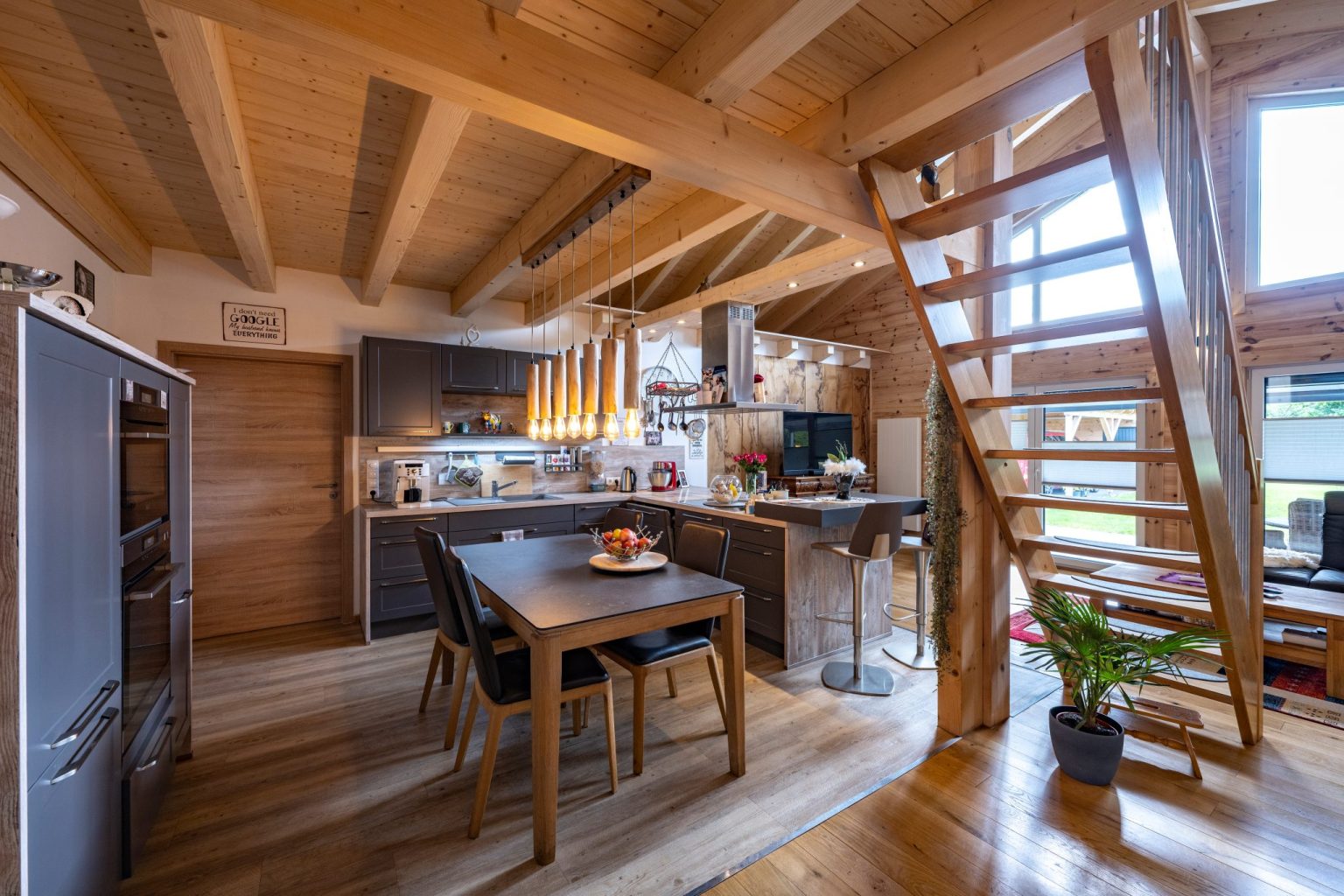 Holzhaus „Hercenthorpe“ ist ein schönes Beispiel dafür, dass eine vierköpfige Familie nicht unbedingt die klassischen eineinhalb bis zwei Geschosse bauen muss. Sofern das Baugrundstück groß genug ist, bietet sich Familienleben auf einer Ebene sogar an und vereinfacht den Wohnalltag ein Stück weit. Zwar besitzt das eingeschossige Wohnhaus mit der relativ flachen Dachneigung eine großzügige Galerie unterm Satteldach, die wird derzeit aber nicht zum Wohnen genutzt, sondern stellt eine Option für diverse Nutzungsmöglichkeiten dar. Zudem verleiht sie dem weitläufigen Wohn-/Ess-/Kochbereich noch mehr Behaglichkeit, denn dieser wäre sonst in der Vertikalen bis zur sichtbaren Firstpfette und zum imposanten Sichtdachstuhl komplett offen. Nicht minder eindrucksvoll ist auch die Sichtbalkendecke unter der Galerie.