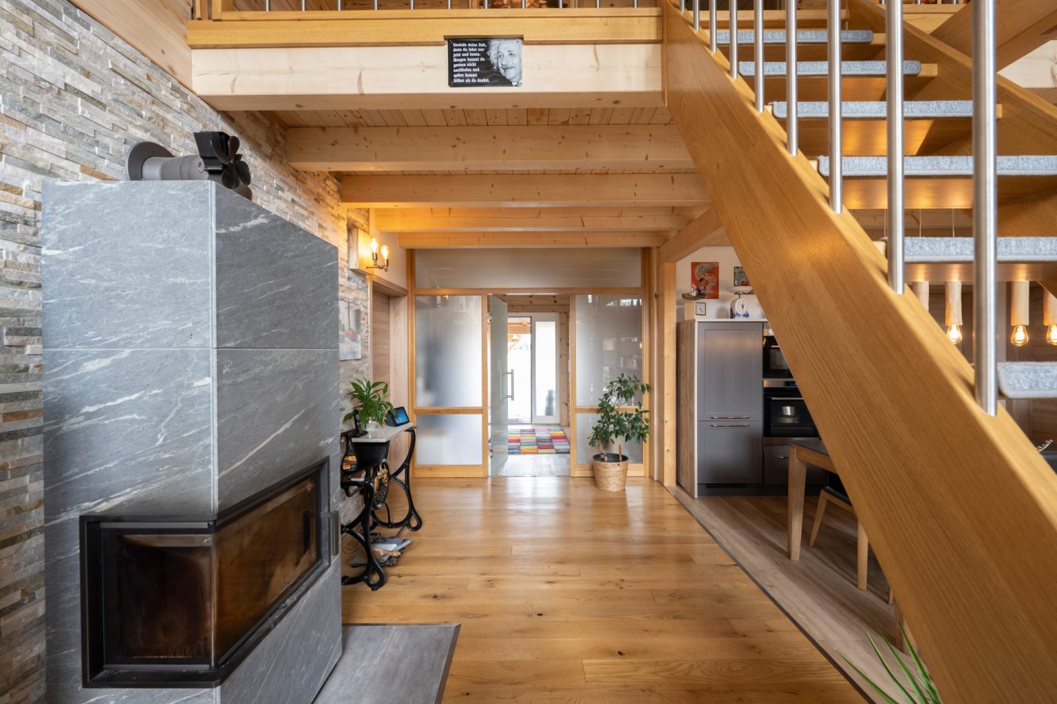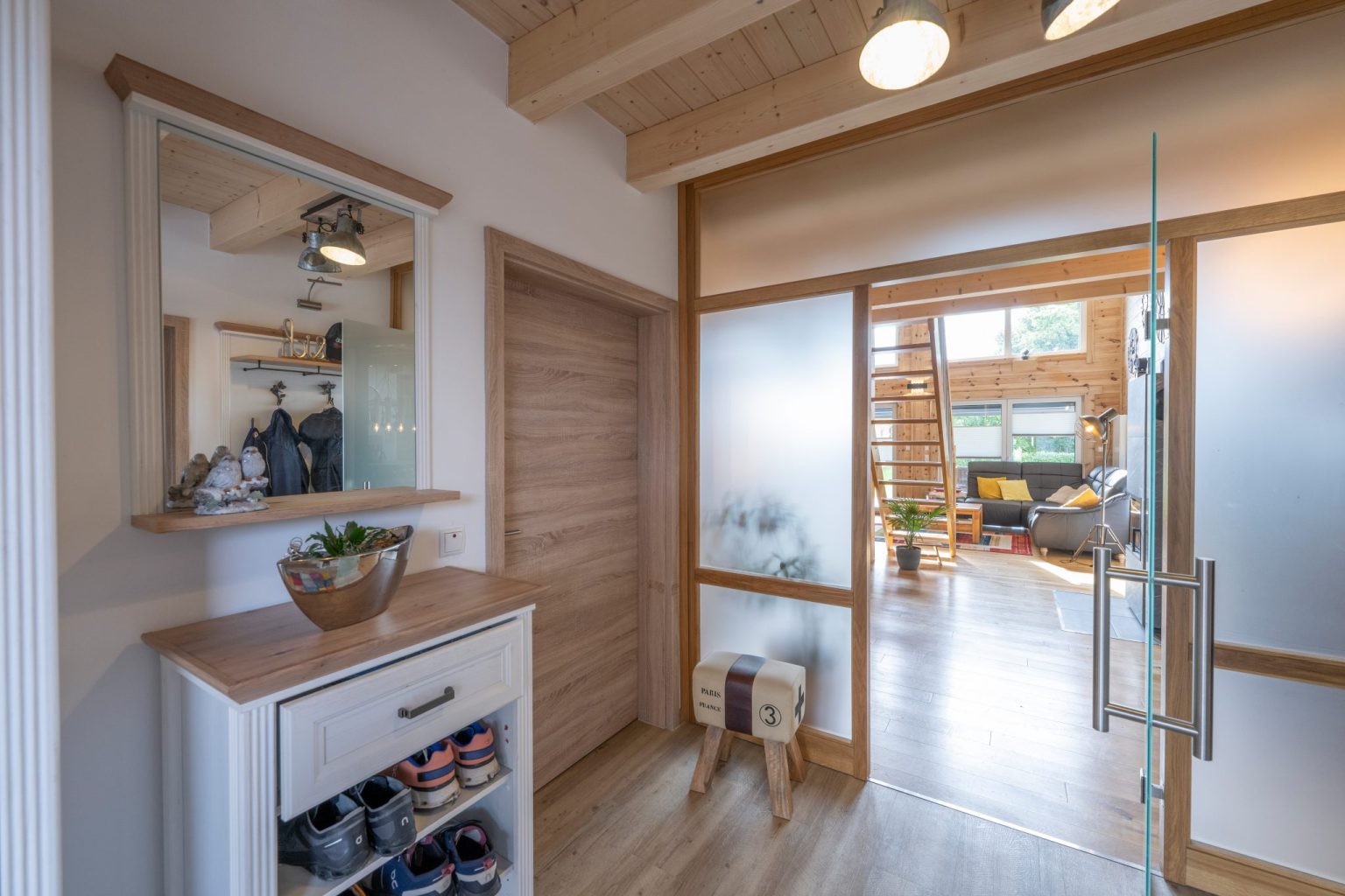 Das Klimafreundliche Holzhaus besitzt einen rechteckigen Grundriss, in dem neben dem erwähnten Wohn-/Ess-/Kochbereich zwei Kinderzimmer, ein Schlafzimmer, ein Hauswirtschaftsraum, ein großes Badezimmer sowie eine Gästedusche/WC untergebracht sind. Beim Eintreten ins Haus gelangt man vorab in einen Flur, von dem die Bäder und der Wohnbereich abgehen. Zwischen Wohnbereich und Flur befindet sich eine undurchsichtige Glaswand mit Glastüre, welche das Licht hindurchlassen und gleichzeitig Wind- und Sichtschutz sind. In die restlichen Zimmer gelangt man vom Wohnbereich aus. Besonders praktisch ist der direkte Zugang von der Küche in den Hauswirtschaftsraum, welcher außerdem einen eigenen Ausgang besitzt. Schwere Einkäufe und Getränkekästen können so auf kürzestem Weg direkt ins Holzhaus getragen werden.