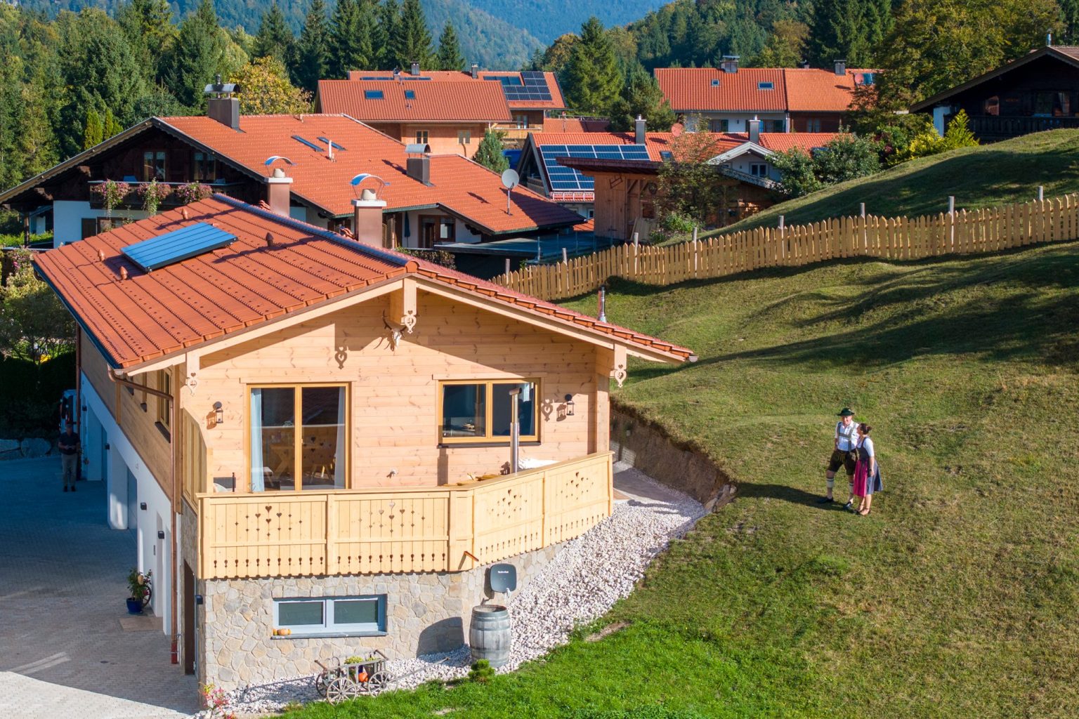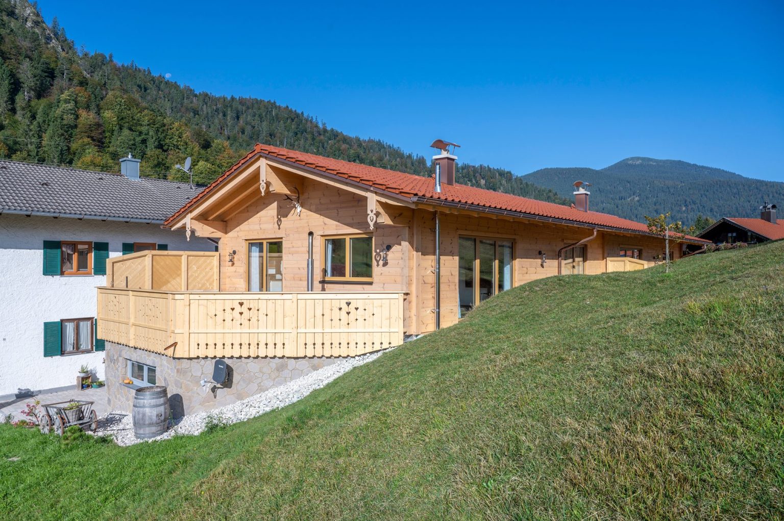 Das Holzhaus „Herzbluad Chalets“ wurde als Feriendomizil für Bergsportler und Erholungssuchende in Wallgau (nahe Garmisch-Partenkirchen im Werdenfelser Land) gebaut. Es befinden sich zwei geräumige Ferienwohnungen mit jeglichem Komfort und Wellness-Bädern in dem eingeschossigen Holzgebäude, das auf einem betonierten Untergeschoss direkt am Hang ruht. Nachdem die Eigentümer, Monika und Hans Wörnle, ihr Holzhaus zusammen mit Fullwood Wohnblockhaus detailliert durchgeplant hatten, bauten sie es selber unter der Regie und Vorarbeit eines Fullwood-Richtmeisters auf. Zuerst errichteten sie in Eigenregie das Untergeschoss aus Beton, dann wurden die wenigen Wandelemente sowie Dachstuhlelemente per Tieflader von Fullwood angeliefert und mittels eines Krans auf das Untergeschoss gehievt. Das Stellen der Wände ging schnell, weil sie zuvor passgenau im Werk gefertigt wurden, genau wie die Dachstuhlteile. Die ganze Familie half kräftig mit und nach wenigen Tagen hatte der Richtmeister seine Arbeit beendet. Den kompletten Innenausbau führten Hans und Monika Wörnle anschließend eigenhändig und mit Hilfe von ortsansässigen Fachfirmen durch.