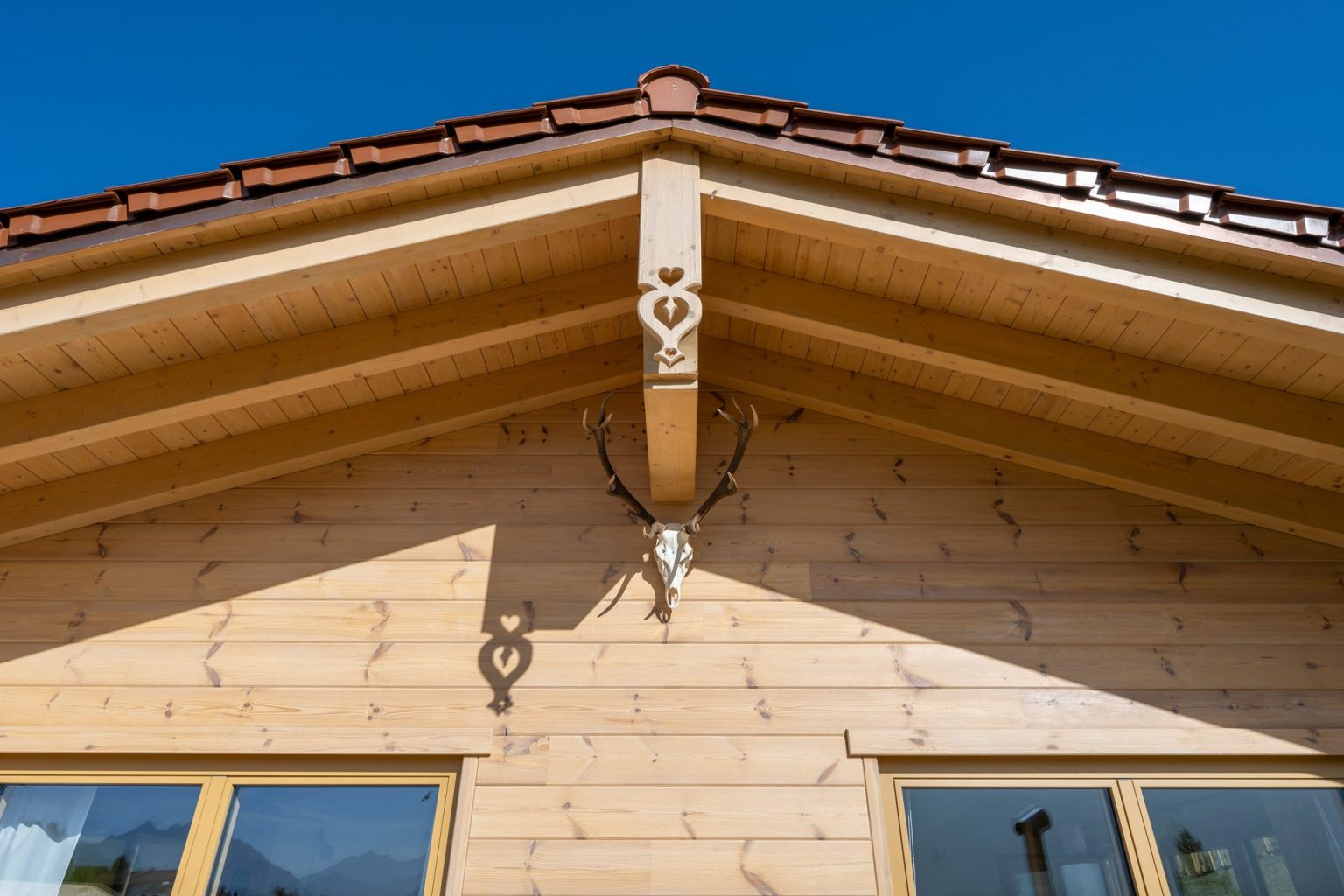 Geradliniges Holzhaus mit regionaltypischen Schmuckelementen