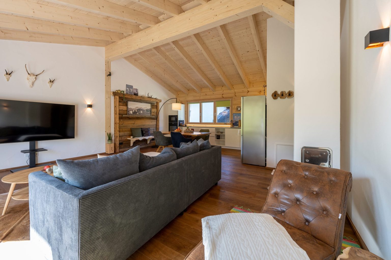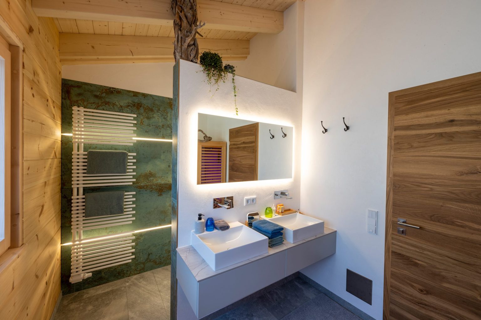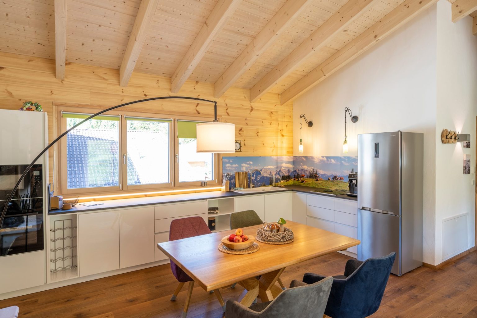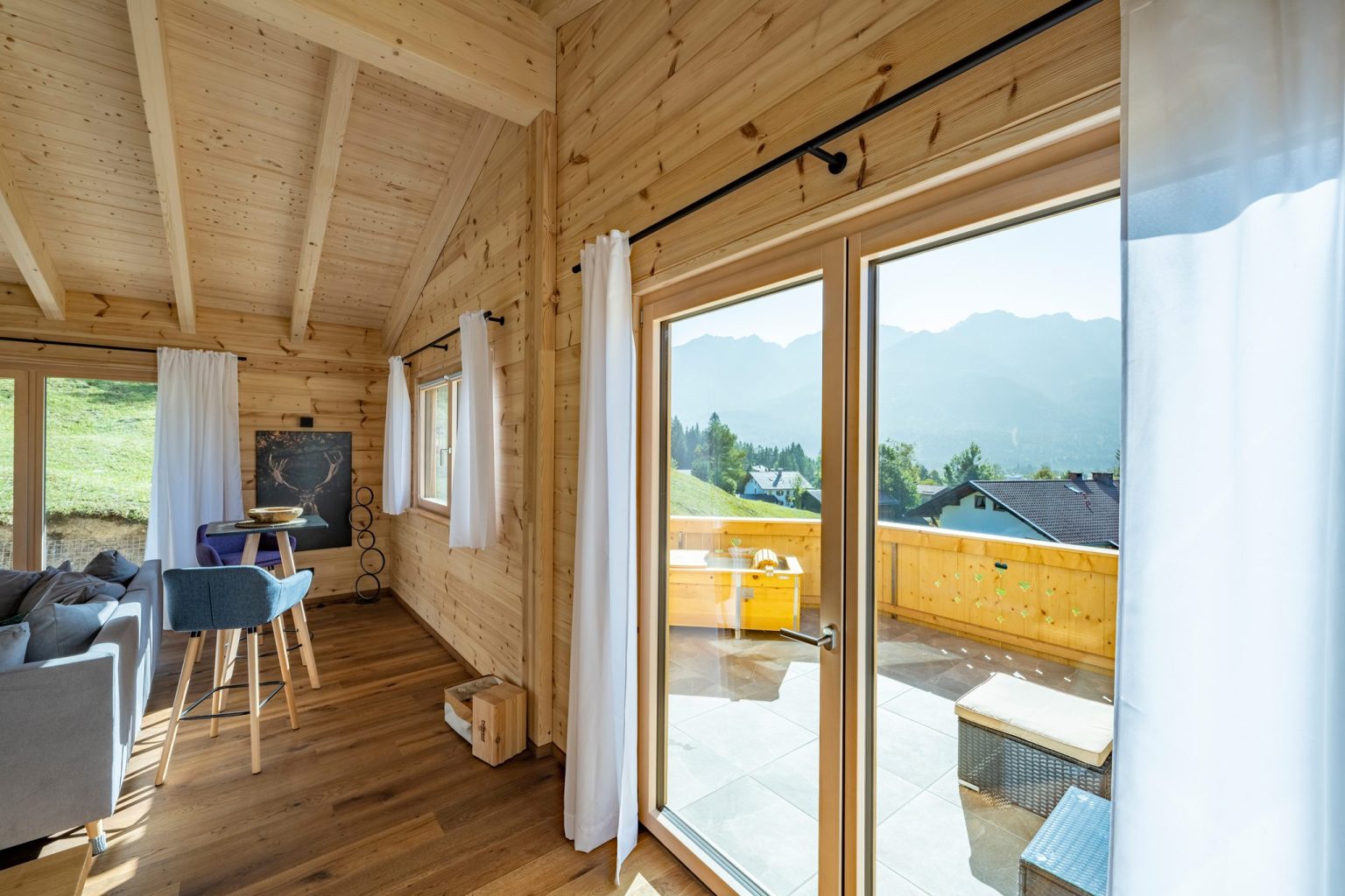 Die beiden Ferienwohnungen sind ungefähr gleich groß und verfügen jeweils über einen offenen Wohn-/Ess-/Kochbereich, ein geräumiges Schlafzimmer, ein Dusch-Badezimmer mit Infrarotkabine sowie einen keinen Flur. Die Zugänge zu den Wohnungen sind getrennt und führen jeweils über eine eigene Treppe durch das Untergeschoss. Jede Wohneinheit besitzt mindestens eine Terrasse. Viele große Fenster lassen reichlich Tageslicht in die Räume. Zu den naturhellen Kiefernwänden und dem offenen Sichtdachstuhl kombinierten Monika und Hans Wörnle weiß gestrichene Trennwände aus leichtem Ständerwerk. Alles Holz wird innen mit UV-Schutz vor dem Nachdunkeln bewahrt und außen sorgt ein unsichtbarer Wetterschutzanstrich dafür, dass das schöne, helle Holz sich optisch nicht verändert. Haltbar und widerstandsfähig ist es sowieso, ganz ohne Schutzanstrich! Holzdielenböden in einem warmen braun verstärken den natürlichen und behaglichen Gesamteindruck in Holzhaus „Herzbluad Chalets“ und die anthrazitfarbenen Bodenfliesen in den Bädern erinnern an Gebirgsgestein. Die geschmackvolle Einrichtung ist modern mit alpenländischen Elementen gehalten und von der Hausherrin mit Liebe zum Detail ausgesucht.