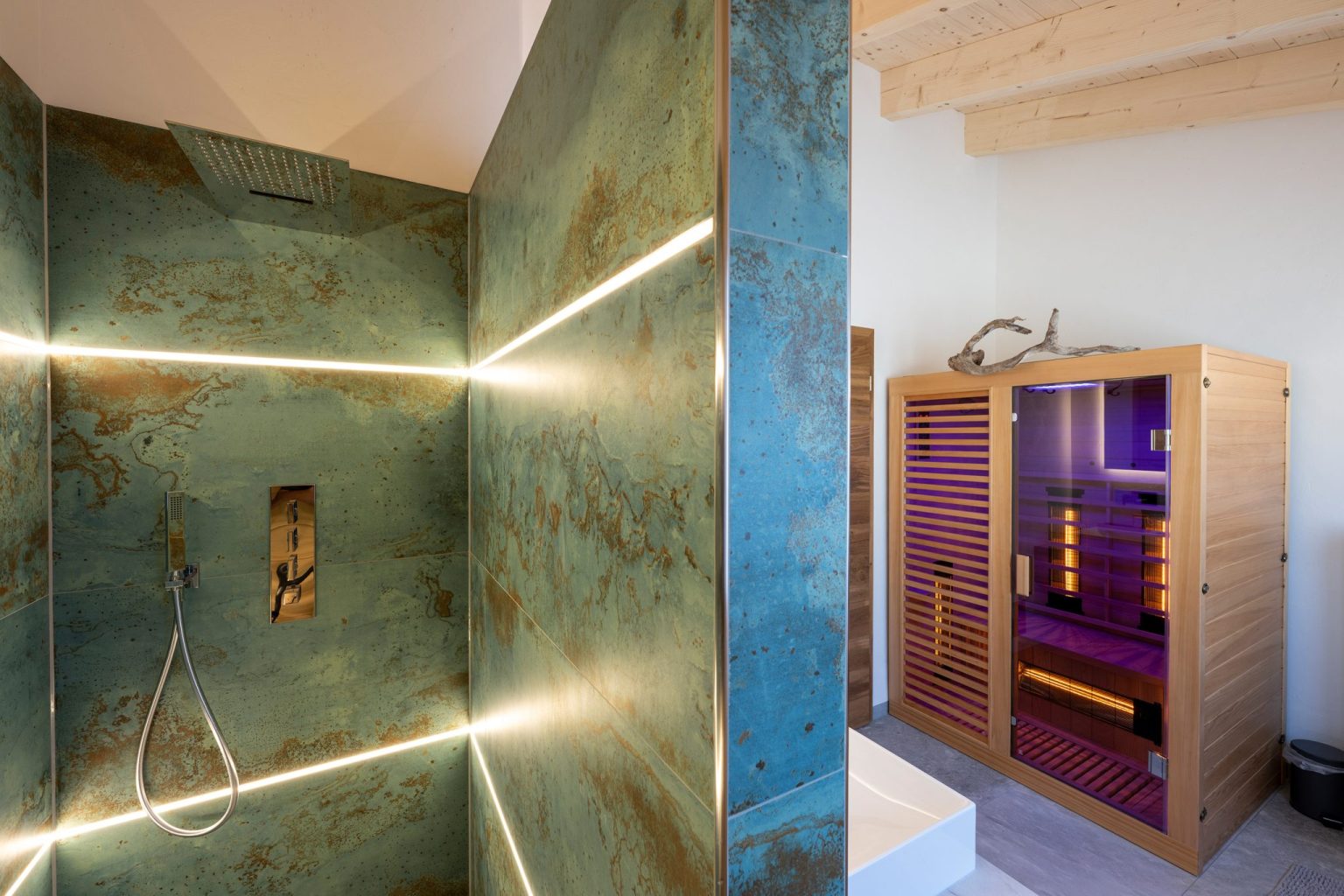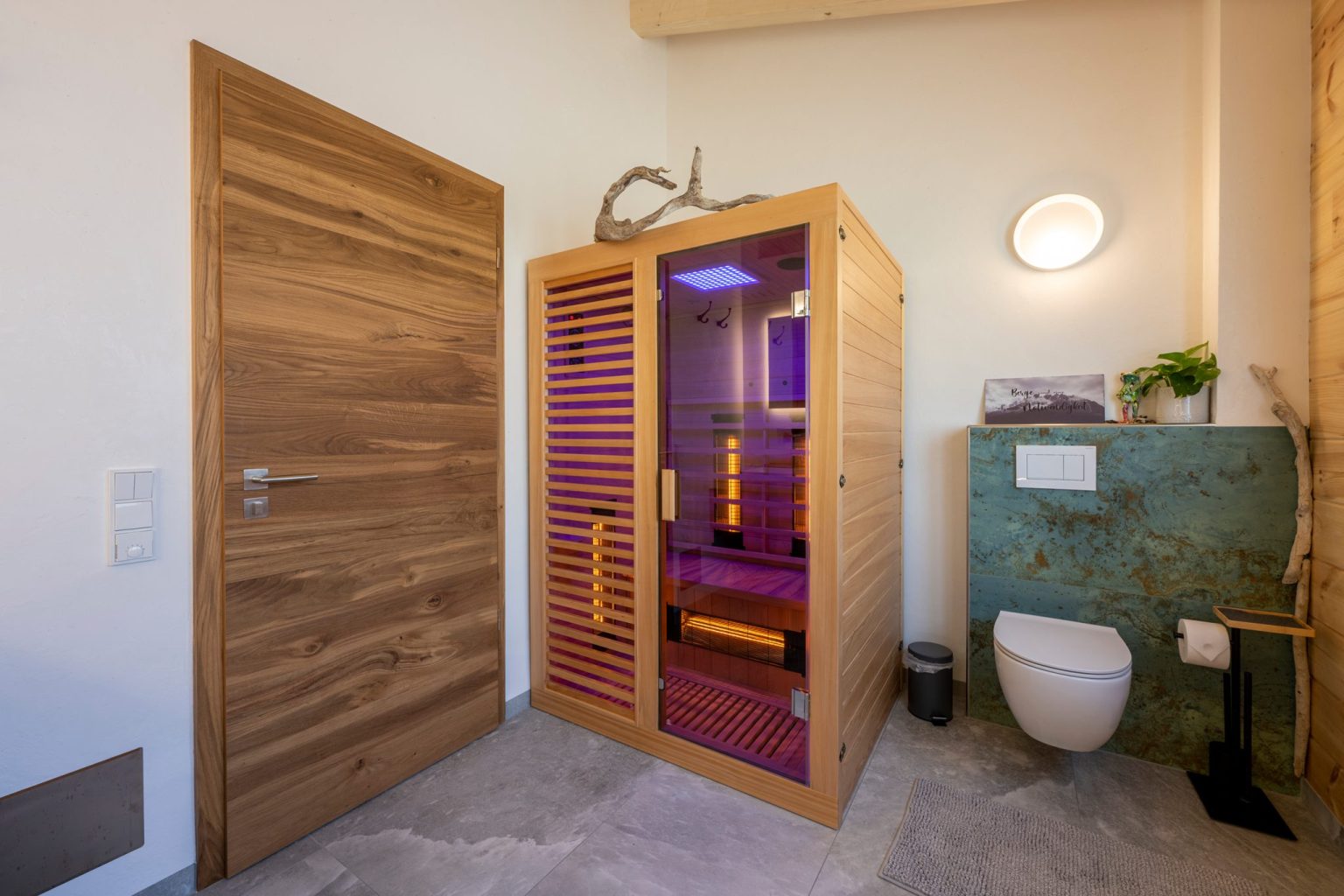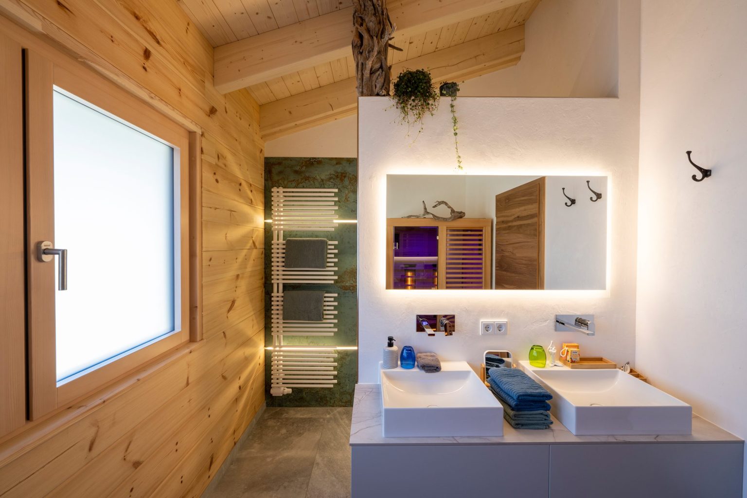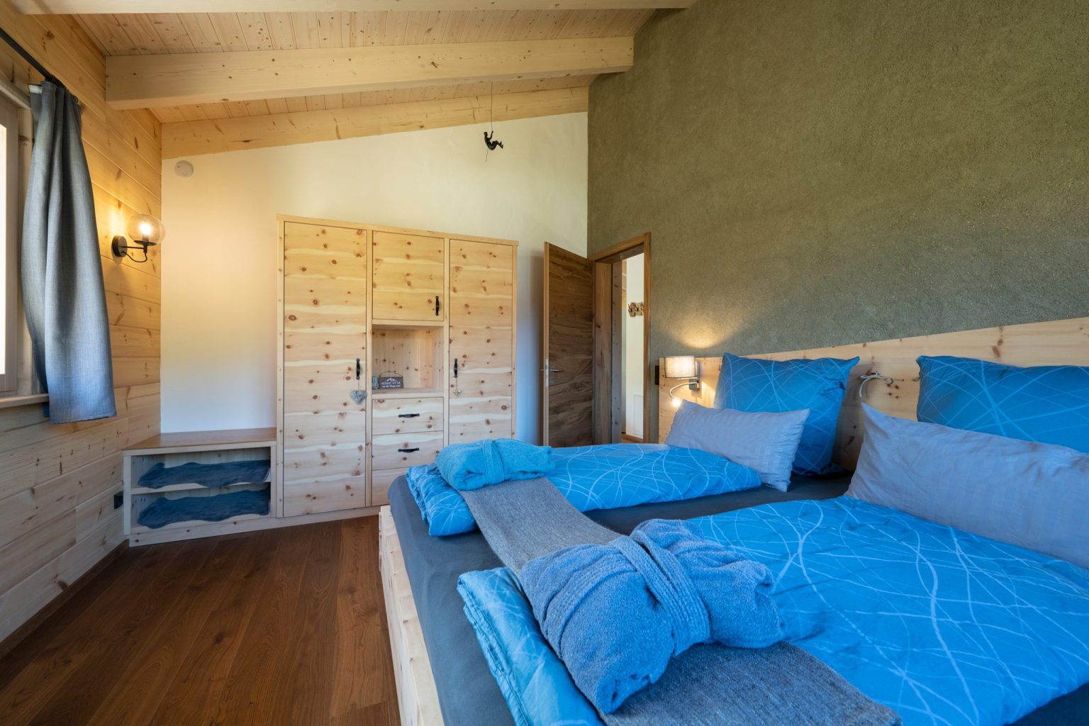 Zuerst draußen am Berg aktiv sein und sich dann genussvoll in der Infrarotkabine durchwärmen lassen, oder lieber den ganzen Tag lesend die gemütliche Atmosphäre im Holzhaus und auf der Sonnenterrasse genießen? Hier kommt jeder auf seine Kosten, ob eine kleine Familie oder ein Paar: Das nachweislich wohltuende Klima in Holzhaus „Herzbluad Chalets“ und der zarte Duft nach Kiefernholz tut seine entspannende Wirkung. Erzeugt wird dieses einzigartige, gesunde Raumklima durch 20cm dicke, komplett schadstofffreie Blockbohlenwände aus Polarkiefernholz, die ohne zusätzliche Dämmung auskommen. Ihre Diffusionsoffenheit sorgt für einen natürlichen Luftaustausch – die Wände „atmen“ sozusagen –, für Feuchtigkeitsaufnahme und -abgabe sowie für ein entspanntes Wohlbehagen, das so nur innerhalb von massiven Holzwänden entsteht. Die Herzfrequenz senkende und damit Entspannung fördernde Wirkung von Massivholzwänden wurde sogar wissenschaftlich nachgewiesen!
