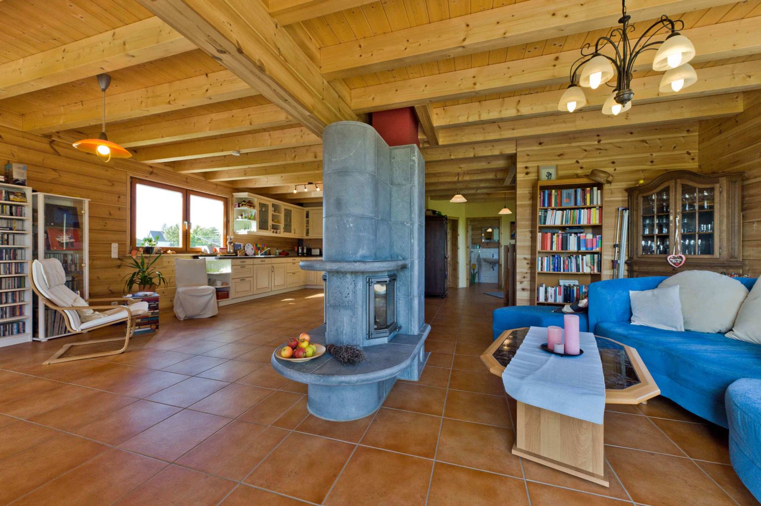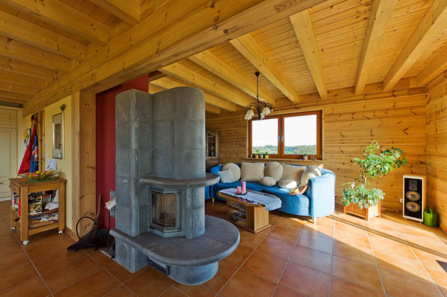 Im Innern des Holzhauses sorgen in hellen Farben verputzte Ständerbauwände neben den naturbelassenen Kiefernwänden für Helligkeit und optische Wärme. Die Fenster lassen viel Tageslicht herein, welches das Holz leuchten lässt und von den verputzten Wänden reflektiert wird. Die psychisch wahrgenommene warme Ausstrahlung des Holzes bringt Menschen dazu, sich bei einigen Grad Celsius niedrigeren Temperaturen schon wohlig warm zu fühlen. Das ist wissenschaftlich belegt und führt zu einem geringeren Verbrauch von Heizenergie. Die guten Dämmeigenschaften der zwanzig Zentimeter starken Fullwood-Wände tragen ebenfalls zu einem niedrigen Heizenergieverbrauch bei. Holzhaus „Hexenturm“ kann zwar mit Hilfe einer Gastherme versorgt werden, aber die Bewohner bevorzugen die kuschelige Strahlungswärme ihres Specksteinofens, den sie mit Holzscheiten befeuern. Als dekorativer Raumteiler ist er etwa in der Mitte des rechteckigen Hausteils im Erdgeschoss platziert und wärmt auch gleich die zum Wohnbereich offene Diele mit. So kann die Wärme über Diele und Treppenhaus noch ins Dachgeschoss entweichen, welches zusätzlich von der aufgeheizten Kaminabzugswand profitiert.