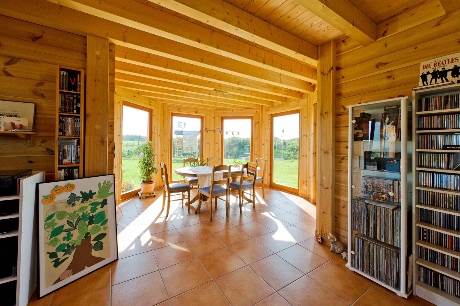 Der Wunsch nach einem gemütlichen Heim bewog die naturverbundenen und ökologisch interessierten Hausbesitzer sich für ein massives Holzhaus zu entscheiden, einem eher ungewöhnlichen Baumaterial, das aufgrund seiner hervorragenden Eigenschaften immer mehr Freunde findet. In einer Ökologischen Testzeitschrift fand die Dame des Hauses den Spezialisten für Holzhäuser Fullwood Wohnblockhaus, überzeugte sich mit ihrem Mann vor Ort von dessen Qualitätsanspruch und war begeistert von der garantierten Setzungsfreiheit der Massivholzwände. Mit Holzhaus „Hexenturm“ hat sich das Paar seinen ganz individuellen Traum vom Eigenheim erfüllt und konnte seine Bedürfnisse, Vorstellungen, Wünsche und den eigenen Geschmack beim Ökohaus bauen voll und ganz mit einbringen – ein Nullachtfünfzehn-Haus wollten die beiden nicht.