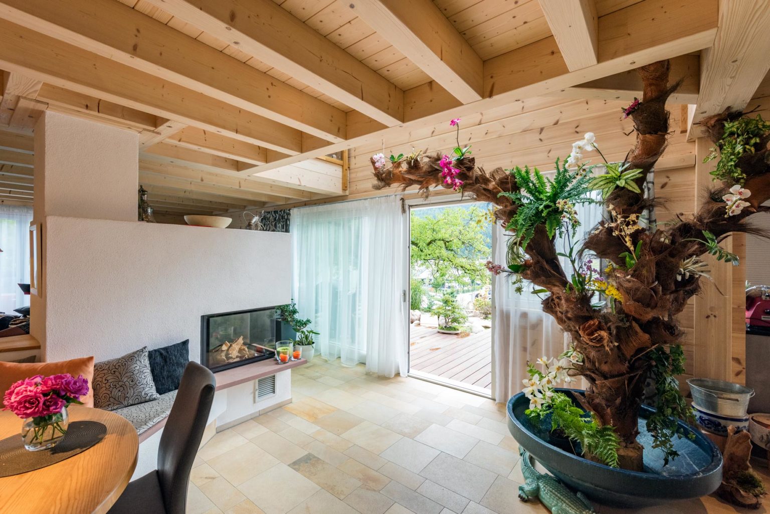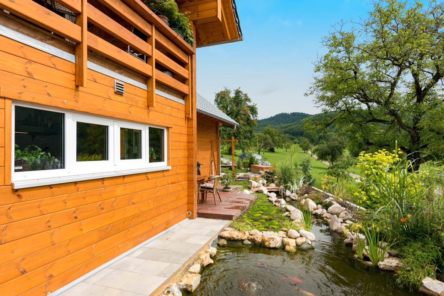 „Falls es im fortgeschrittenen Alter mal nicht mehr möglich sein sollte, die Treppe hinauf zu steigen, kann das Büro in ein Schlafzimmer umfunktioniert werden, und die Gäste-Dusche/WC als ebenerdiges Bad genutzt werden.“, beschreibt Beate Braun den flexibel anpassbaren Grundriss. Bis es soweit ist, nutzen sie und ihr Mann aber ihr licht ausgebautes Dachgeschoss, wo sich ein großes Schlafzimmer samt Ankleide, eine sehr geräumige Galerie zum Lesen und Zurückziehen sowie ein Wohnbadezimmer befinden. „Obwohl wir keine Rollladen haben, ist es selbst an heißen Sommertagen nie zu warm im Haus.“, freut sich der Hausherr. Das liegt natürlich nicht nur an den gut dämmenden Blockwänden und Wärmeschutzfenstern, sondern auch an der Ausrichtung der großen Fensterflächen nach Nord/West und Süd/West. „Eine automatische Lüftungsanlage wollten wir nicht, da gibt`s zu viele Vorschriften zu beachten, damit die wirkt.“, meint Jürgen Braun. Seine Fußbodenheizung wird mit einer Luftwärmepumpe betrieben, ein dekorativer Kamin unterstützt mit Strahlungswärme und ermöglicht Sicht auf lodernden Flammen, und Regenwasser wird in einer riesigen Zisterne aufgefangen und gespeichert, um den Garten zu bewässern. „Ich würd`s wieder tun!“, sagt der Hausherr über den Bau seines Holzhauses mit Fullwood.