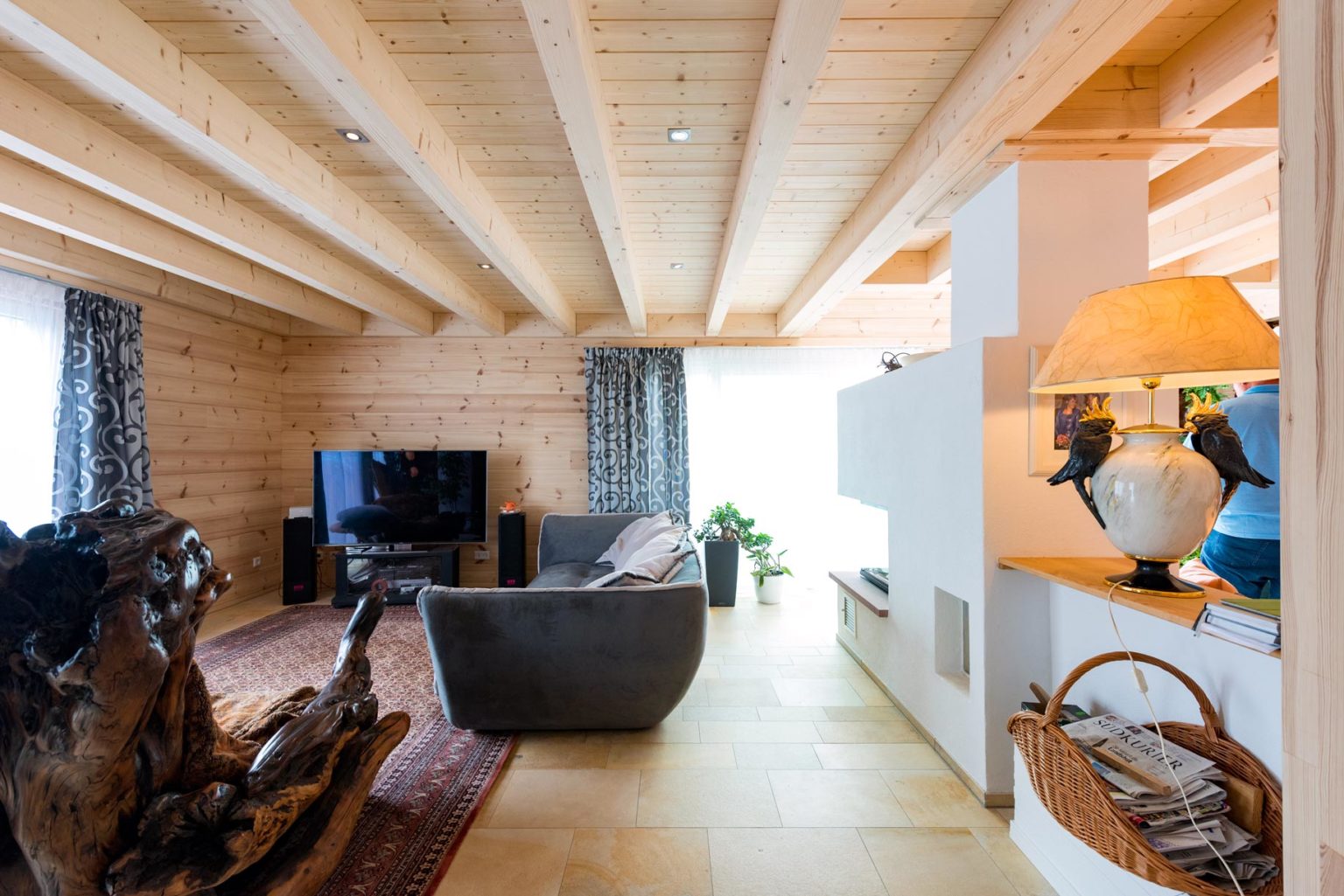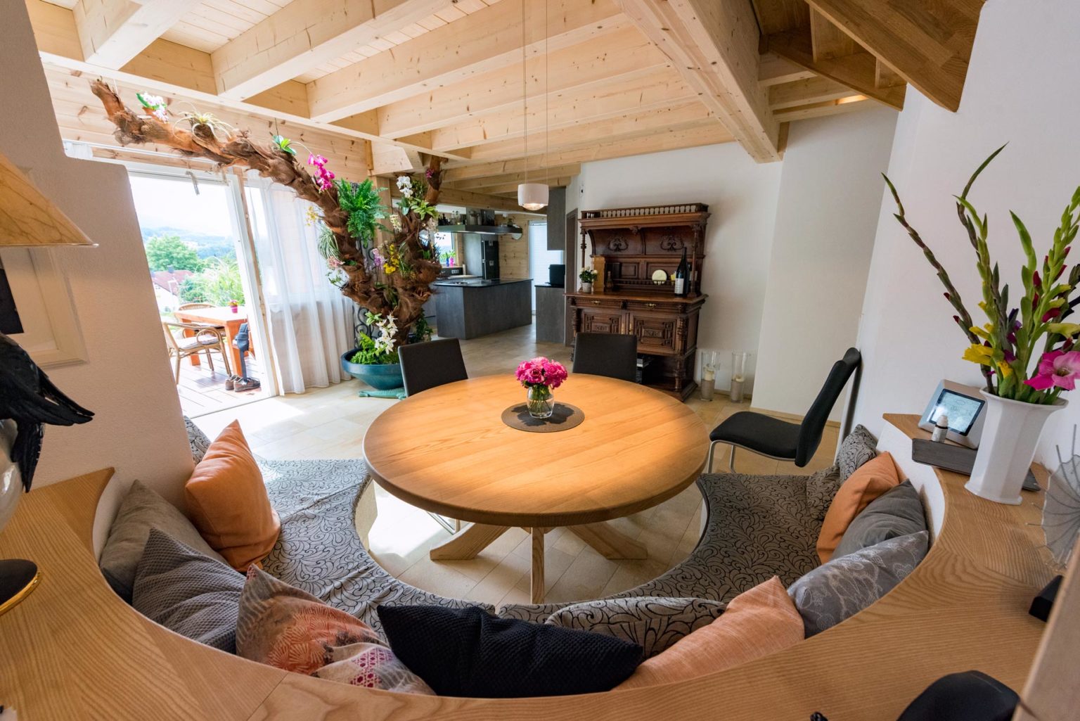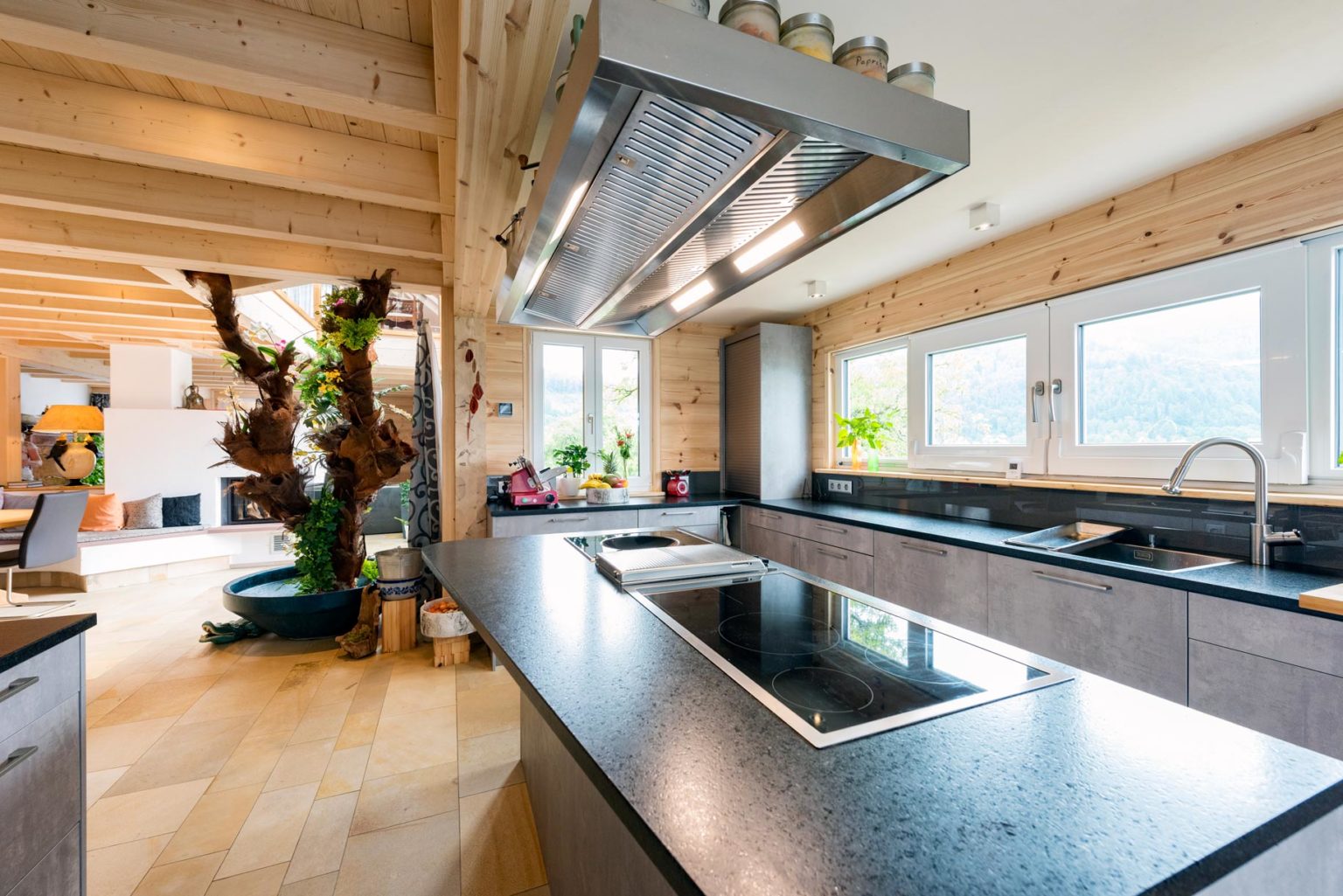 „Unser Berater hat sich komplett auf unsere Wünsche eingestellt, sowohl beim Grundriss als auch bei der Haustechnik. Fullwood konnte alles möglich machen, was wir uns vorstellten.“, betont Jürgen Braun. Im Nachhinein hätte er allerdings ein kleineres Fenster fürs Schlafzimmer gewählt; das jetzige ist bodentief und lässt zu viel vom ursprünglich favorisierten Tageslicht herein. Der Außenansicht kommt die Fensteraufteilung an der Giebelwand allerdings zugute, sieht sie doch sehr harmonisch aus. Apropos Giebel: Holzhaus „Hochrhein ist winkelförmig und besitzt entsprechend drei Giebel. „Durch den L-förmigen Hausgrundriss ergibt sich draußen ein geschützter Winkel, in dem wir unsere Terrasse untergebracht haben.“, freut sich Hausherrin Beate Braun. Des Weiteren war den Brauns ein firsthoher Luftraum über einem Teil des Wohnbereichs wichtig. Oben, im Dachgeschoss, wird die Deckenöffnung von einer gläsernen Brüstung mit Holzrahmen begrenzt. Direkt über der Öffnung befinden sich vier Lichtquadrate in der Dachschräge, die ein großes Dachfenster ergeben und reichlich natürliches Licht auf die Galerie (oben) und in den Wohnbereich (unten) hereinströmen lassen. Auch die Sollenhofer-Sandsteinfliesen, mit denen die Böden des gesamten Erdgeschosses verkleidet sind, betonen das helle Ambiente im Holzhaus.