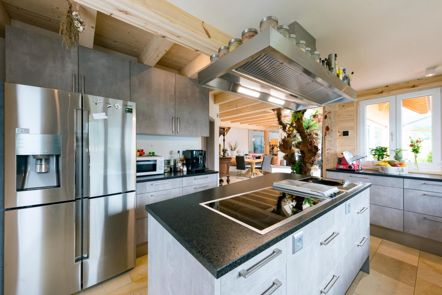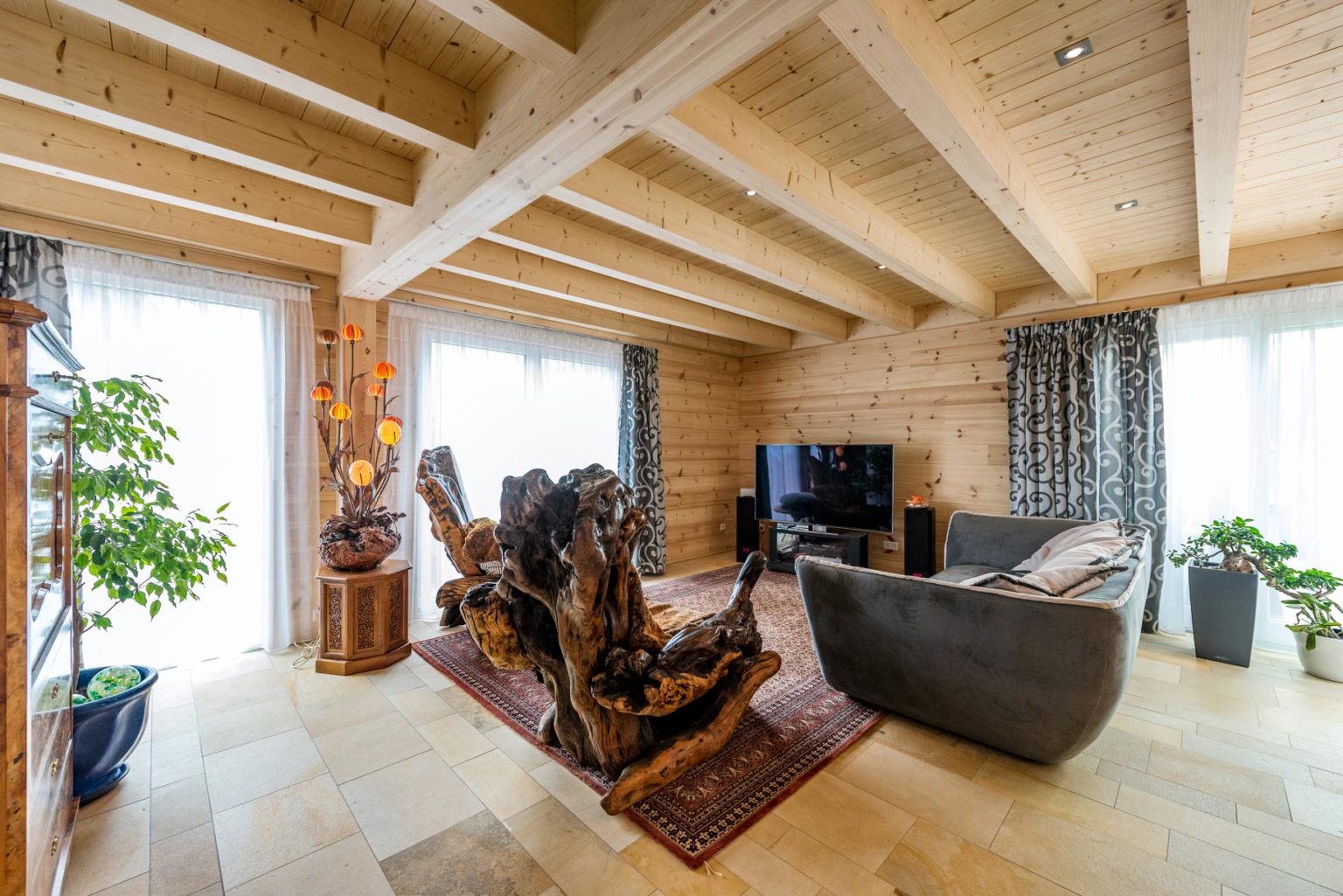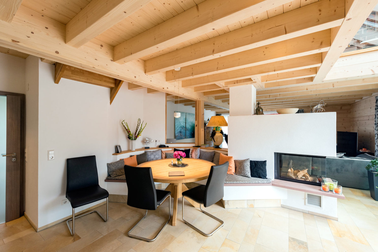 „Unser Berater hat sich komplett auf unsere Wünsche eingestellt, sowohl beim Grundriss als auch bei der Haustechnik. Fullwood konnte alles möglich machen, was wir uns vorstellten.“, betont Jürgen Braun. Im Nachhinein hätte er allerdings ein kleineres Fenster fürs Schlafzimmer gewählt; das jetzige ist bodentief und lässt zu viel vom ursprünglich favorisierten Tageslicht herein. Der Außenansicht kommt die Fensteraufteilung an der Giebelwand allerdings zugute, sieht sie doch sehr harmonisch aus. Apropos Giebel: Holzhaus „Hochrhein ist winkelförmig und besitzt entsprechend drei Giebel. „Durch den L-förmigen Hausgrundriss ergibt sich draußen ein geschützter Winkel, in dem wir unsere Terrasse untergebracht haben.“, freut sich Hausherrin Beate Braun. Des Weiteren war den Brauns ein firsthoher Luftraum über einem Teil des Wohnbereichs wichtig. Oben, im Dachgeschoss, wird die Deckenöffnung von einer gläsernen Brüstung mit Holzrahmen begrenzt. Direkt über der Öffnung befinden sich vier Lichtquadrate in der Dachschräge, die ein großes Dachfenster ergeben und reichlich natürliches Licht auf die Galerie (oben) und in den Wohnbereich (unten) hereinströmen lassen. Auch die Sollenhofer-Sandsteinfliesen, mit denen die Böden des gesamten Erdgeschosses verkleidet sind, betonen das helle Ambiente im Holzhaus.