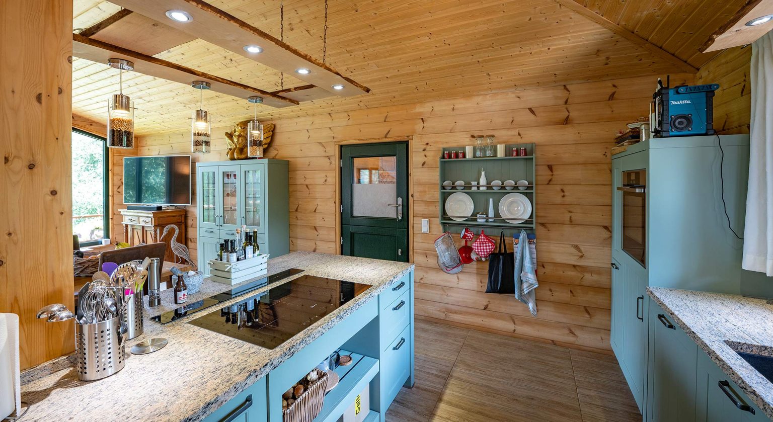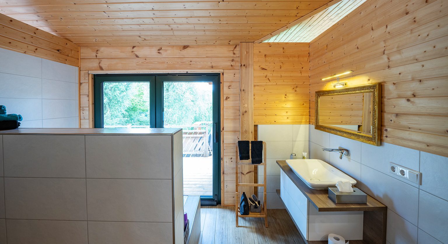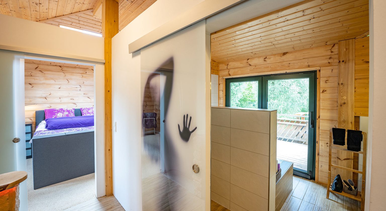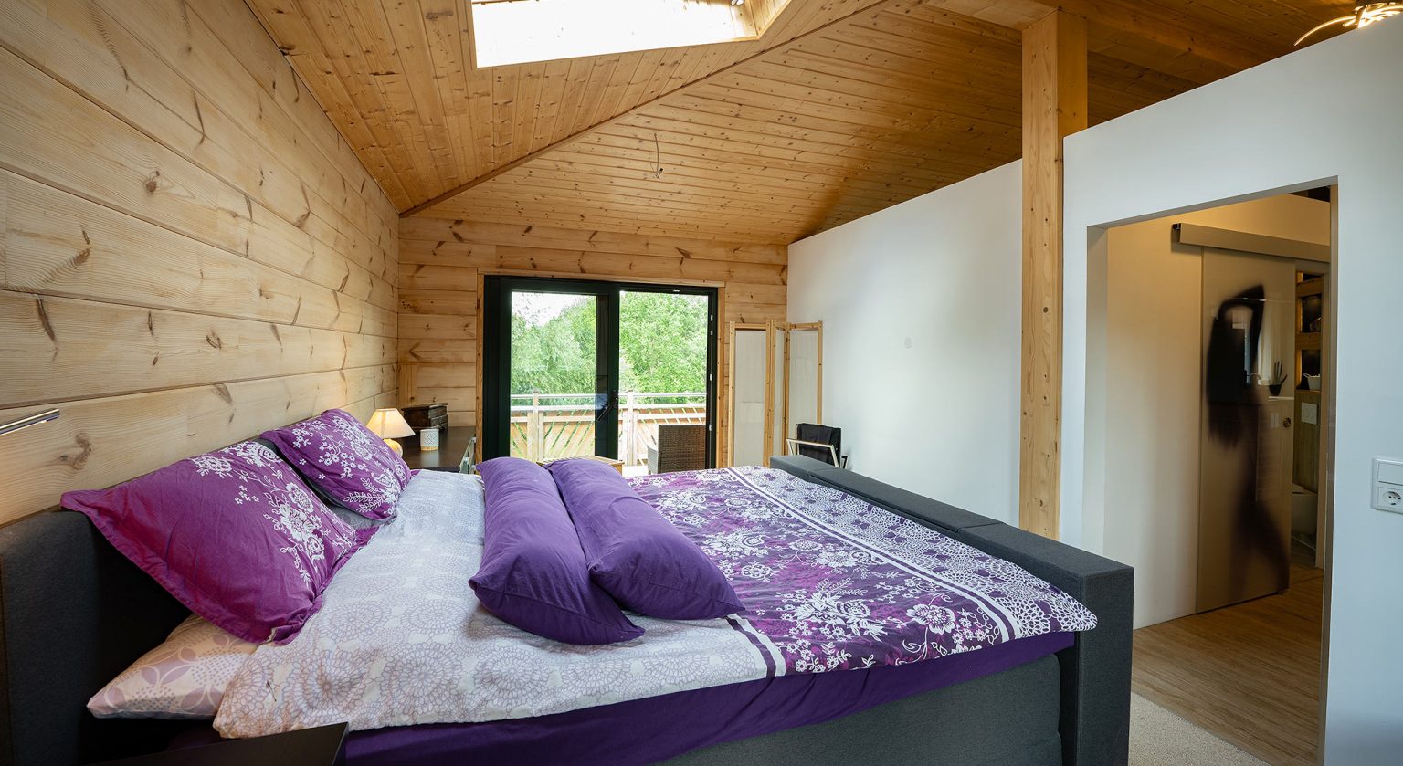 Obwohl sich die Eigentümer für eine Richtmeistermontage mit viel Eigenleistung entschieden hatten, konnten sie bereits nach einem halben Jahr ab Lieferung in ihr Holzhaus einziehen. „Unser Holzhaus wurde in wenigen Wandelementen und passgenau zugeschnittenen Dachbalken am 13.06. geliefert und am 18.06. konnten wir schon Richtfest feiern.“, erinnert sich Sylvia. Beim Hausbau und Innenausbau halfen einige Freunde mit, die Holzhaus Montage geschah unter der Regie und Vorarbeit des Richtmeisters von Fullwood. Probleme gab es keine. Beheizt wird Holzhaus „Hoffmanns am See“ über eine Fußbodenheizung mit Gas. „Als Bodenbelag haben wir Marmorsplit ausgesucht. Der ist super geeignet dafür.“, fährt der Hausherr fort. Überhaupt haben er und seine Frau sehr viel Kreativität und Individualität in ihr Zweipersonenhaus einfließen lassen. „Wir fühlen uns rundum wohl und sind sehr zufrieden mit allem. Im Außenbereich gibt es noch einiges zu tun, aber das machen wir nach und nach.“, verabschieden sich die Hoffmanns.
