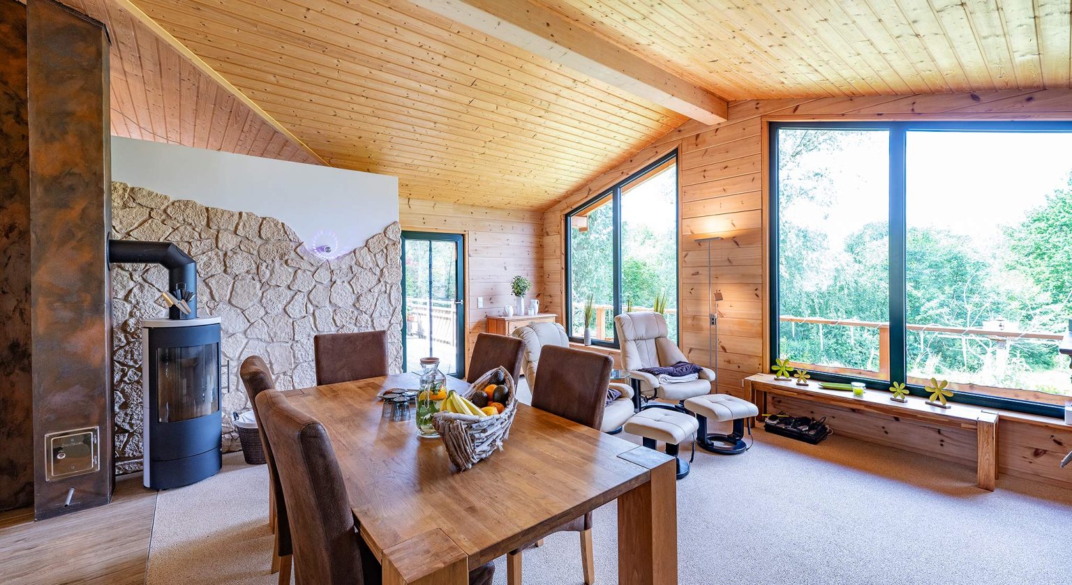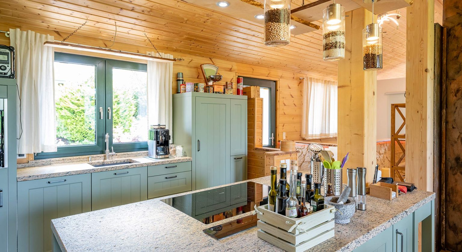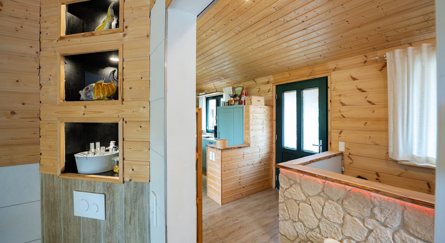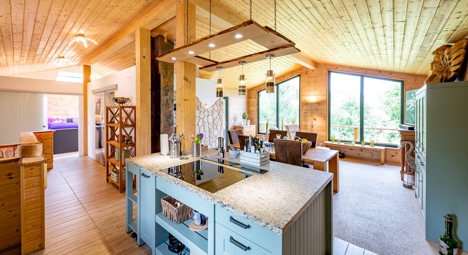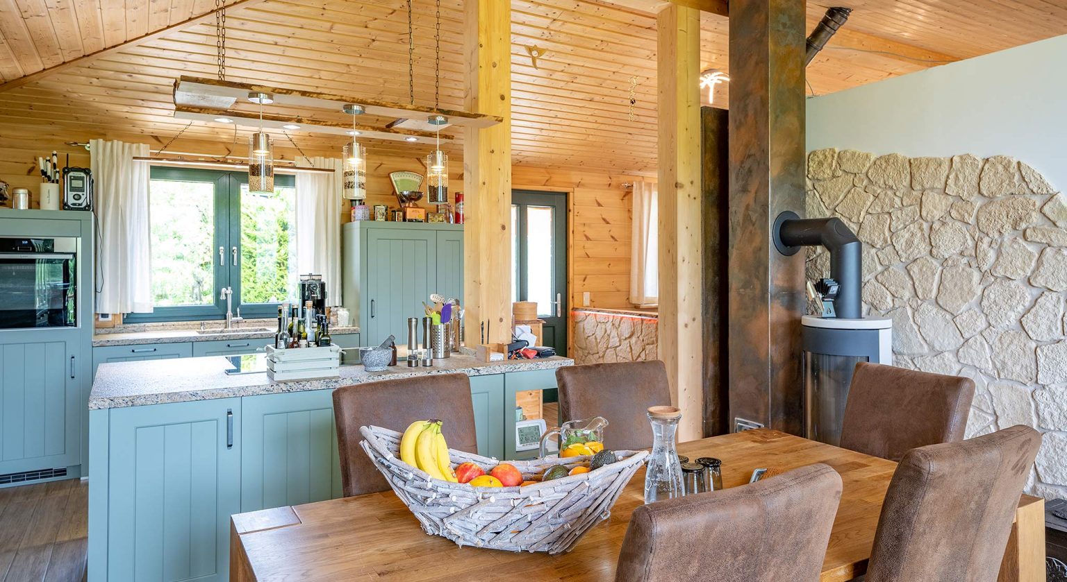 Obwohl sich die Eigentümer für eine Richtmeistermontage mit viel Eigenleistung entschieden hatten, konnten sie bereits nach einem halben Jahr ab Lieferung in ihr Holzhaus einziehen. „Unser Holzhaus wurde in wenigen Wandelementen und passgenau zugeschnittenen Dachbalken am 13.06. geliefert und am 18.06. konnten wir schon Richtfest feiern.“, erinnert sich Sylvia. Beim Hausbau und Innenausbau halfen einige Freunde mit, die Holzhaus Montage geschah unter der Regie und Vorarbeit des Richtmeisters von Fullwood. Probleme gab es keine. Beheizt wird Holzhaus „Hoffmanns am See“ über eine Fußbodenheizung mit Gas. „Als Bodenbelag haben wir Marmorsplit ausgesucht. Der ist super geeignet dafür.“, fährt der Hausherr fort. Überhaupt haben er und seine Frau sehr viel Kreativität und Individualität in ihr Zweipersonenhaus einfließen lassen. „Wir fühlen uns rundum wohl und sind sehr zufrieden mit allem. Im Außenbereich gibt es noch einiges zu tun, aber das machen wir nach und nach.“, verabschieden sich die Hoffmanns.