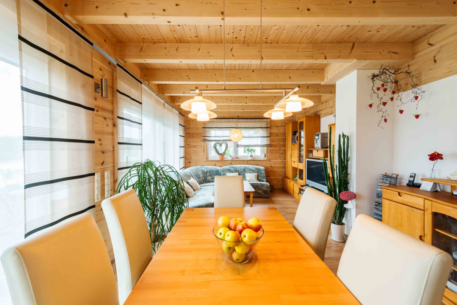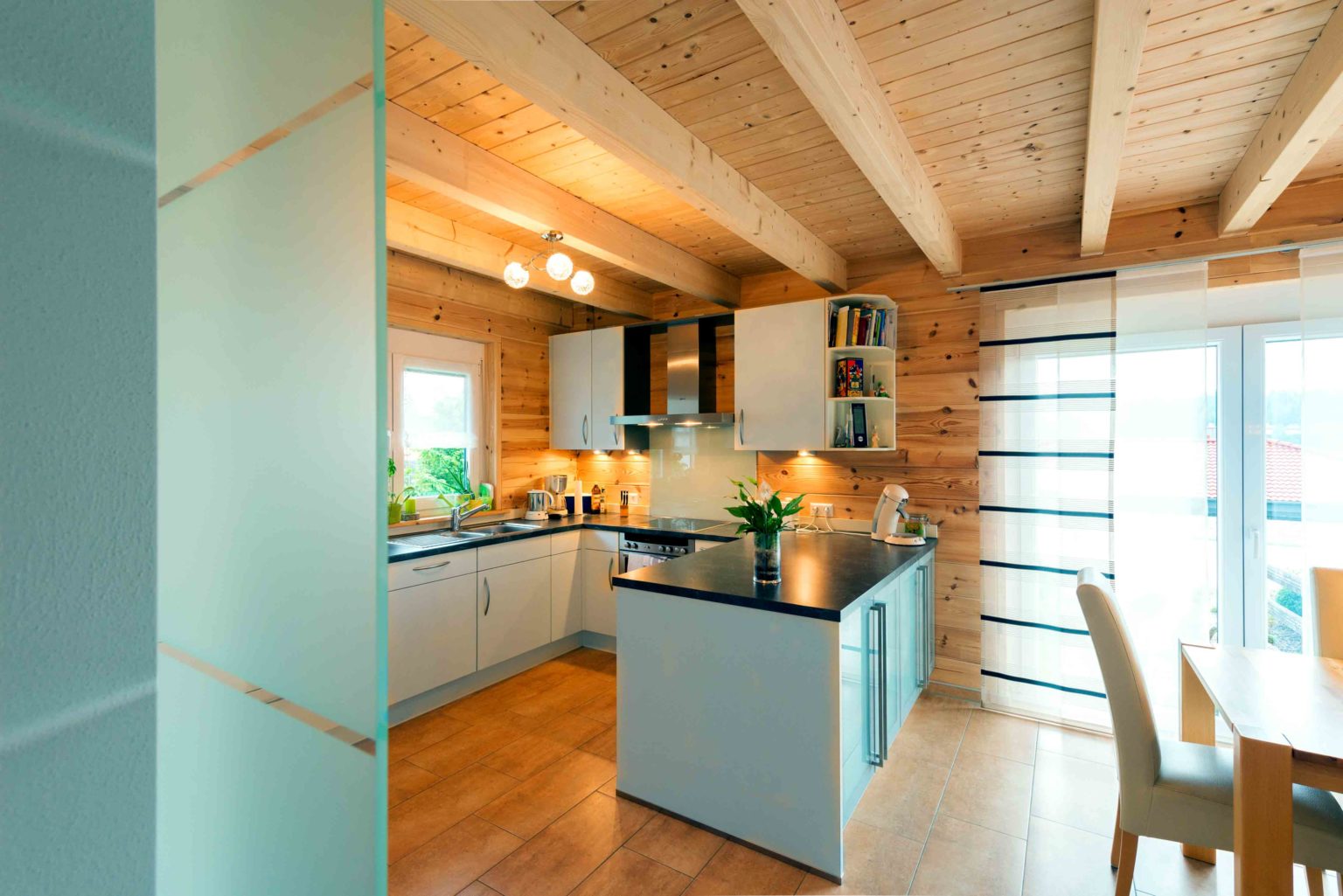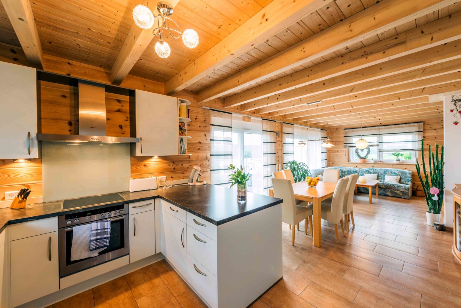 Um die Kosten überschaubar zu halten, entschied sich die Familie für eine Richtmeistermontage und half beim Hausaufbau sehr viel mit. Unterstützt wurden sie dabei vom Bruder des Bauherrn und von einigen Freunden. Die tatkräftige Dame des Hauses strich die hellen Kiefernwände innen eigenhändig mit UV-Schutz, der ein Nachdunkeln verhindert, und außen mit Witterungsschutz (im Farbton „Kiefer“), der einer Vergrauung entgegenwirkt. Bis auf die Fliesenlegerarbeiten, die Hauselektrik und die Sanitärinstallationen machte das Ehepaar auch beim Innenausbau alles selbst. Außerdem bauten sie einen Carport an ihr Holzhaus, der das gleiche rote Tonziegeldach erhielt. Auch die Holzbalken wurden in derselben Farbe wie das Wohngebäude gestrichen. Heute fühlt sich das fleißige Ehepaar sehr verwachsen mit seinem individuellen Holzhaus und kennt es in- und auswendig. Auch die Wertschätzung gegenüber ihrem Eigenheim ist besonders hoch, da man genau weiß, was drinsteckt. Geheizt wird mit Gas, und in den Übergangszeiten und an sonnigen Wintertagen mit solar erwärmten Wasser (Fußbodenheizung). Eine Zisterne fängt das Regenwasser auf und bewässert damit den Garten, wenn es trocken ist.
