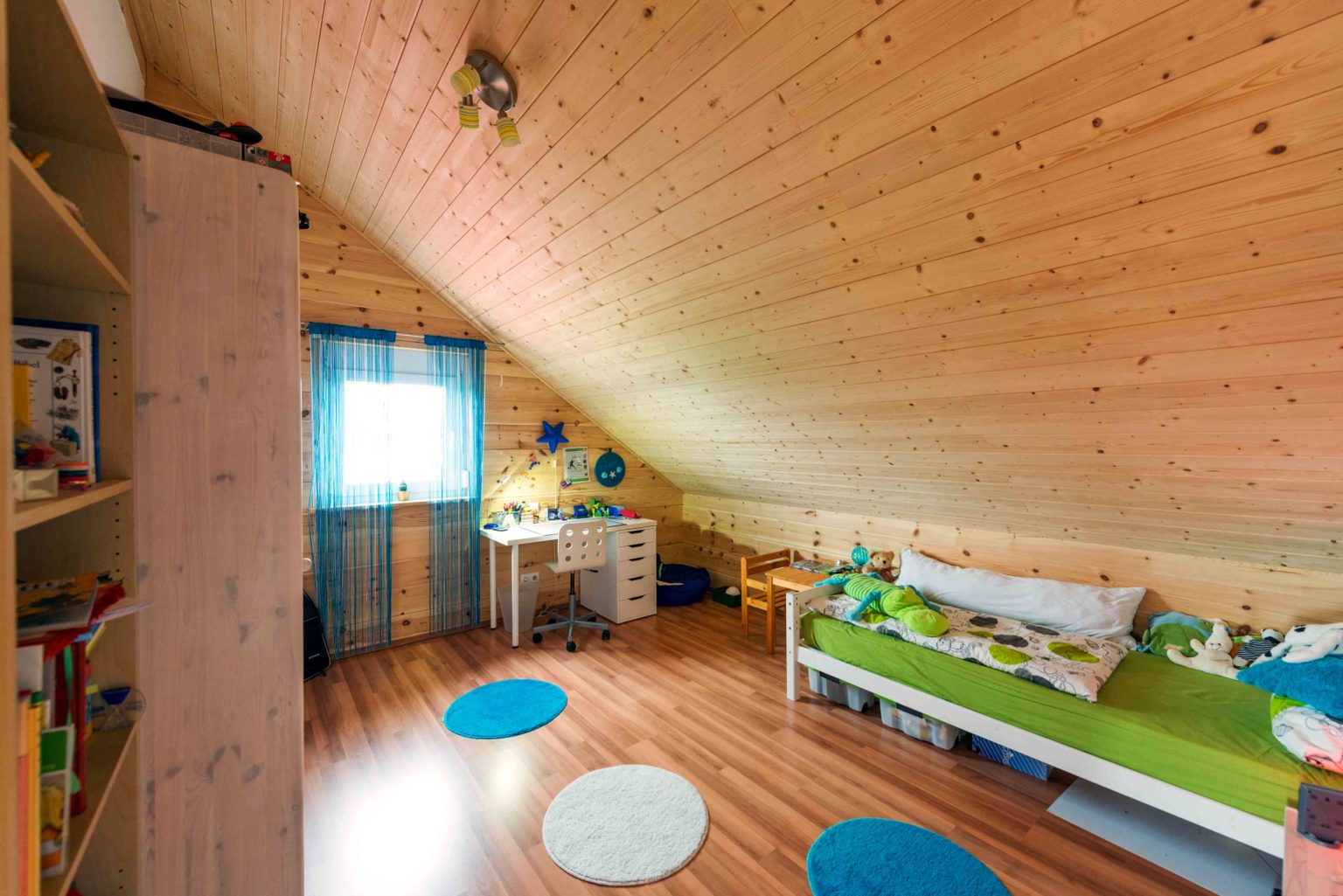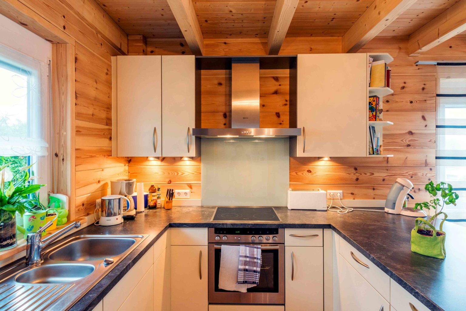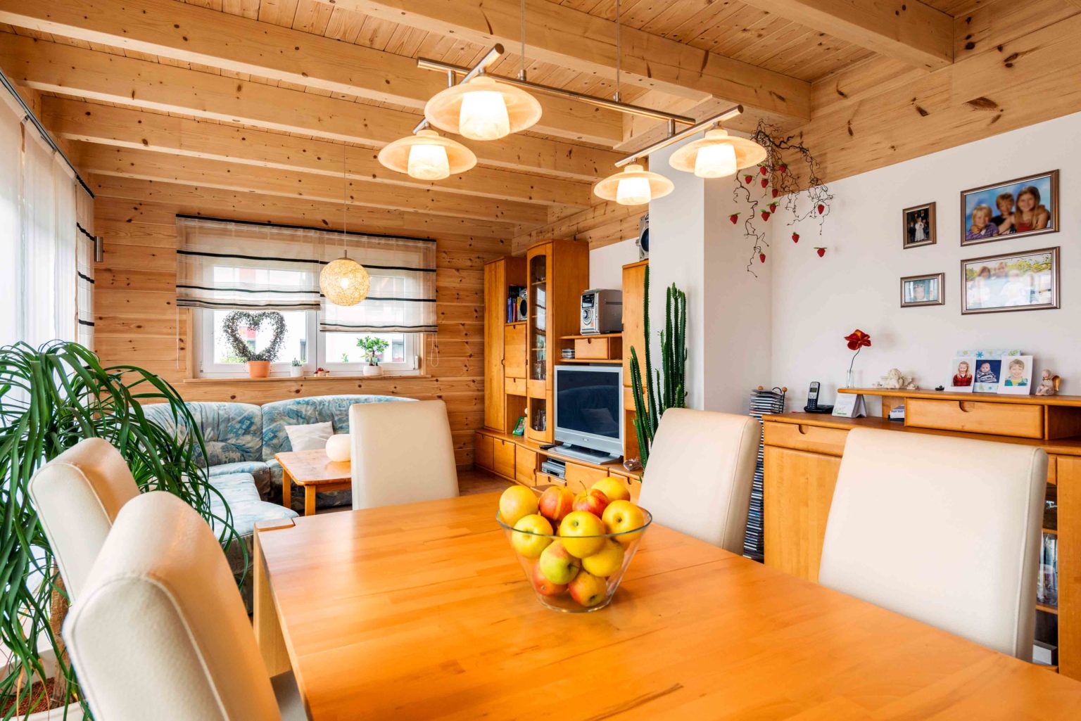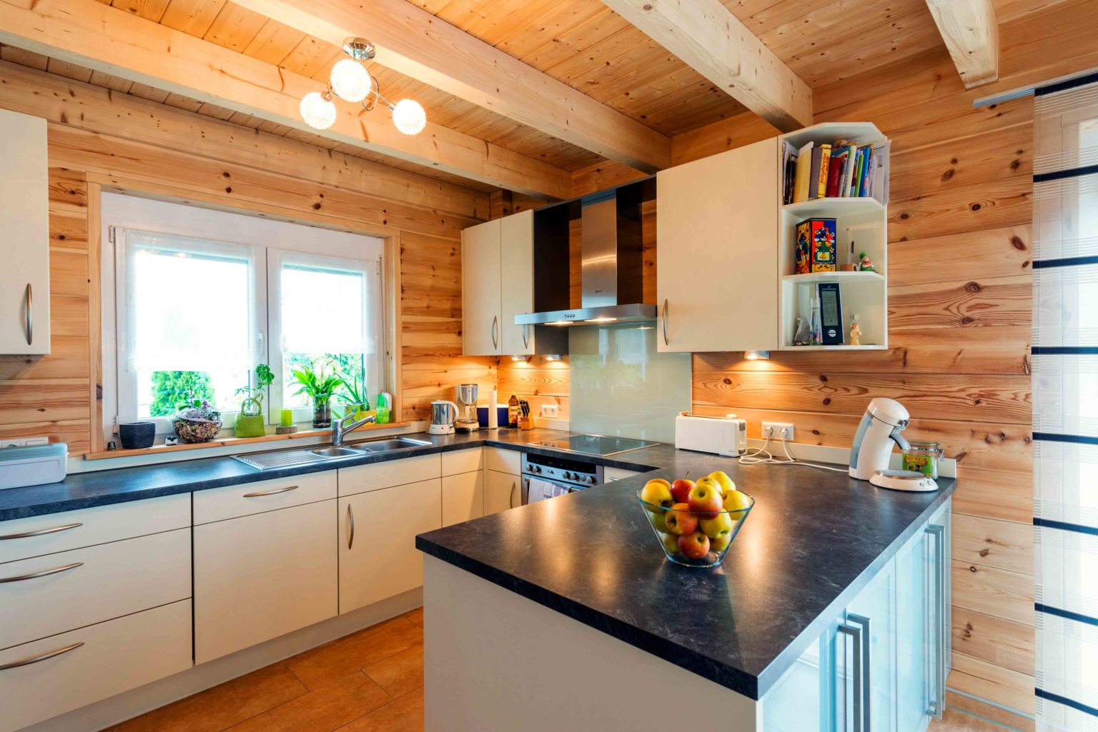 Um die Kosten überschaubar zu halten, entschied sich die Familie für eine Richtmeistermontage und half beim Hausaufbau sehr viel mit. Unterstützt wurden sie dabei vom Bruder des Bauherrn und von einigen Freunden. Die tatkräftige Dame des Hauses strich die hellen Kiefernwände innen eigenhändig mit UV-Schutz, der ein Nachdunkeln verhindert, und außen mit Witterungsschutz (im Farbton „Kiefer“), der einer Vergrauung entgegenwirkt. Bis auf die Fliesenlegerarbeiten, die Hauselektrik und die Sanitärinstallationen machte das Ehepaar auch beim Innenausbau alles selbst. Außerdem bauten sie einen Carport an ihr Holzhaus, der das gleiche rote Tonziegeldach erhielt. Auch die Holzbalken wurden in derselben Farbe wie das Wohngebäude gestrichen. Heute fühlt sich das fleißige Ehepaar sehr verwachsen mit seinem individuellen Holzhaus und kennt es in- und auswendig. Auch die Wertschätzung gegenüber ihrem Eigenheim ist besonders hoch, da man genau weiß, was drinsteckt. Geheizt wird mit Gas, und in den Übergangszeiten und an sonnigen Wintertagen mit solar erwärmten Wasser (Fußbodenheizung). Eine Zisterne fängt das Regenwasser auf und bewässert damit den Garten, wenn es trocken ist.
