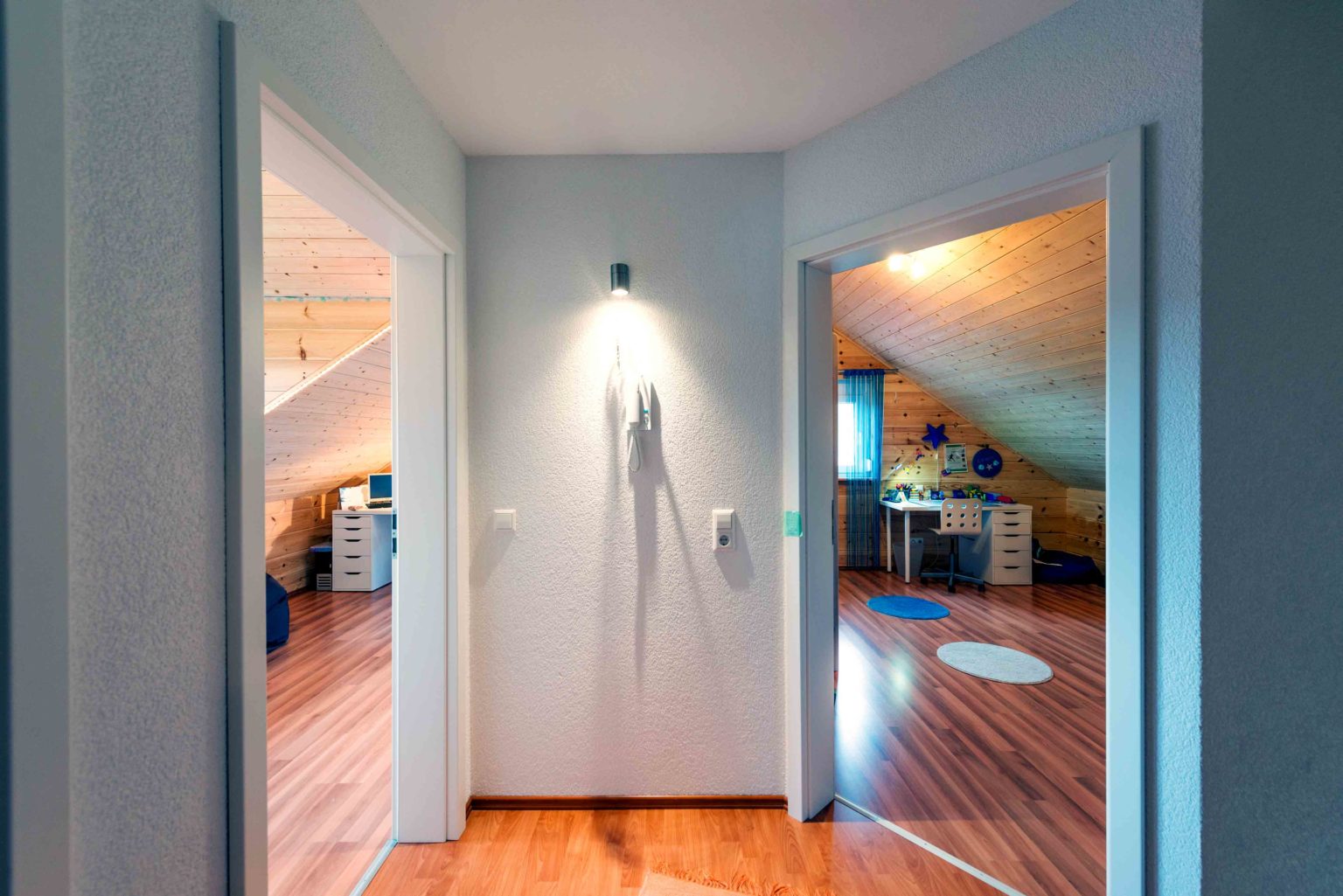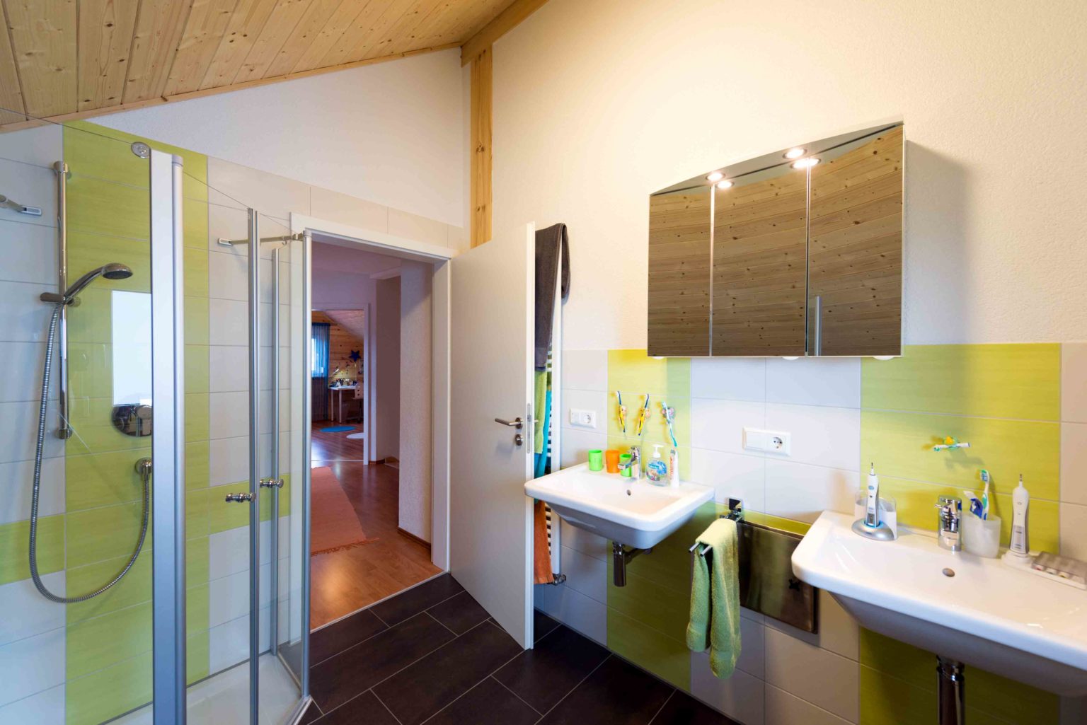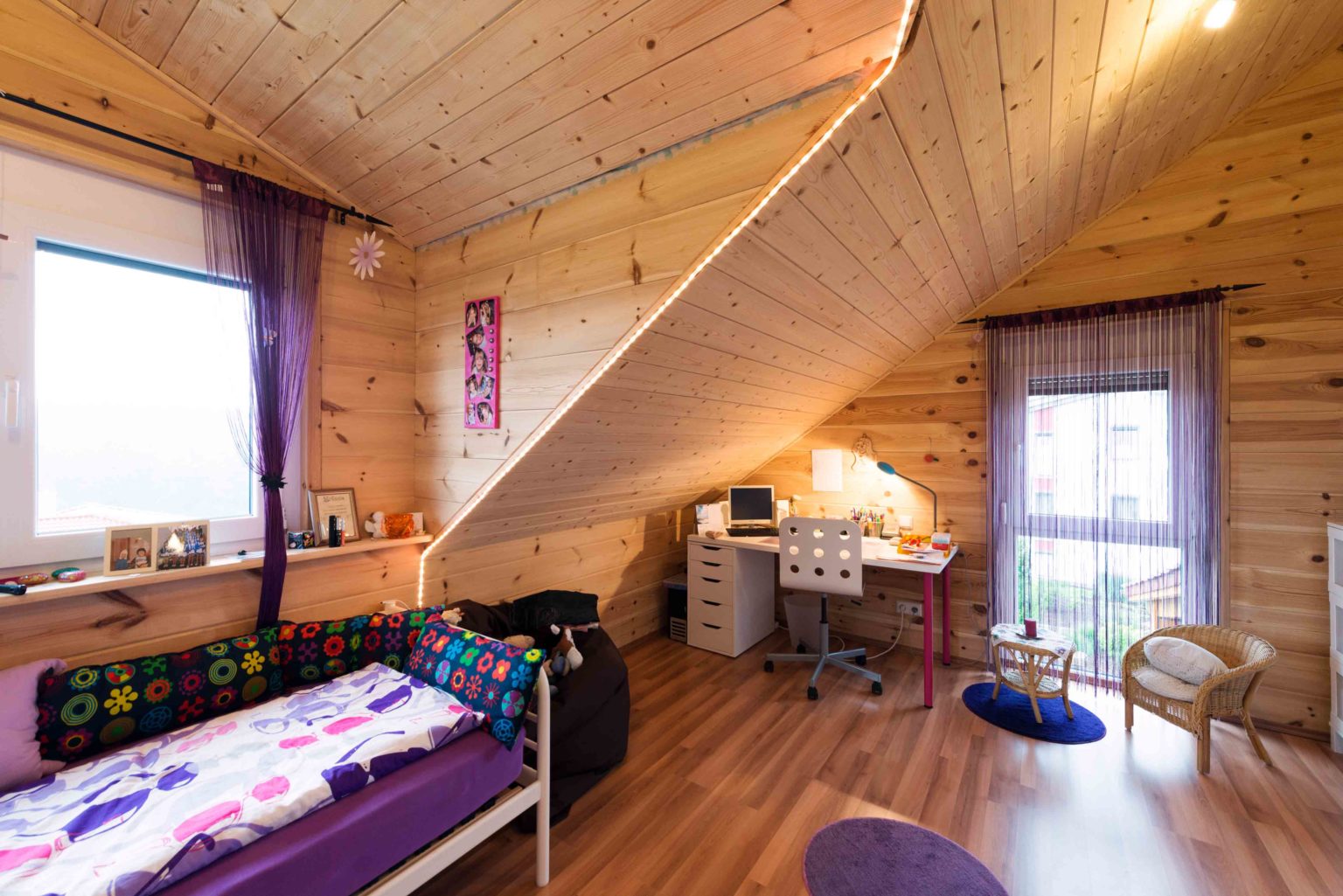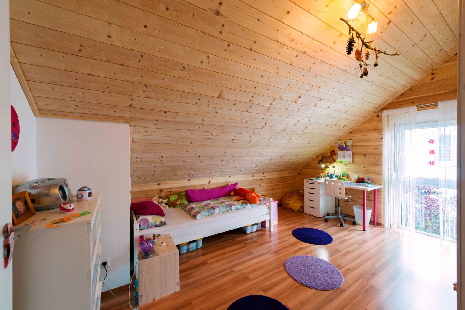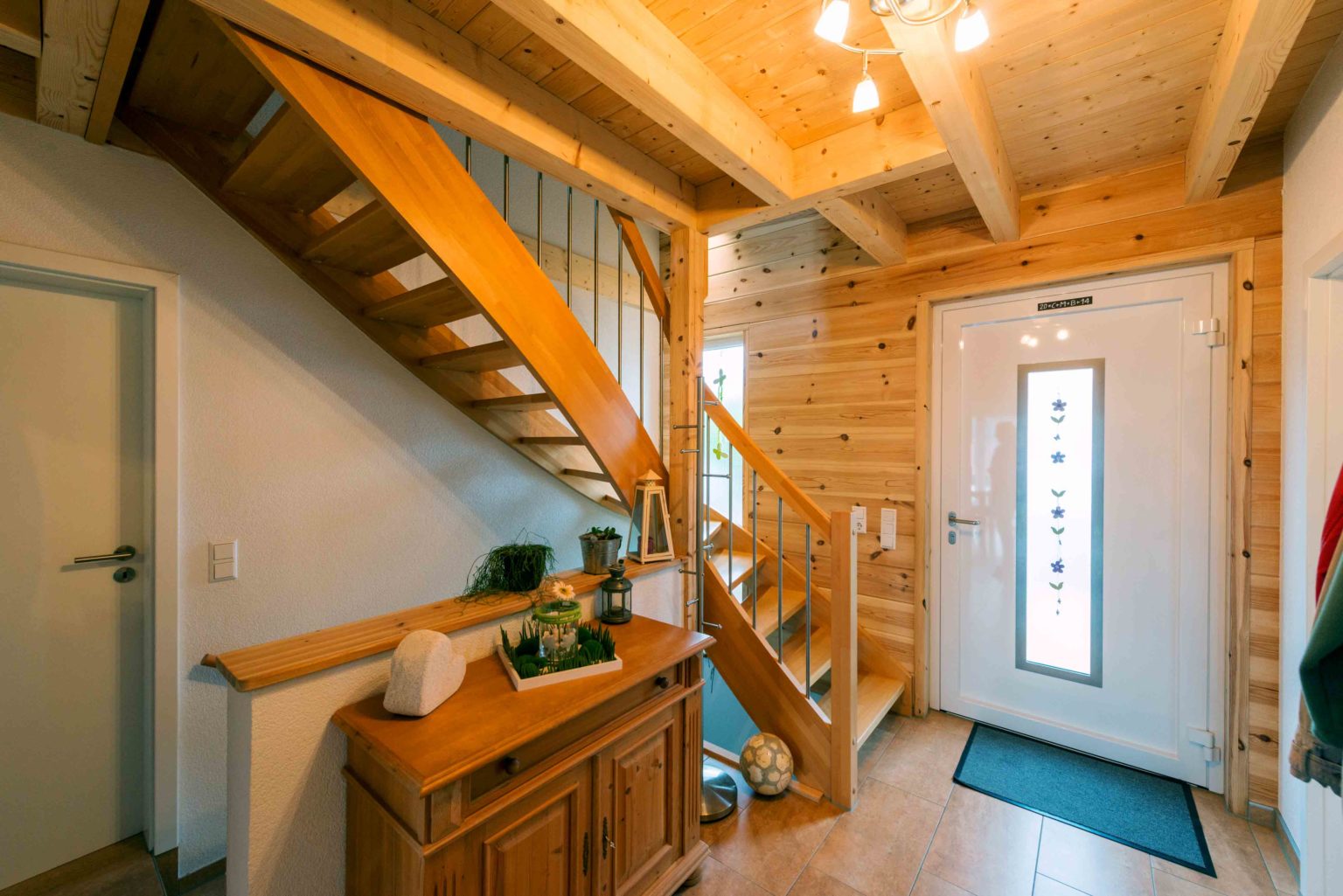 Im Wohnalltag schätzt die Hausherrin besonders das angenehme Wohnklima ihres Hauses. Auch über den zarten Kiefernduft freut sie sich täglich. Für reichlich natürlichen Lichteinfall – also die erwünschte Helligkeit - sorgen viele, teils bodentiefe Fenster. Mit weißem Streichputz versehene Trennwände (Ständerbau), weiße Fensterrahmen (außen sind sie dunkelgrau, wie die Haustüre auch), eine Glasschiebetür zwischen Diele und Wohnbereich, weiße Zimmertüren und helles Mobiliar sorgen ebenso für ein helles Ambiente, ganz nach dem Geschmack der Hausfrau. Die Böden – im Erdgeschoss sind es Fließen, im Dachgeschoss Parkett – passen farblich genau zu den Holzwänden und der offenen Holzbalkendecke. Die Dachschrägen wurden mit hellen Kiefernlatten verschalt und die Decke im Dachgeschossflur weiß tapeziert. Alle fünf Familienmitglieder fühlen sich sehr wohl in ihrem gemütlichen und zeitgemäßen Eigenheim.