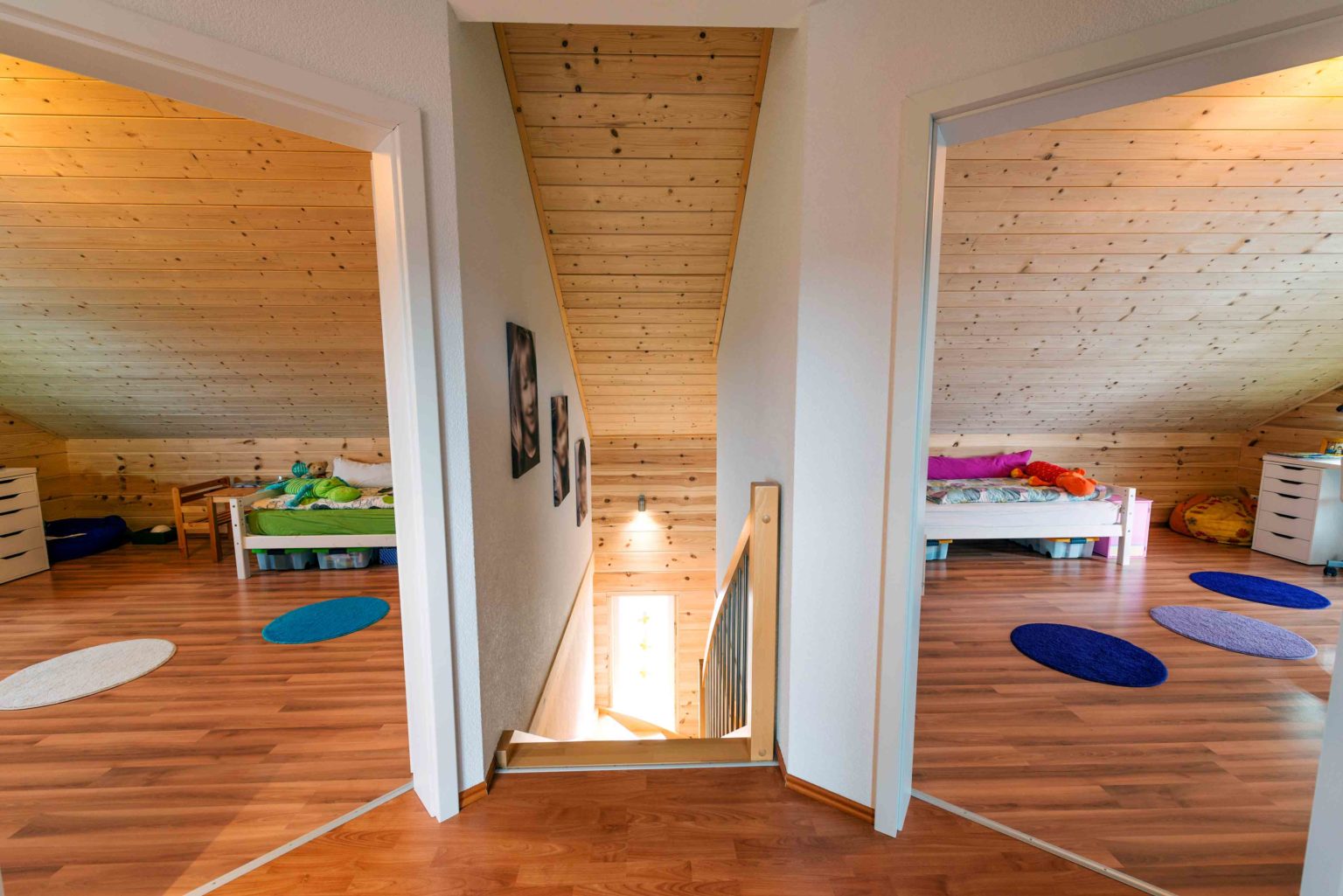 Das knapp 80m² umfassende Erdgeschoss von Holzhaus "Hohenberg" wird zur Hälfte vom offenen Wohn/Ess/Koch-Bereich eingenommen, wo das gemeinsame Familienleben stattfindet. Die andere Hälfte nehmen eine geräumige Diele mit Treppenaufgang ins Dachgeschoss, eine Gäste-Dusche/WC, ein Abstellraum und das Schlafzimmer der Eltern ein. Unterm Dach befinden sich die privaten Rückzugsorte der Kinder, nämlich drei Kinderzimmer, ein großes Familienbadezimmer und ein kleines Arbeitszimmer, die alle von einem kleinen Flur aus erreichbar sind. Eine große Dachgaube sorgt in den zwei etwas kleiner bemessenen Kinderzimmern für genug Platz. Ursprünglich sollte das Schlafzimmer der Eltern ebenfalls im Dachgeschoss sein, aber dadurch wäre der Flur sehr klein geworden. Also verlegte man während der Bauphase einfach das Schlafzimmer ins Arbeitszimmer im Erdgeschoss, und das Arbeitszimmer nach oben, wo man den Raum zugunsten des Flurs verkleinerte. Durch die flexiblen Trennwände war das überhaupt kein Problem! Im Sommer hält sich die Familie am liebsten auf der Terrasse und im Garten auf, wohnen und essen werden dann nach draußen verlegt.