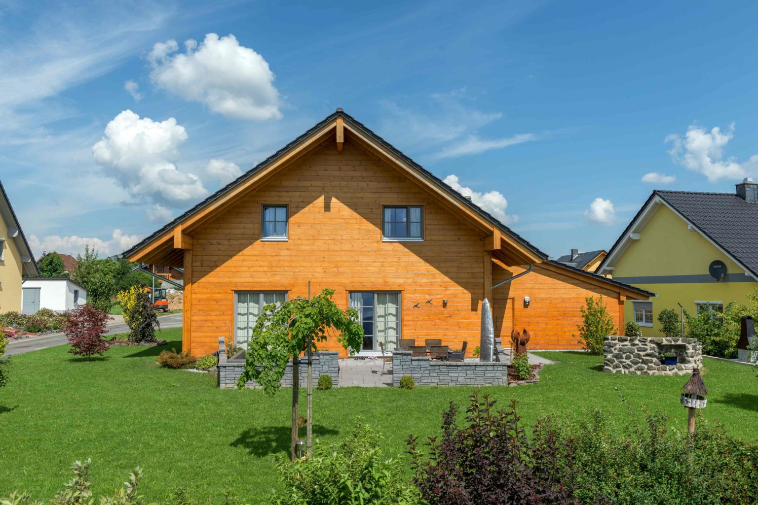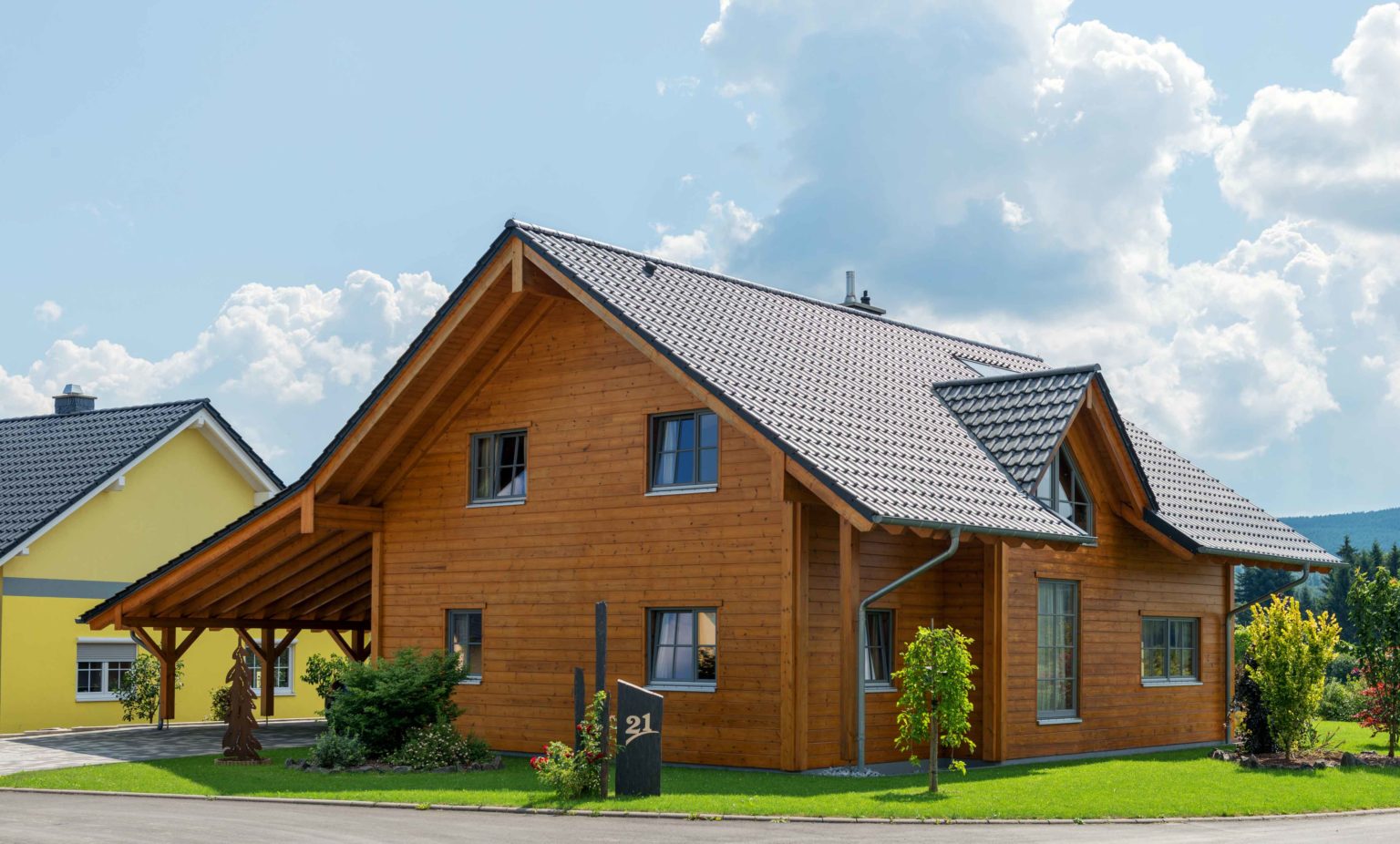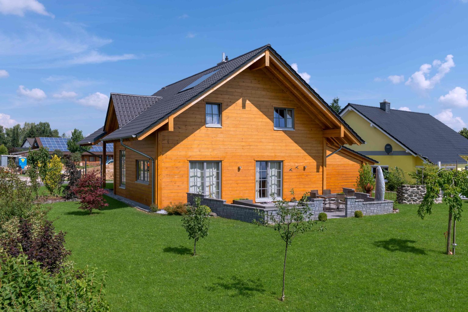 Ein Schutzanstrich verhindert, dass Holzhaus "Hunsrück" eine unerwünschte Vergrauung der Fassade. Sehr wohl erwünscht ist hellgrau, aber bei den Fensterrahmen und bei dem farblich darauf abgestimmten Satteldach mit Tonziegeln gibt anthrazit den Ton an. Diese ”Farben“ unterstreichen, dass dieses Holzhaus modern ist und lassen das Honiggelb umso mehr leuchten.