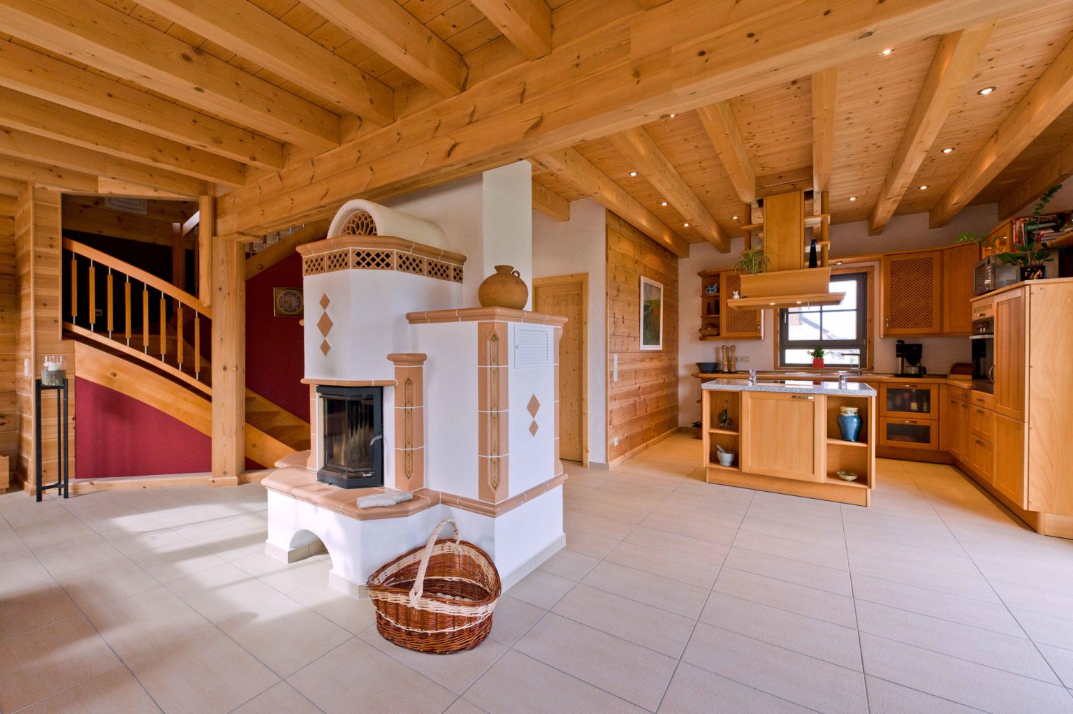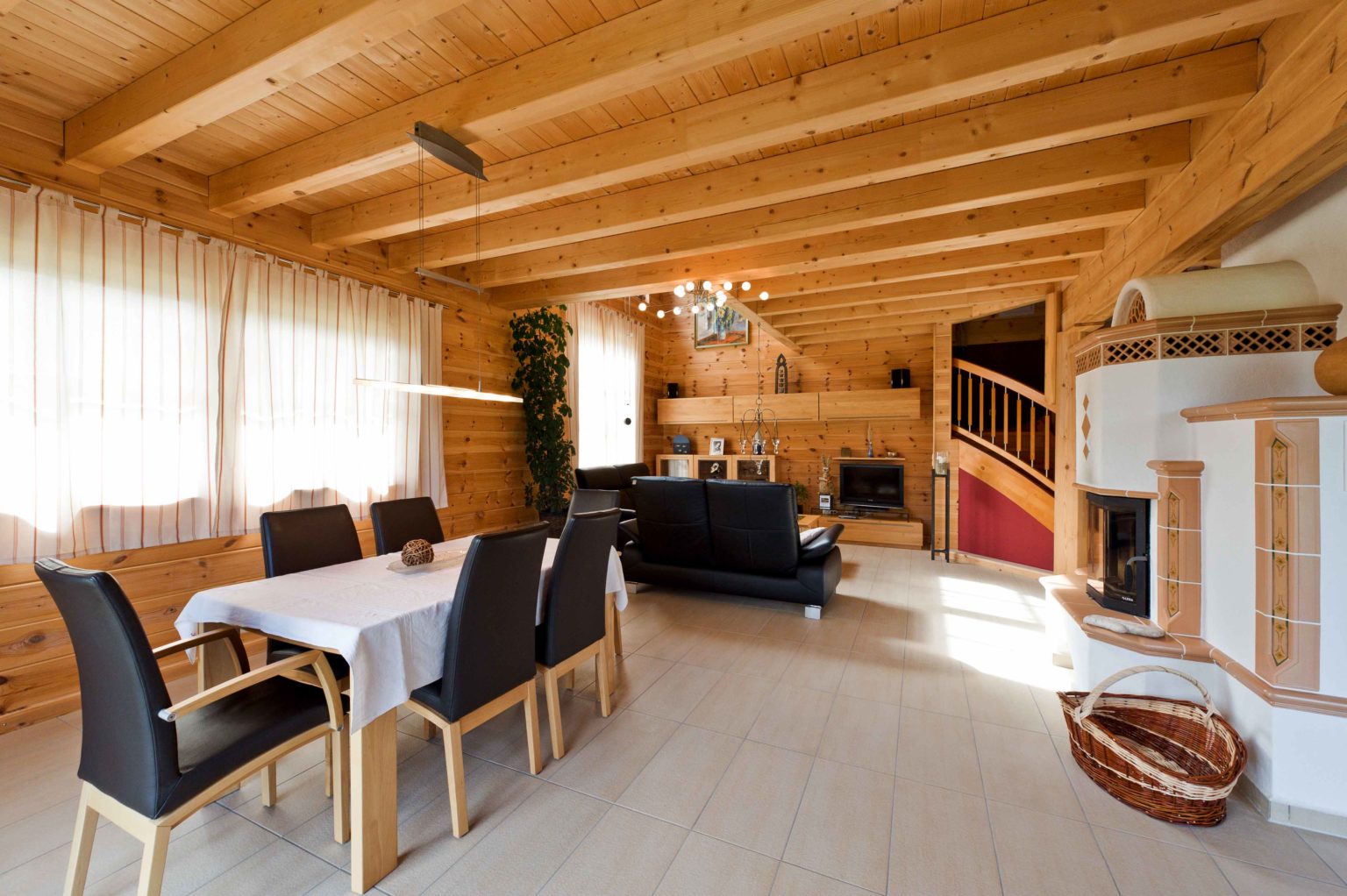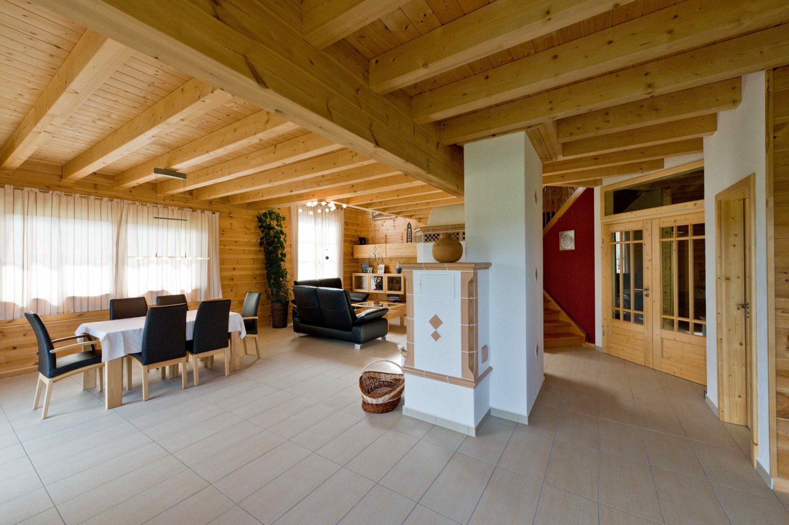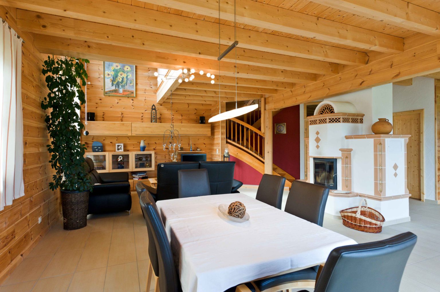 Weitläufig und hell stellt sich das Erdgeschoss vor. Eine große, repräsentative Diele empfängt Bewohner und Besucher. Von hier gelangt man in die Gästetoilette sowie ins Arbeitszimmer und in den großzügigen offenen Wohnbereich. Dort gehen Küche, Essbereich und Sofaecke ineinander über. In der Mitte des Raumes thront ausladend der Kachelofen an einer weiß verputzten Kaminwand und sorgt nicht nur für gemütliche Wärme, sondern dient auch als Raumteiler und Sichtschutz. Der hell geflieste Boden betont die Weite und Helligkeit des Raumes. Weiß verputzte Ständerbauwände lockern die schweren Holzbohlenwände auf und unterstreichen die Modernität des Holzhauses auch im Innern. Ebenfalls großzügig dimensioniert schwingt sich eine breite Holztreppe hinauf ins Obergeschoss. Die Wände des Treppenaufgangs sind in warmem dunkelrot gestrichen, genau wie eine Wand in der Eingangshalle. Als roter Faden leiten diese Wände von der Diele in den Wohnraum und von dort hinauf zur Galerie, von der man ins große Badezimmer, ins Schlafzimmer, ins Gästezimmer und in ein zweites Arbeitszimmer gelangt. Klare Linien beherrschen auch die qualitativ hochwertigen, soliden, eher schweren Möbel im zeitlosen Stiel.