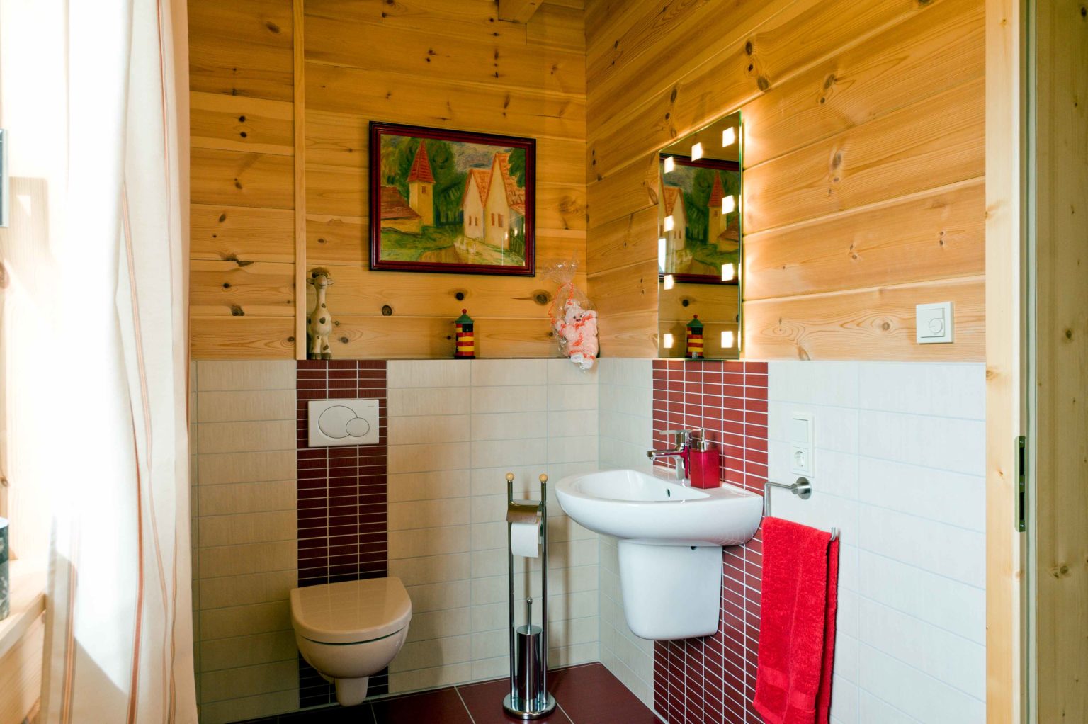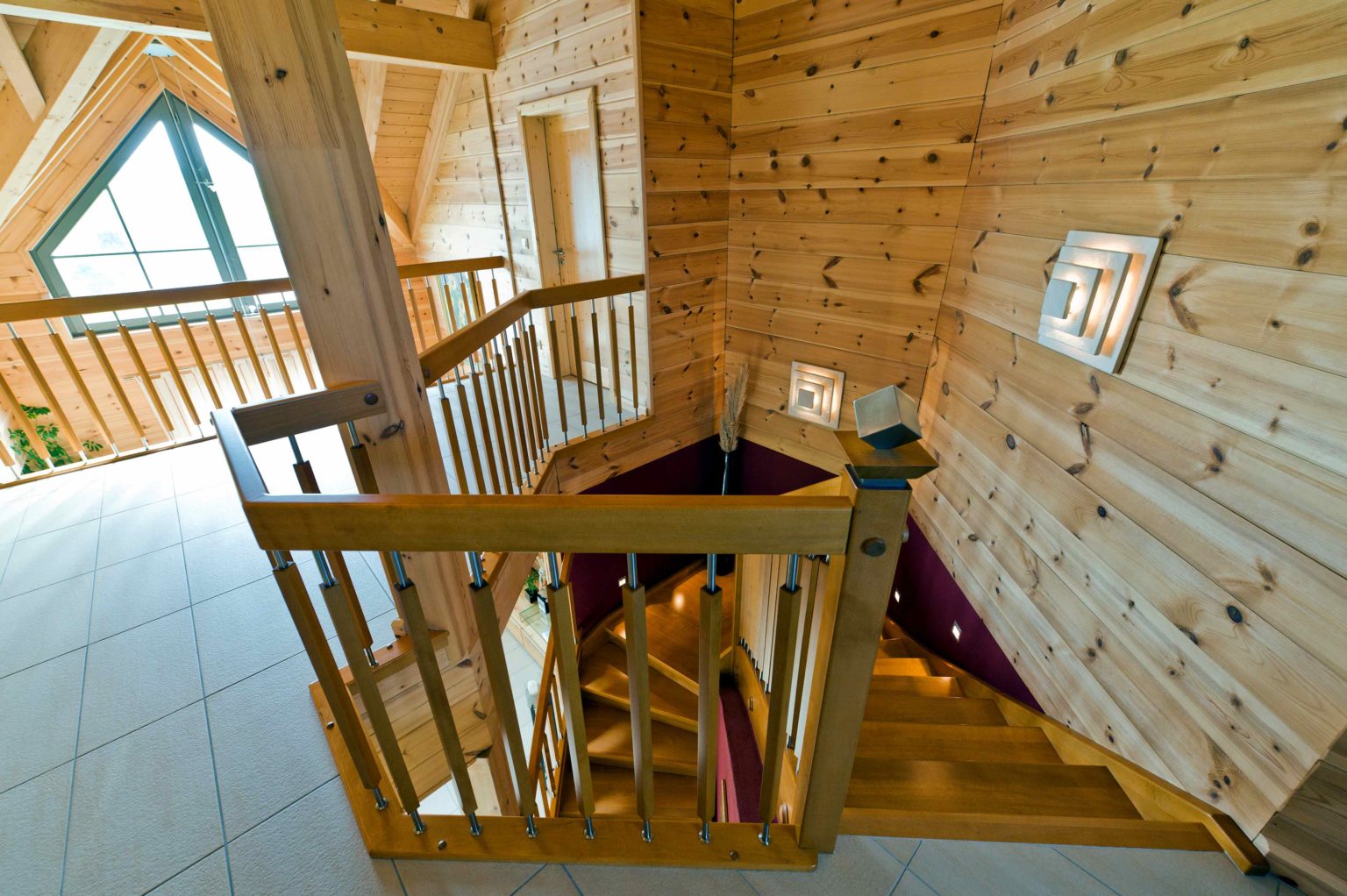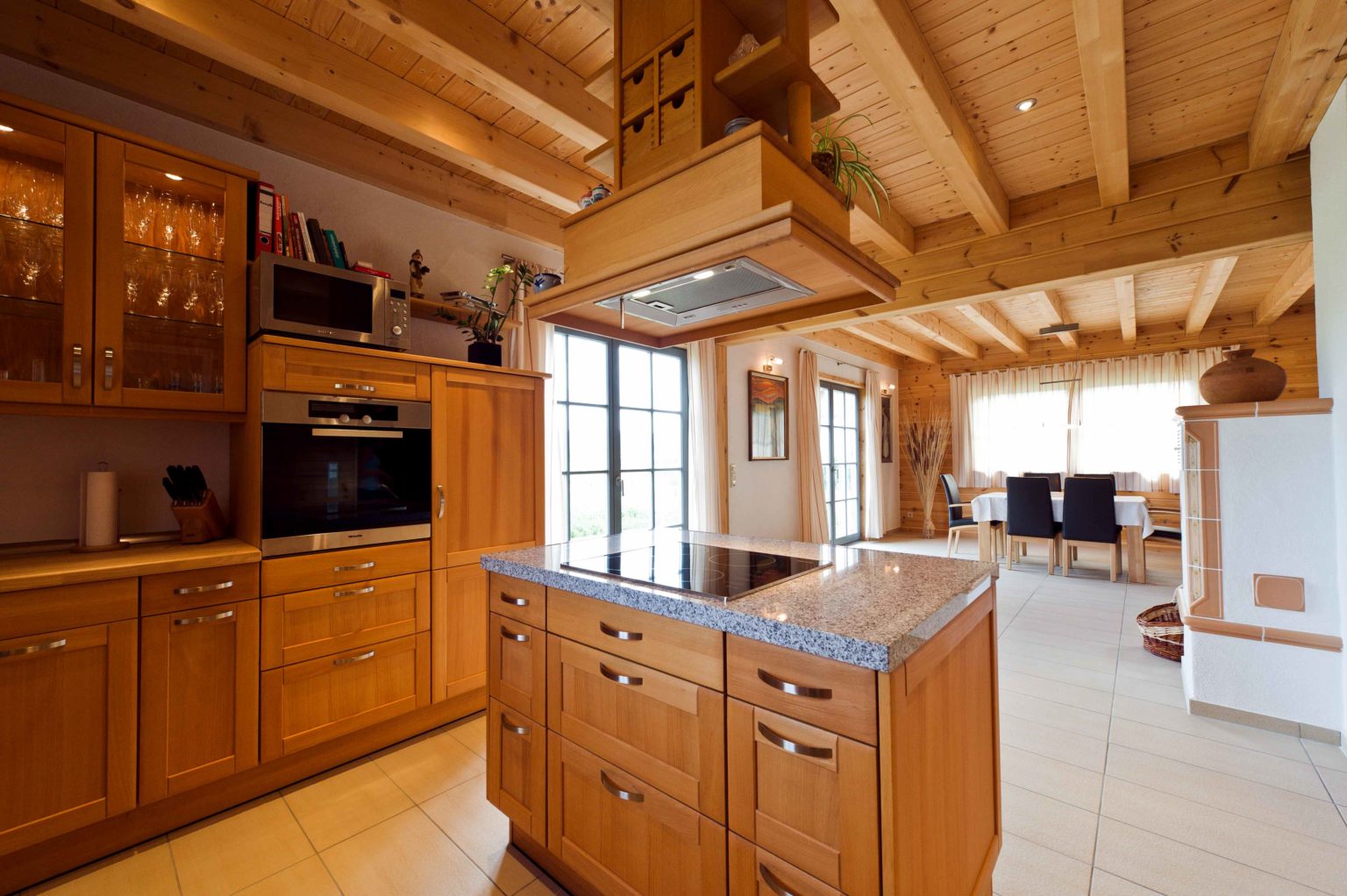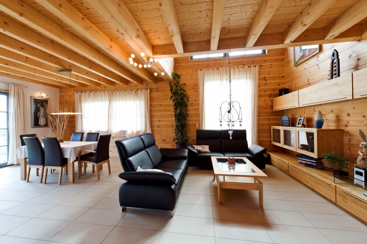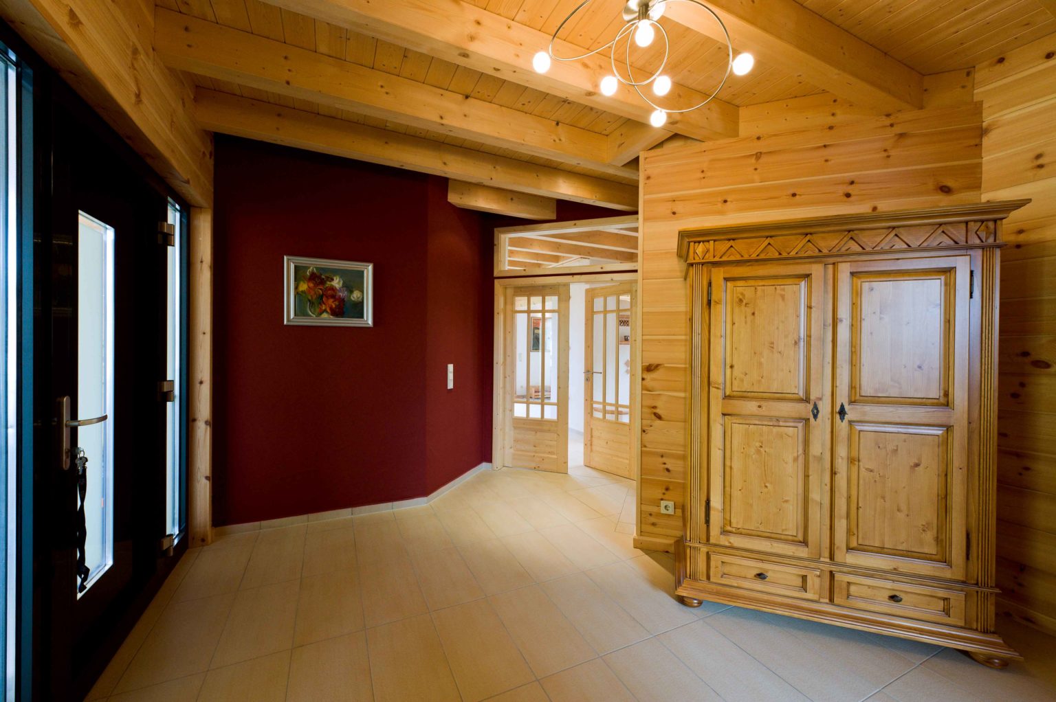 Weitläufig und hell stellt sich das Erdgeschoss vor. Eine große, repräsentative Diele empfängt Bewohner und Besucher. Von hier gelangt man in die Gästetoilette sowie ins Arbeitszimmer und in den großzügigen offenen Wohnbereich. Dort gehen Küche, Essbereich und Sofaecke ineinander über. In der Mitte des Raumes thront ausladend der Kachelofen an einer weiß verputzten Kaminwand und sorgt nicht nur für gemütliche Wärme, sondern dient auch als Raumteiler und Sichtschutz. Der hell geflieste Boden betont die Weite und Helligkeit des Raumes. Weiß verputzte Ständerbauwände lockern die schweren Holzbohlenwände auf und unterstreichen die Modernität des Holzhauses auch im Innern. Ebenfalls großzügig dimensioniert schwingt sich eine breite Holztreppe hinauf ins Obergeschoss. Die Wände des Treppenaufgangs sind in warmem dunkelrot gestrichen, genau wie eine Wand in der Eingangshalle. Als roter Faden leiten diese Wände von der Diele in den Wohnraum und von dort hinauf zur Galerie, von der man ins große Badezimmer, ins Schlafzimmer, ins Gästezimmer und in ein zweites Arbeitszimmer gelangt. Klare Linien beherrschen auch die qualitativ hochwertigen, soliden, eher schweren Möbel im zeitlosen Stiel.