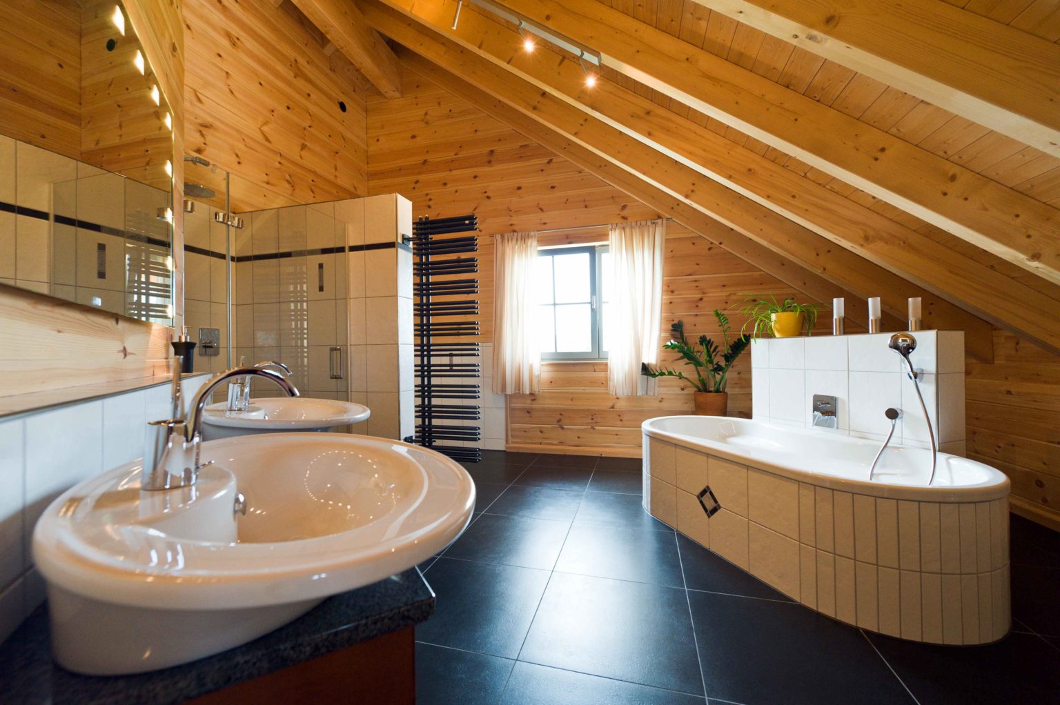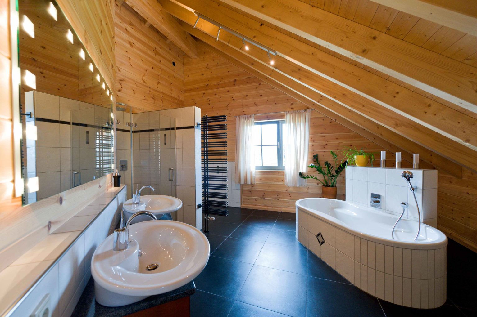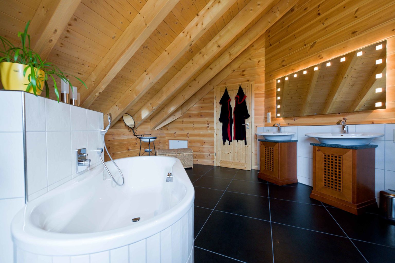 Über der Sofaecke, die sich unterm Zwerchgiebel befindet, öffnet sich die Holzdecke als Luftraum bis zum sichtbaren First. Von oben gelangt auf diese Weise zusätzliches Tageslicht durch das große Giebelfenster hinunter. Im Dachgeschoss finden sich keine verputzten Wände, auch nicht im großzügigen, luxuriösen Badezimmer. Die enorme Raumhöhe bis zum überall offenen First in diesem Geschoss bringt so viel Platz und Luftigkeit, dass trotz der Dachschrägen das allgegenwärtige Holz in keinster Weise drückt, sondern vielmehr einen behaglichen Rahmen des Ganzen darstellt. Kurzum ist Holzhaus „Hunsrück“ von Fullwood ein weiteres Beispiel für „Genusswohnen“ und als modernes „Green Building“ den meisten Häusern seiner Zeit weit voraus.