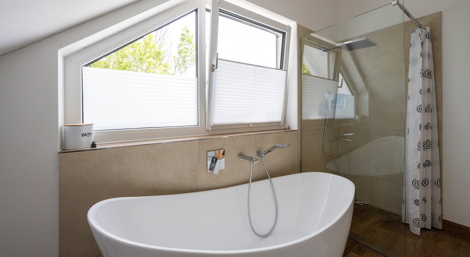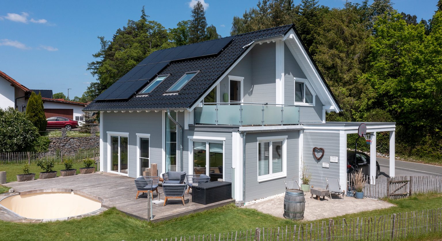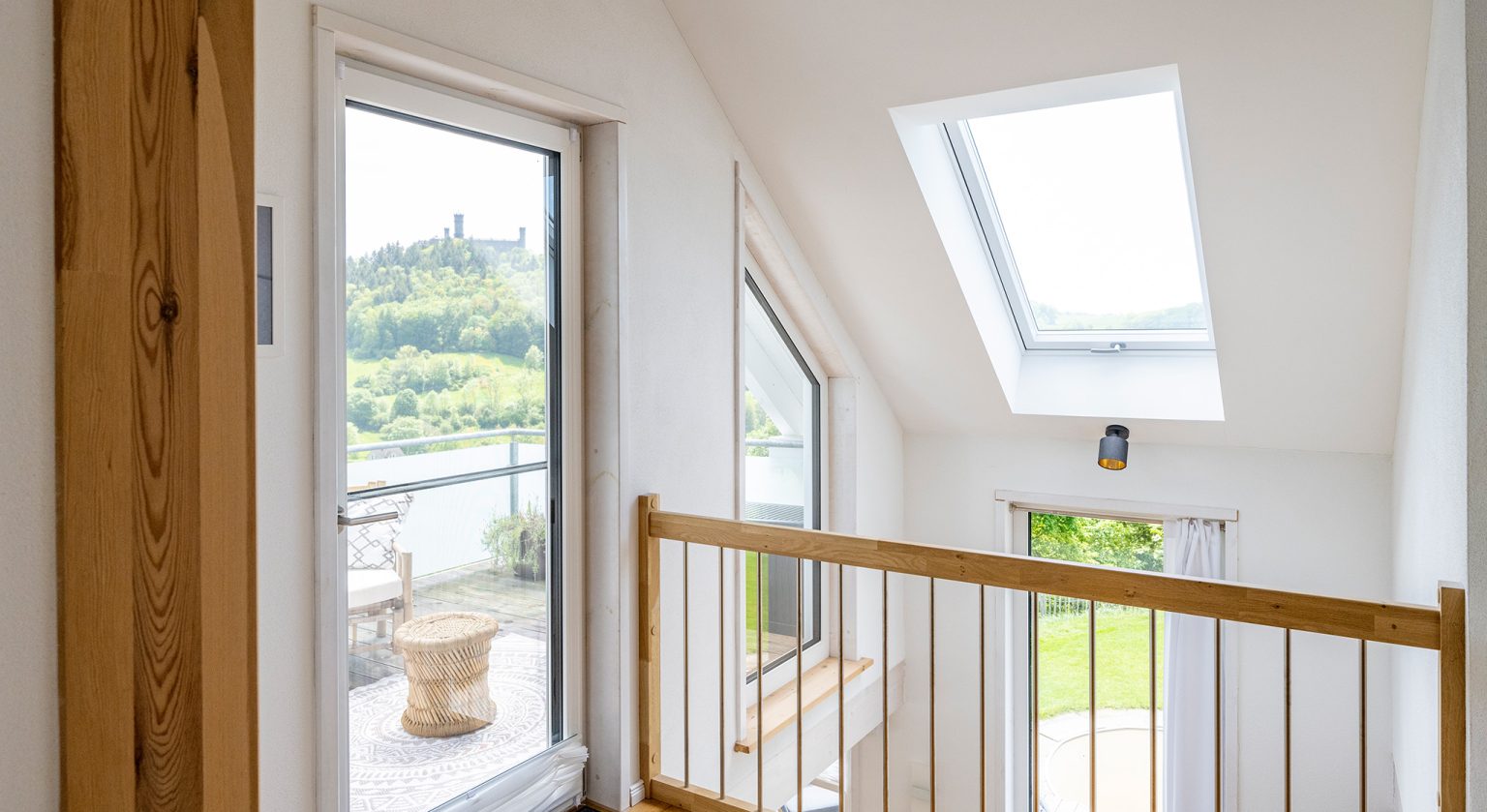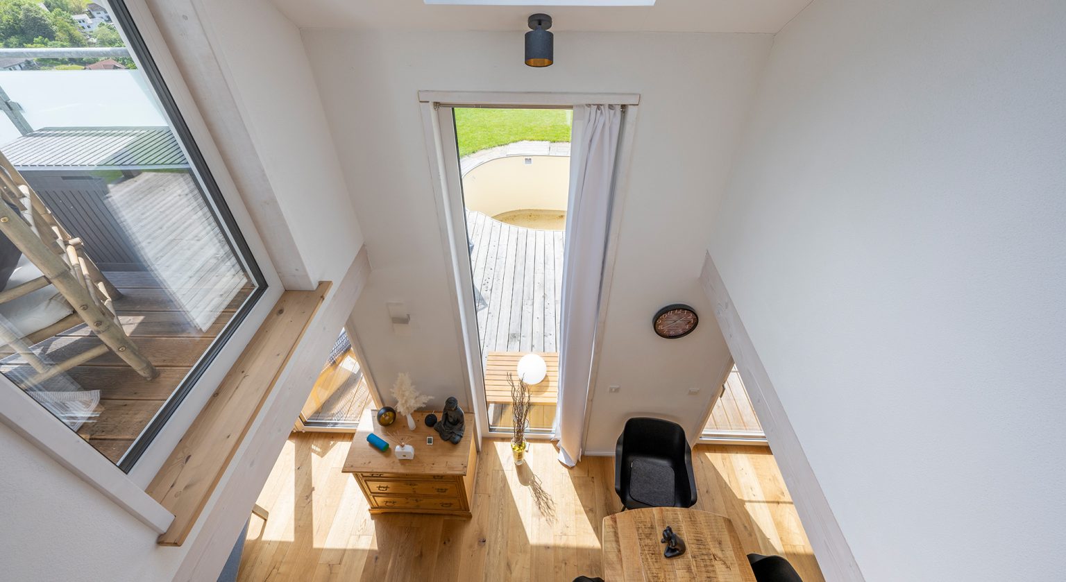 Melanie Henecker entschied sich als Baustufe für eine Richtmeistermontage, bei der die Bauherrschaft beim Hausbau so viel sie kann und möchte mithilft. Welche Leistungen Fullwood Wohnblockhaus erbringt und welche die Bauherrin, wurde vorab detailliert im Vertrag festgelegt. Auch diese Vereinbarungen wurden genauso individuell abgestimmt wie die Planung des Einfamilienhauses. „Ich habe meine Wünsche und Wohnbedürfnisse genau geäußert und dann zusammen mit dem Berater von Fullwood mein Traumhaus entworfen. Neben einer zeitnahen Umsetzung hatten für mich eine Dachterrasse, eine Galerie und viel natürliches Licht im Haus Priorität. Außerdem wollte ich von jedem Zimmer aus, in dem ich mich tagsüber aufhalte, freien Blick auf die Schaumburg haben. Alles das und noch viel mehr habe ich selbstverständlich auch bekommen – ich kann nun sogar aus der Badewanne auf die Burg sehen!“, erzählt die Hauseigentümerin. Nachdem der Entwurf also stand, ging es in die technische Planung, dann wurden die Wände und Bauteile des Dachstuhls exakt im Werk gefertigt, pünktlich zum Bauplatz geliefert und die Hausmontage konnte beginnen. Zuvor war natürlich schon die Bodenplatte gebaut worden. „Ich habe in fast allen Bereichen eigenhändig mitgearbeitet!“, berichtet die patente Hausherrin stolz und zählt auf: „Bitumenschicht auf die Bodenplatte auftragen; Aufstellen des Hauses; Zwischenwände im Hausinnern stellen und Böden bearbeiten; Fensterbänke verkleiden; Carportmontage; Verandabau; Stromkabel im gesamten Gebäude verlegen; Rigips-Arbeiten; Dämmung zwischen die Verrohrung der Fußbodenheizung aufbringen; Bodenbelag im Schlafzimmer verlegen und Swimmingpool bauen.“ Freilich benötigte sie weitere helfende Hände, die unter der Regie und Vorarbeit des Fullwood-Richtmeisters mitarbeiteten. „Meine Zwillingsschwester und ihr Mann halfen mit, ebenso zwei gute Freunde.“, so Melanie Henecker. Bereits knapp fünf Monate nach Hausanlieferung konnte sie mit ihrem Sohn einziehen. Eine reife Leistung, die unter anderem aufgrund der straffen Organisation seitens Bauherrin und Blockhausfirma möglich war sowie der termingetreuen und professionellen Arbeit aller Beteiligten zu verdanken ist. Passend zum ökologischen, nachhaltigen Konzept heizt die Eigentümerin von Holzhaus „Idyll Schaumburgblick“ mit einer ressourcenschonenden, modernen Wärmepumpe und erzeugt mit ihrer PV-Anlage Strom aus erneuerbarer Sonnenenergie. „Da ich im Hausinnern keine Blockwände wollte, wählte ich die Kombiblockwand von Fullwood. Damit ist man gestalterisch flexibel und kann innen die Wände nach eigenem Gusto verkleiden. Ich entschied mich für Rigipsplatten mit 2mm Streichputz.“ Diese Wandvariante ist nicht einschalig, sondern im Kern gedämmt, wobei auch die Dämmung frei wählbar ist. Melanies Wunsch entsprechend, wurde recycelte Cellulose-Dämmung eingeblasen.