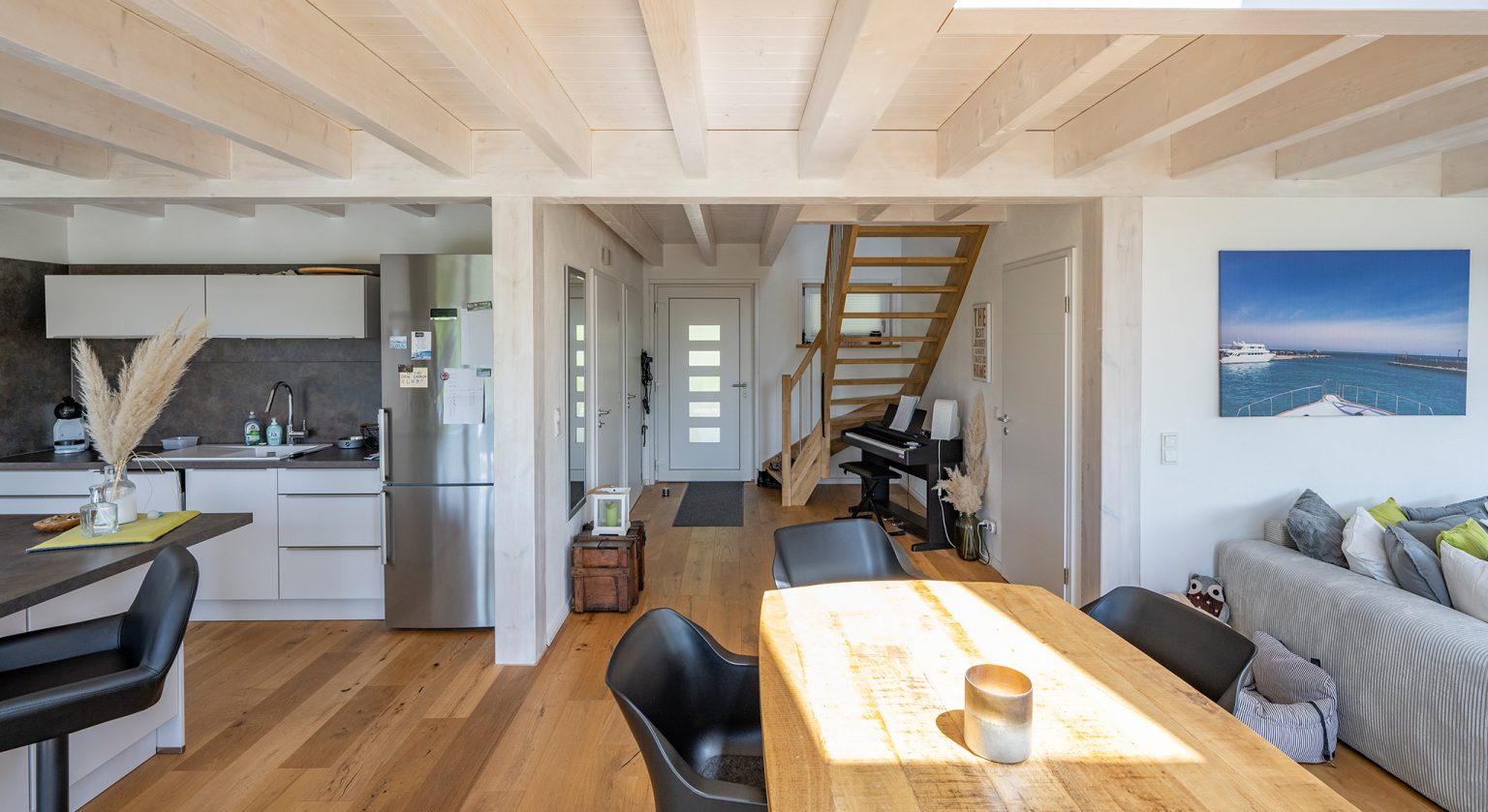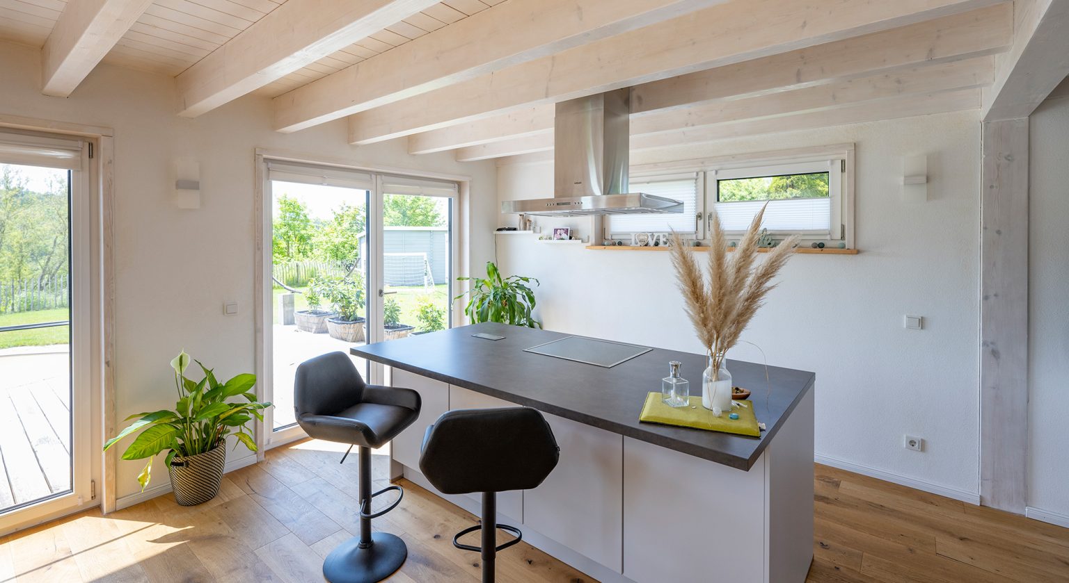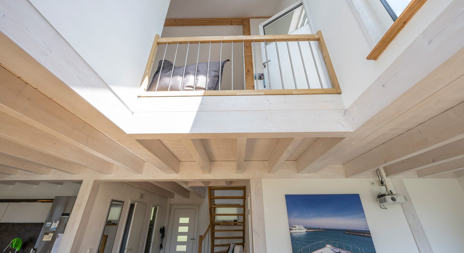 Schon von außen wirkt Holzhaus „Idyll Schaumburgblick“ ausgesprochen einladend und freundlich, was sicherlich nicht nur seiner Architektur geschuldet ist, sondern auch an dem hellgrauen Anstrich in Kombination mit weißen Details (Fenster, Haustüre, Terrasse, Carport und weitere Holzelemente) liegt. Das Bauwerk wird von einem Satteldach in dunklem anthrazit gekrönt, was dem Gebäude optisch zu moderner Bodenständigkeit verhilft. Drinnen erstrahlt alles Dank lichtdurchfluteter Räume in weißen Wänden und ganz hell lasierten, offenen Balkendecken. Der Dachstuhl ist passend zu den Wänden unsichtbar und in glattem, ruhigem Weiß gehalten. Viele, größtenteils bodentiefe Fenster lassen reichlich natürliches Licht eindringen, besonders in den offenen Wohn-/Ess-/Kochbereich. Dieser ist über dem halben Wohnzimmer bis zum Dach offen, wodurch die Leichtigkeit und Luftigkeit des Hauses betont werden. Die Fenster in den Dachschrägen lassen zusätzliches Sonnenlicht ins Dachgeschoss ein und in den Wohnbereich hinabgleiten. Der Eingangsbereich geht fließend und ohne Unterbrechung in den Wohnbereich über. Direkt neben der Eingangstür schwingt sich eine transparent und leicht wirkende Holztreppe hinauf ins Dachgeschoss. Dort gelangt man auf eine helle Galerie, von der man nicht nur hinunter auf die Wohnlandschaft schaut, sondern Zugang zur Dachterrasse (über dem halben Wohnzimmer), zum Kinderzimmer, zum Schlafzimmer und zum Badezimmer hat. Im Erdgeschoss komplettieren ein Arbeitszimmer, ein Vorratsraum, ein Hauswirtschafts- und Technikraum sowie ein Gäste-WC das Raumprogramm des Hauses.