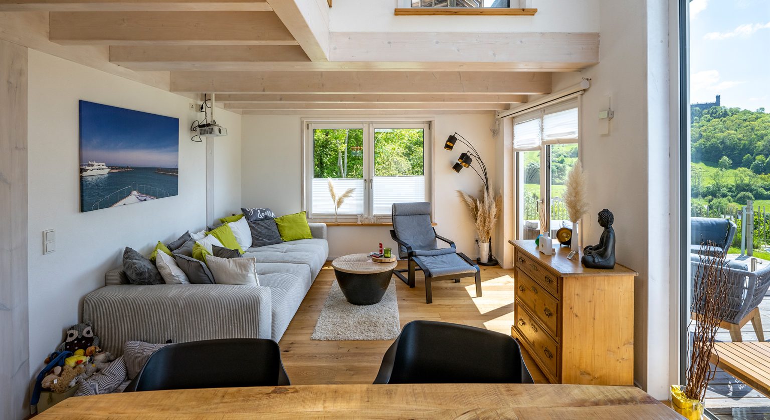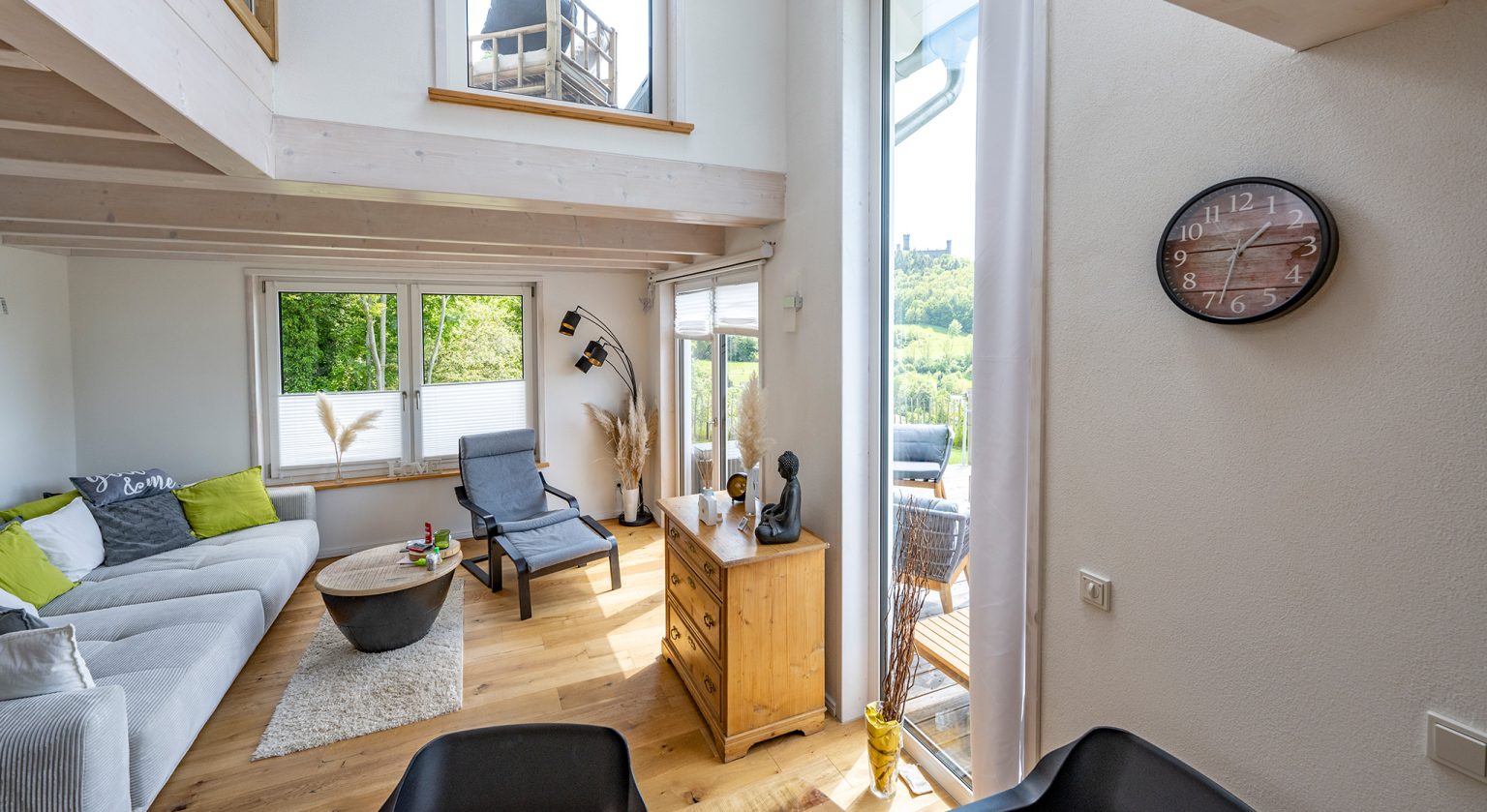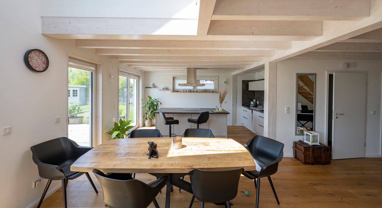 Schon von außen wirkt Holzhaus „Idyll Schaumburgblick“ ausgesprochen einladend und freundlich, was sicherlich nicht nur seiner Architektur geschuldet ist, sondern auch an dem hellgrauen Anstrich in Kombination mit weißen Details (Fenster, Haustüre, Terrasse, Carport und weitere Holzelemente) liegt. Das Bauwerk wird von einem Satteldach in dunklem anthrazit gekrönt, was dem Gebäude optisch zu moderner Bodenständigkeit verhilft. Drinnen erstrahlt alles Dank lichtdurchfluteter Räume in weißen Wänden und ganz hell lasierten, offenen Balkendecken. Der Dachstuhl ist passend zu den Wänden unsichtbar und in glattem, ruhigem Weiß gehalten. Viele, größtenteils bodentiefe Fenster lassen reichlich natürliches Licht eindringen, besonders in den offenen Wohn-/Ess-/Kochbereich. Dieser ist über dem halben Wohnzimmer bis zum Dach offen, wodurch die Leichtigkeit und Luftigkeit des Hauses betont werden. Die Fenster in den Dachschrägen lassen zusätzliches Sonnenlicht ins Dachgeschoss ein und in den Wohnbereich hinabgleiten. Der Eingangsbereich geht fließend und ohne Unterbrechung in den Wohnbereich über. Direkt neben der Eingangstür schwingt sich eine transparent und leicht wirkende Holztreppe hinauf ins Dachgeschoss. Dort gelangt man auf eine helle Galerie, von der man nicht nur hinunter auf die Wohnlandschaft schaut, sondern Zugang zur Dachterrasse (über dem halben Wohnzimmer), zum Kinderzimmer, zum Schlafzimmer und zum Badezimmer hat. Im Erdgeschoss komplettieren ein Arbeitszimmer, ein Vorratsraum, ein Hauswirtschafts- und Technikraum sowie ein Gäste-WC das Raumprogramm des Hauses.