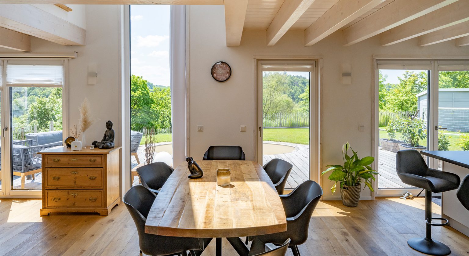 Aus dem Bauch heraus für ein Holzhaus entschieden und seitdem das gute Gefühl, alles richtig gemacht zu haben – so könnte man in einem Satz resümieren, warum Melanie Henecker ein Fullwood Wohnblockhaus gebaut hat und wie sie sich heute damit fühlt. „Ich habe die Entscheidung, ausgerechnet ein Holzhaus zu bauen, spontan getroffen. In erster Linie wollte ich kein Haus von der Stange haben, sondern etwas Besonderes.“, so die Eigentümerin von Holzhaus „Idyll Schaumburgblick“. Schon der erste Besuch eines Musterhauses von Fullwood begeisterte sie dermaßen, dass sie sich gleich für ein individuell geplantes Blockhaus des Holzhaus Spezialisten entschied. „Auf Fullwood selbst kam ich über private Kontakte und Empfehlungen.“, fährt sie fort. Neben dem Hang zum Außergewöhnlichen überzeugte die Mutter eines Sohnes auch die Klimafreundlichkeit der Fullwood Wohnblockhäuser sowie deren Energieeffizienz. Ein niedriger Heizenergieverbrauch ist schließlich für jeden, der ein Eigenheim baut interessant und gerade, wenn man Kinder hat, denkt man auch intensiver über den eigenen Beitrag zum Klimaschutz nach – schließlich geht es auch um die Zukunft des Nachwuchses. Hier trumpfen nachhaltig gebaute Holzhäuser per se mit einer niedrigen CO2-Bilanz auf, egal ob einschalig oder mit ökologischer Dämmung versehen. Das betrifft bereits die Herstellung eines Holzhauses sowie dessen Lebensdauer und Wohnbetrieb. „Die Wände von Fullwood sind absolut winddicht, setzungsfrei und dämmen hervorragend. Somit benötige ich weniger Heizenergie, was nicht nur die Umwelt schont, sondern vor allem auch den Geldbeutel.“, freut sich Melanie Henecker. Die freie Lage ihres Baugrundstücks im Grünen spielte ebenfalls eine Rolle bei der Entscheidung der Bauweise: „Ein Holzhaus passt einfach sehr gut hierher.“