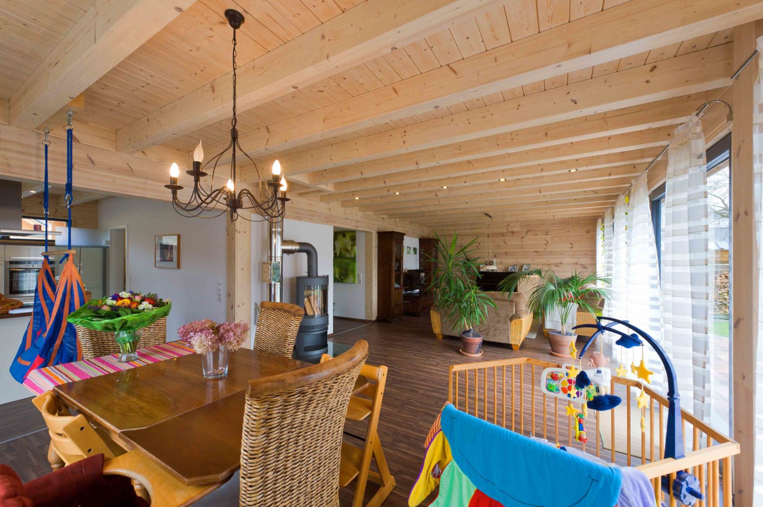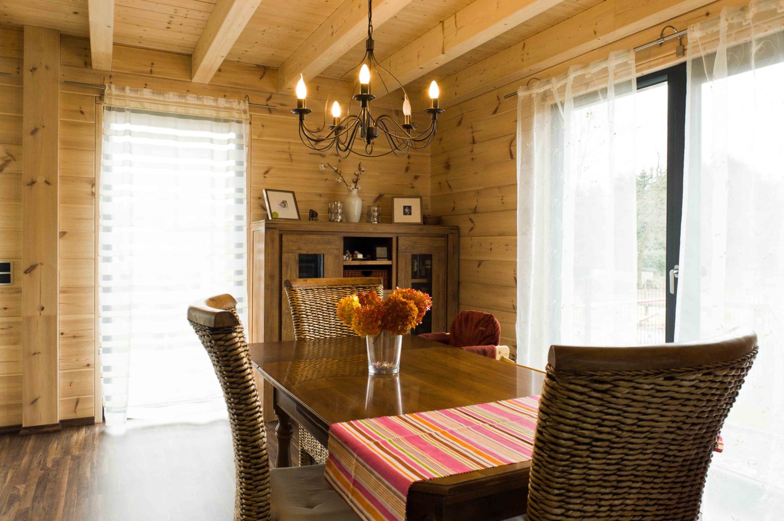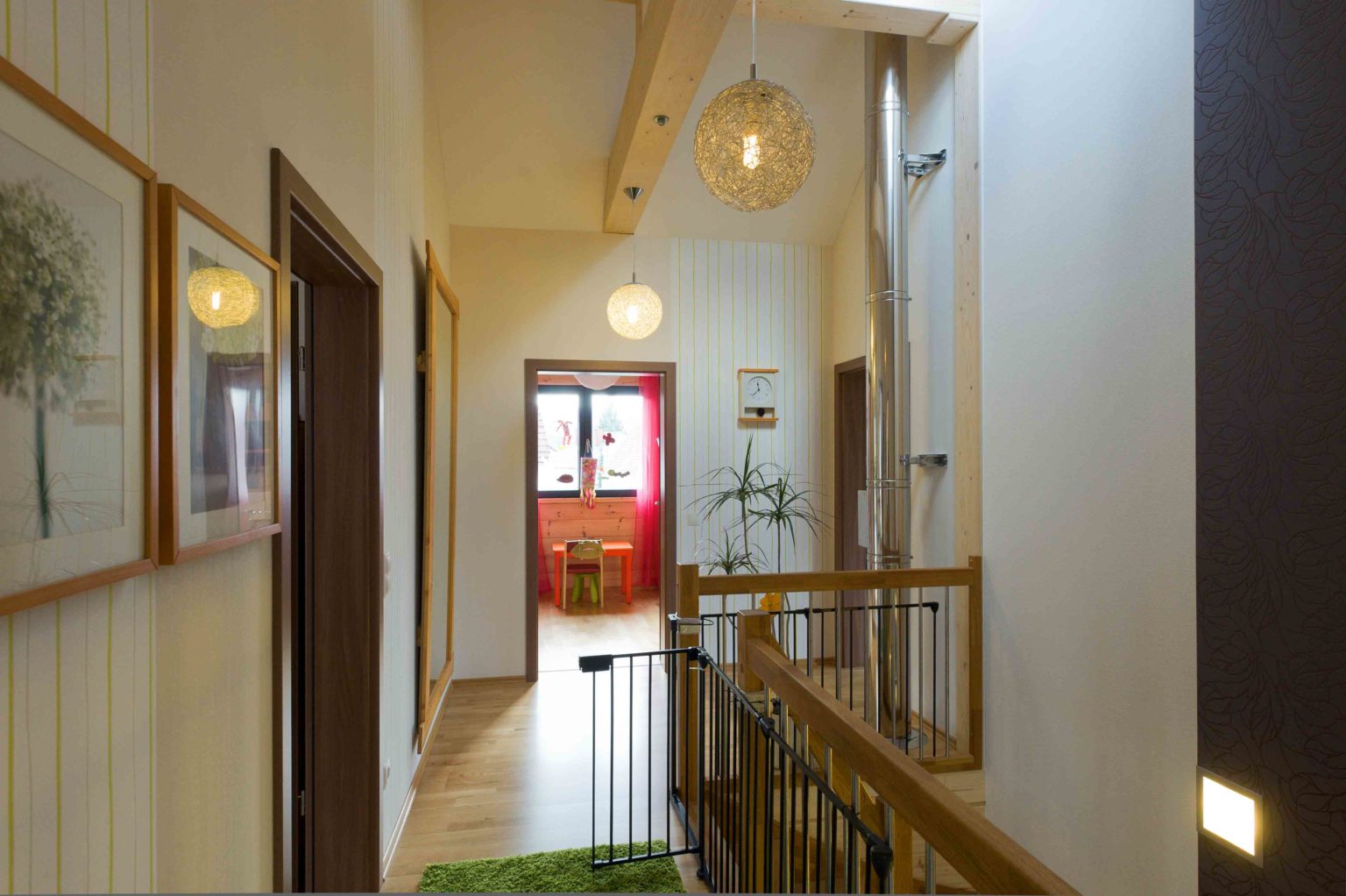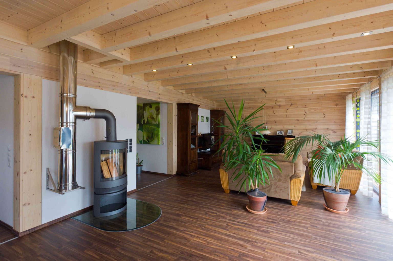 Ihr Holzhaus wurde den Köders sozusagen „auf den Leib geschneidert“: In enger Zusammenarbeit mit dem Hersteller entwarfen und planten Alexander und Elisabeth Köder ihr Holzhaus nach den eigenen Wünschen, Bedürfnissen und Budget. Auf Qualität wollten sie dabei keinesfalls verzichten, weshalb sie sich für Fullwood entschieden. Schon seit vielen Jahren liebäugelte das Ehepaar mit dessen massiven Holzhäusern, bis der Bau des eigenen Heims endlich losgehen konnte. Nun freuen sie sich auch über den niedrigen Heizenergiebedarf ihres Hauses, welcher die laufenden Kosten deutlich senkt, genau so, wie es Fullwood versprach, obwohl die berechneten Werte dies nicht ausdrücken. Ein klassischer Widerspruch zwischen Theorie und Praxis, von dem die Familie hier eindeutig profitiert. Eine Gastherme liefert die benötigte Heizenergie, wobei im Winter hauptsächlich der Kaminofen zum Einsatz kommt. Sein Abluftrohr gibt auch im Dachgeschoss genug Strahlungswärme ab und ein knisterndes Feuer verwöhnt nun mal mehr Sinne als es die Fußbodenheizung vermag. Eine solare Anlage auf dem Hausdach erwärmt außerdem das Brauchwasser solange die Sonne scheint.