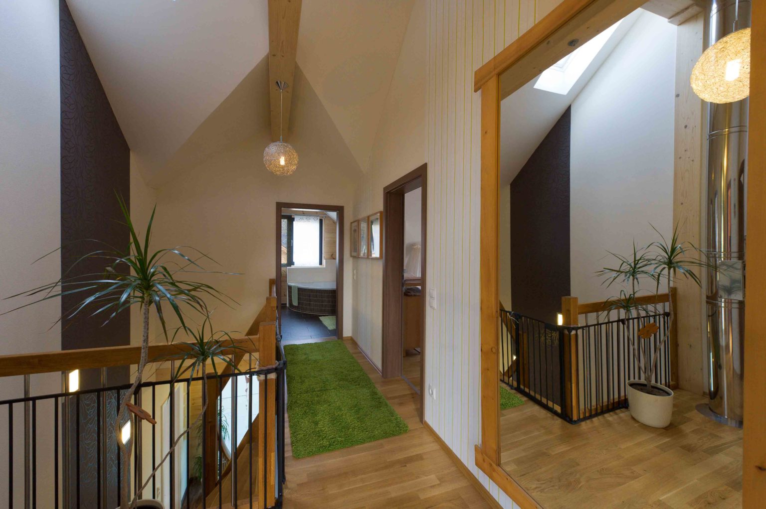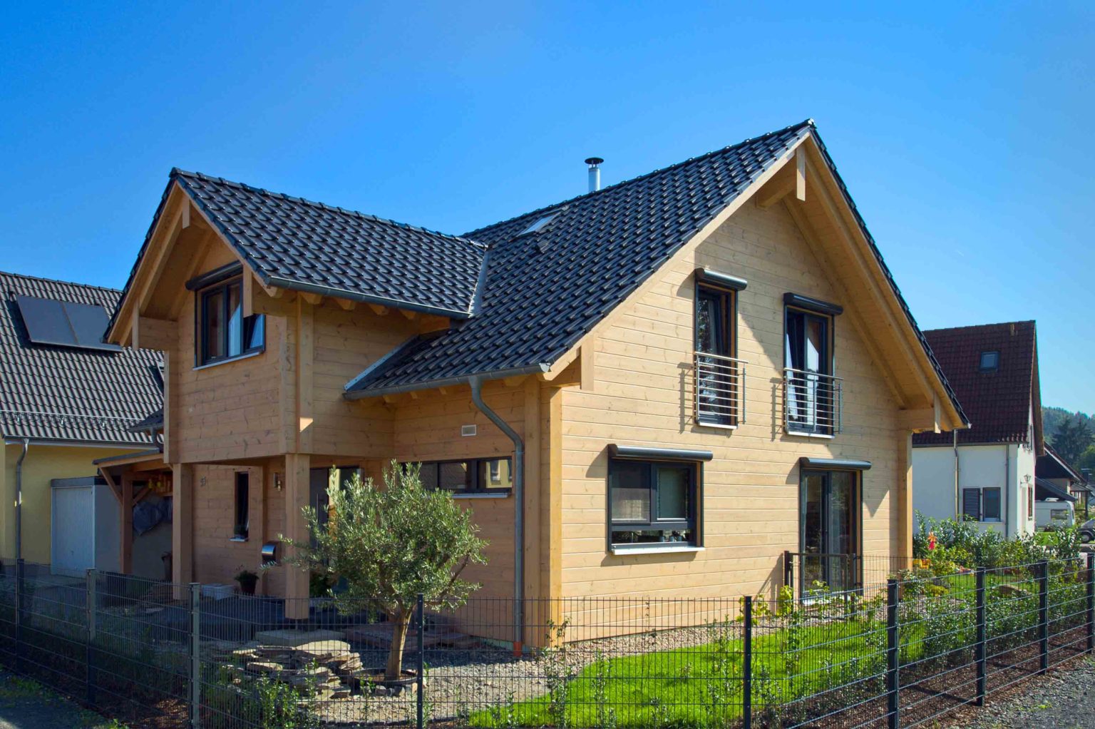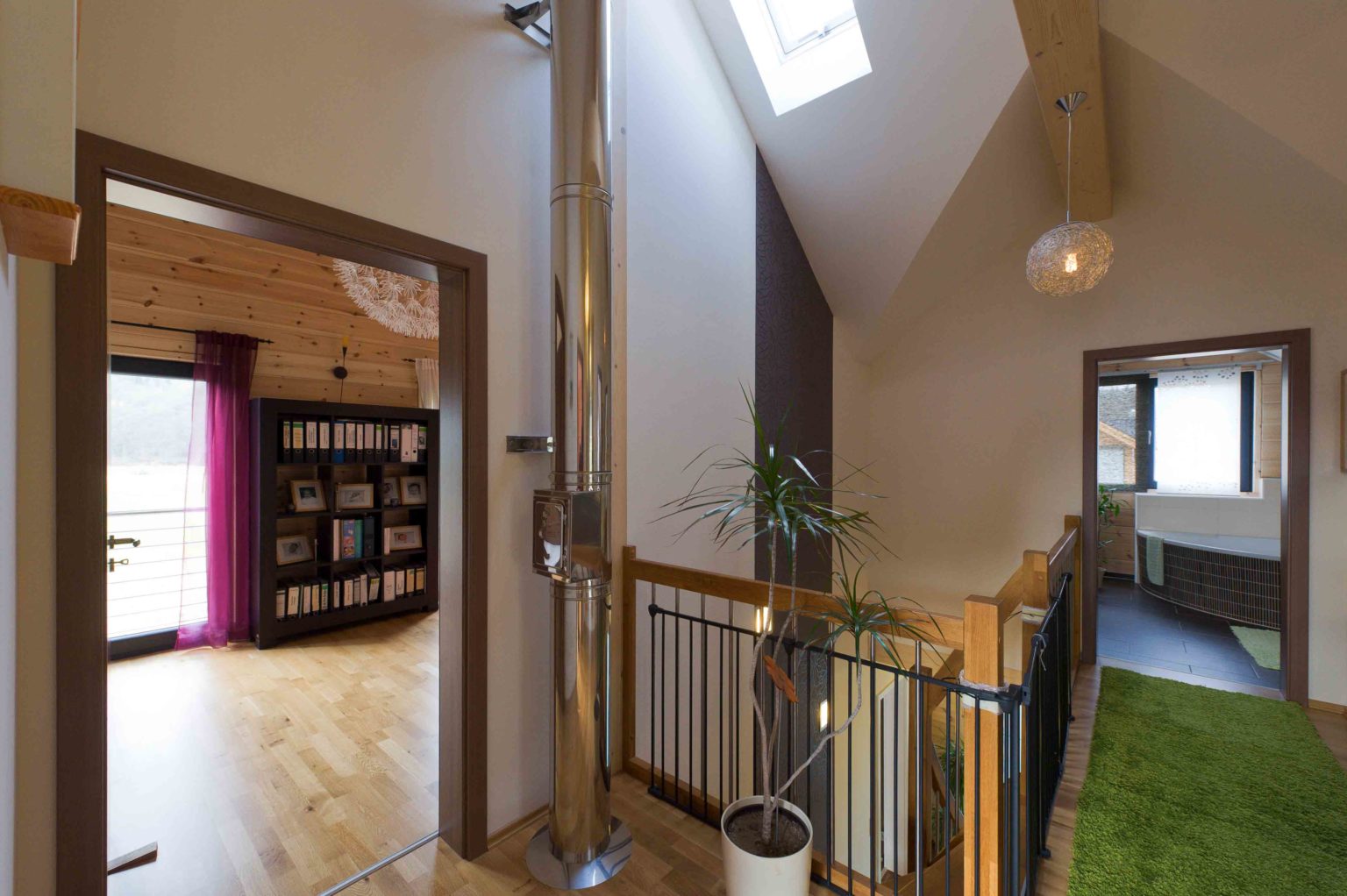 Ihr Holzhaus wurde den Köders sozusagen „auf den Leib geschneidert“: In enger Zusammenarbeit mit dem Hersteller entwarfen und planten Alexander und Elisabeth Köder ihr Holzhaus nach den eigenen Wünschen, Bedürfnissen und Budget. Auf Qualität wollten sie dabei keinesfalls verzichten, weshalb sie sich für Fullwood entschieden. Schon seit vielen Jahren liebäugelte das Ehepaar mit dessen massiven Holzhäusern, bis der Bau des eigenen Heims endlich losgehen konnte. Nun freuen sie sich auch über den niedrigen Heizenergiebedarf ihres Hauses, welcher die laufenden Kosten deutlich senkt, genau so, wie es Fullwood versprach, obwohl die berechneten Werte dies nicht ausdrücken. Ein klassischer Widerspruch zwischen Theorie und Praxis, von dem die Familie hier eindeutig profitiert. Eine Gastherme liefert die benötigte Heizenergie, wobei im Winter hauptsächlich der Kaminofen zum Einsatz kommt. Sein Abluftrohr gibt auch im Dachgeschoss genug Strahlungswärme ab und ein knisterndes Feuer verwöhnt nun mal mehr Sinne als es die Fußbodenheizung vermag. Eine solare Anlage auf dem Hausdach erwärmt außerdem das Brauchwasser solange die Sonne scheint.