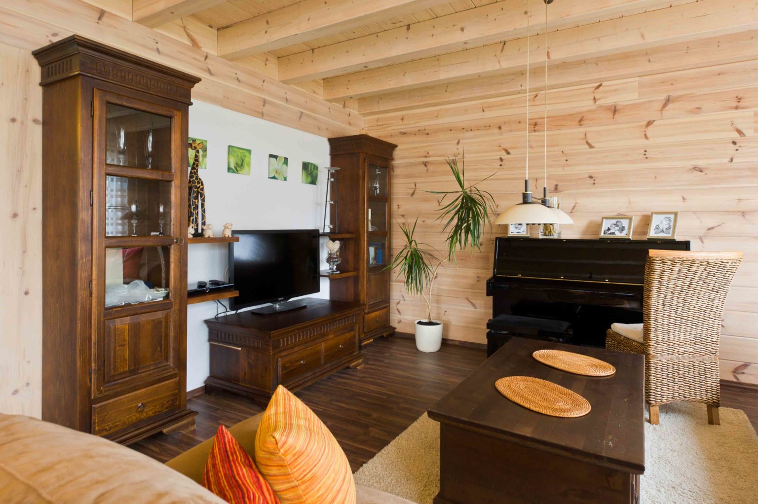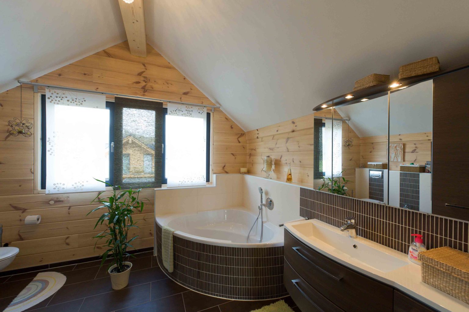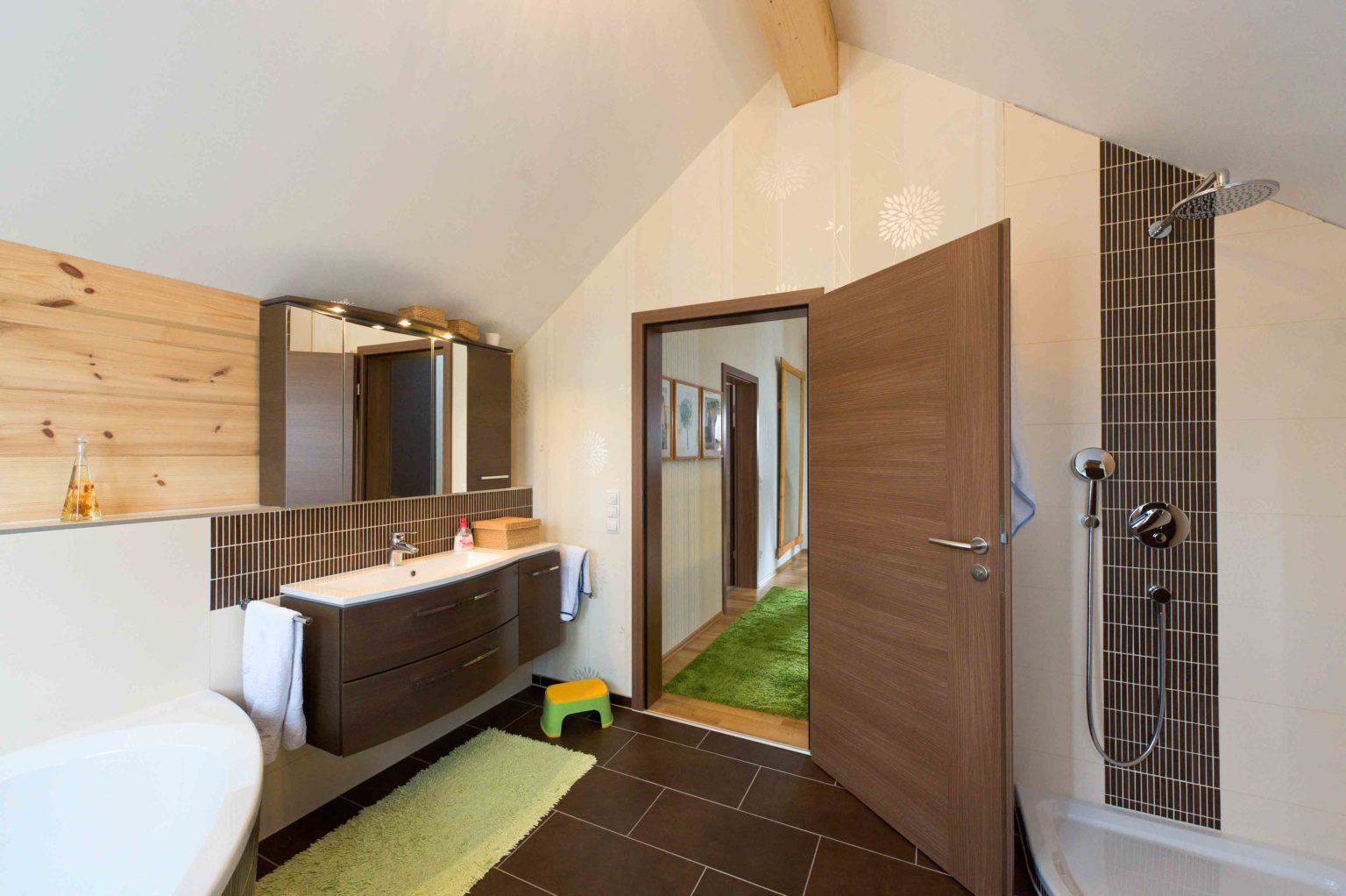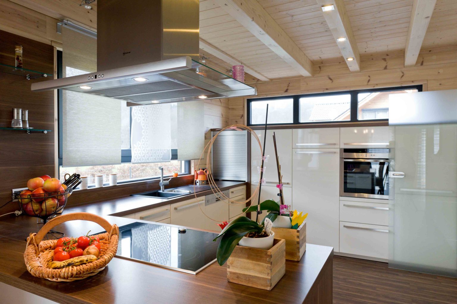 Ihr Holzhaus wurde den Köders sozusagen „auf den Leib geschneidert“: In enger Zusammenarbeit mit dem Hersteller entwarfen und planten Alexander und Elisabeth Köder ihr Holzhaus nach den eigenen Wünschen, Bedürfnissen und Budget. Auf Qualität wollten sie dabei keinesfalls verzichten, weshalb sie sich für Fullwood entschieden. Schon seit vielen Jahren liebäugelte das Ehepaar mit dessen massiven Holzhäusern, bis der Bau des eigenen Heims endlich losgehen konnte. Nun freuen sie sich auch über den niedrigen Heizenergiebedarf ihres Hauses, welcher die laufenden Kosten deutlich senkt, genau so, wie es Fullwood versprach, obwohl die berechneten Werte dies nicht ausdrücken. Ein klassischer Widerspruch zwischen Theorie und Praxis, von dem die Familie hier eindeutig profitiert. Eine Gastherme liefert die benötigte Heizenergie, wobei im Winter hauptsächlich der Kaminofen zum Einsatz kommt. Sein Abluftrohr gibt auch im Dachgeschoss genug Strahlungswärme ab und ein knisterndes Feuer verwöhnt nun mal mehr Sinne als es die Fußbodenheizung vermag. Eine solare Anlage auf dem Hausdach erwärmt außerdem das Brauchwasser solange die Sonne scheint.