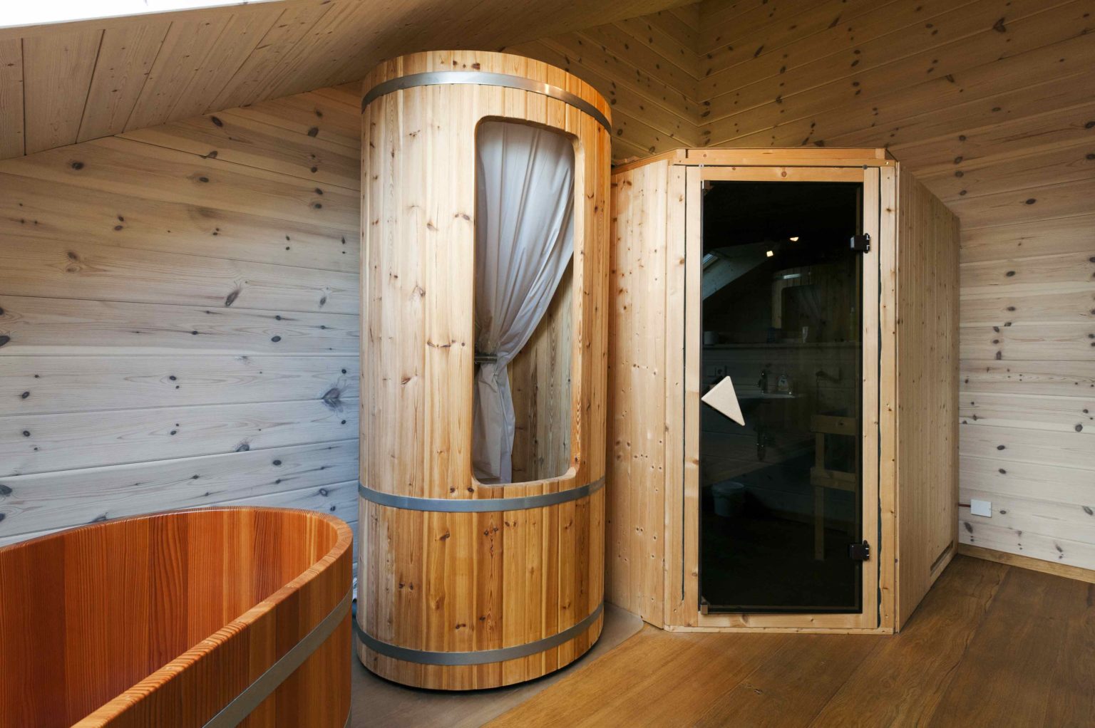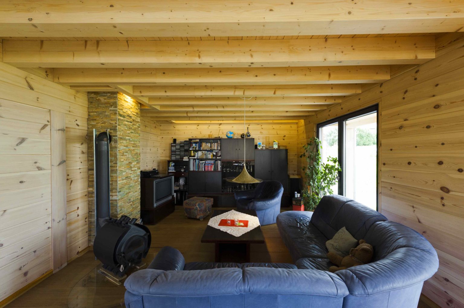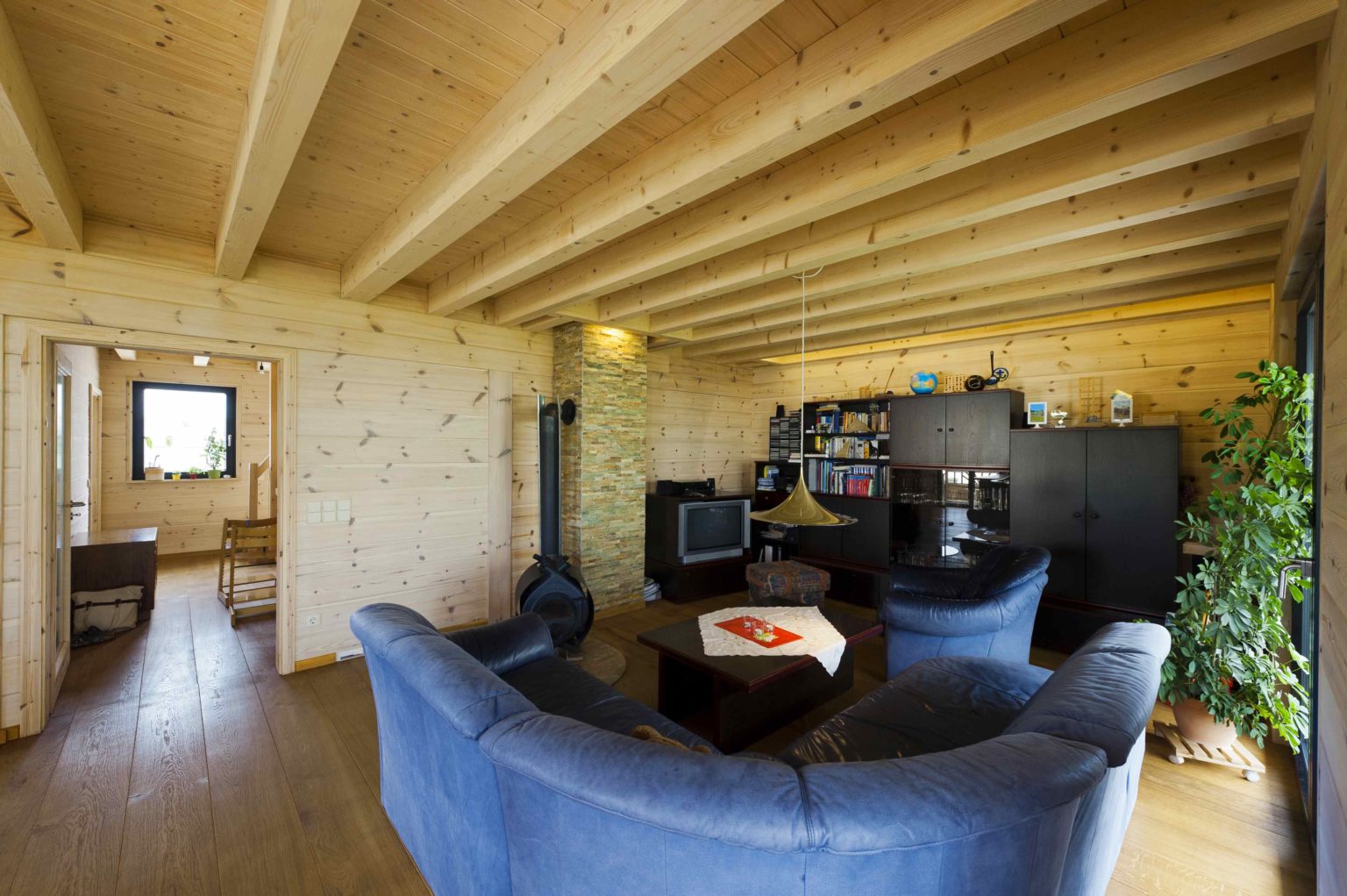 Sogar beheizt wird Holzhaus „im Heckengäu“ laut Hausherrn zu 95% mit Holz. Der rustikale „Bullerjahn“-Ofen im Wohnbereich wird mit Holzscheiten gefüttert und sorgt für angenehme Strahlungswärme. Die Vollholzwände halten die Wärme gut im Haus und bewirken eine gefühlt höhere Temperatur in den Räumen (2-3 Grad Celsius!). Eine gute Sparrendachdämmung und hochwertige Wärmeschutzfenster helfen zusätzlich bei der Isolation; sie halten im Winter die Wärme drinnen, und lassen im Sommer die Hitze draußen. Die zusätzliche Gasbrennwerttherme versorgt die Fußbodenheizung im gesamten Haus bei Abwesenheit. Die Heizkreise sind für jedes Zimmer getrennt und über einen Thermostatzeitschalter einstellbar, so wird nichts verschenkt im routinierten Tagesablauf der 5-köpfigen Familie. Jedes Zimmer besitzt 2 Stromkreise und alle Leitungen laufen in der Zentrale im Keller zusammen. Entsprechend dieser vernünftigen und gut durchdachten Maßnahmen freuen sich die Hausbesitzer über niedrige Energiekosten. Praktisch findet die Hausfrau auch die Einkehrdüsen in den Wänden, die zu einer zentralen Staubsaugeranlage gehören. So muss kein schwerer Sauger durch die Etagen getragen werden und niemand stolpert über lange Kabel. Beutel werden auch nicht benötigt.