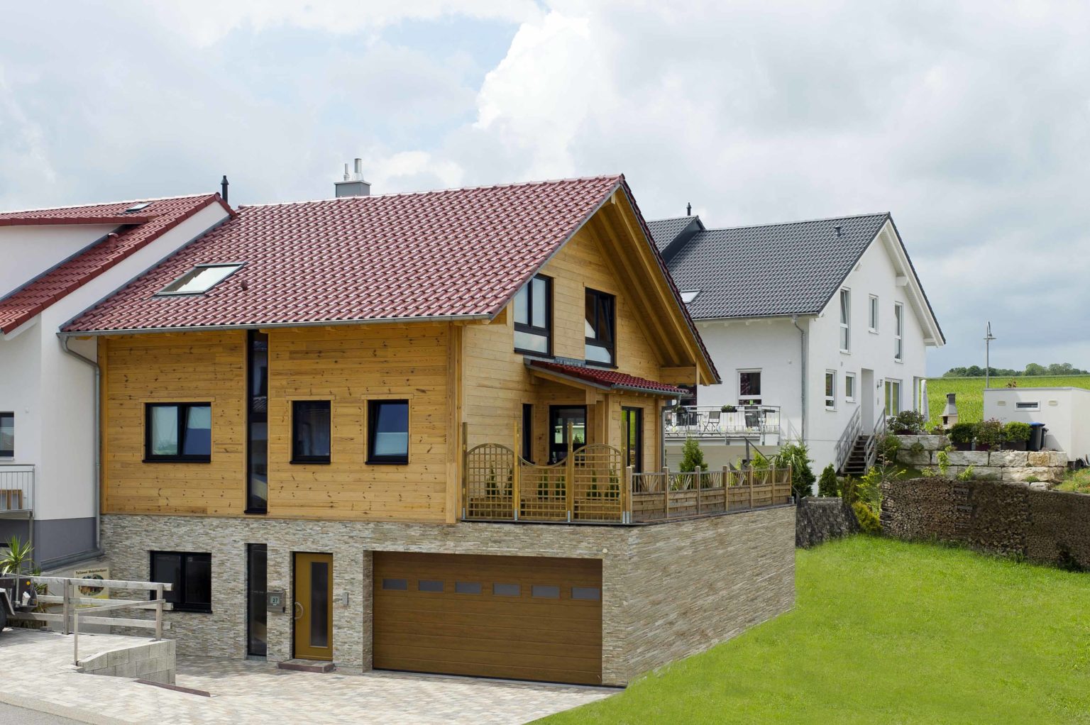 Holzhaus „im Heckengäu“ ist das einzige massive Holzhaus im Neubaugebiet und fügt sich überraschend harmonisch zwischen die weiß verputzten, oder mit hellen Klinkern verkleideten Nachbarhäuser ein. Natürlich hebt sich das Holzhaus durch sein Material ab, aber da die robusten Polarkiefernwände ganz glatt und sehr hell sind, und seine Architektur den anderen Häusern entspricht, passt es sehr gut ins Gesamtbild. Das im Bauplan vorgeschriebene Satteldach wurde ziegelrot gedeckt, und die Holzfensterrahmen unterstreichen durch ihre schwarze Farbe die zeitgemäße Optik. Das Baugrundstück besitzt ein Gefälle, das die Hauseigentümer für sich genutzt haben, indem sie ein sehr großes Untergeschoss (Keller mit Werkstatt und Doppelgarage) bauten, und darauf die massiven Vollholz-Wandelemente setzten. Der Hauseingang befindet sich im Untergeschoss. Die Anordnung der Fenster bietet ebenfalls ein sachliches Bild – an diesem Holzhaus ist wirklich nichts verschnörkelt! – Und da die Hauseigentümer viel natürliches Licht im Haus wollten, haben sie sehr viele, im Wohnbereich ausschließlich bodentiefe, Fenster eingebaut.