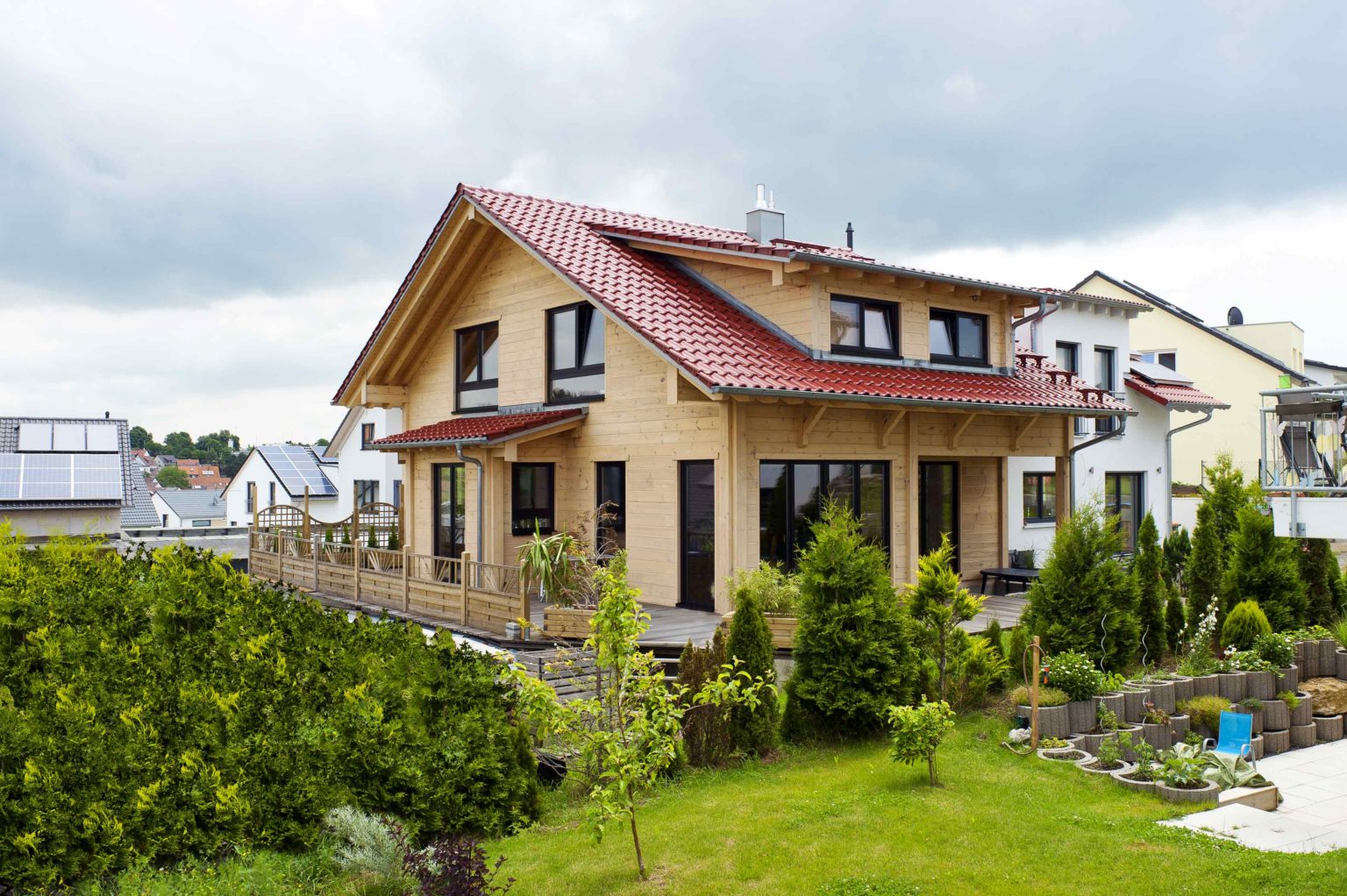 Da beide Ehepartner handwerklich sehr versiert und geschickt sind, bestellten sie ihr Holzhaus als „Richtmeistermontage“. Das bedeutet, die Wandelemente werden im Werk passgenau vorgefertigt, pünktlich zur Baustelle geliefert, mittels Kran auf das Untergeschoss gehievt und dann unter der Regie und Vorarbeit eines erfahrenen Fullwood-Zimmermanns von den Bauherren selbst montiert. Zusätzlich halfen 5 Freunde des Ehepaares mit und nach nur 1 Woche waren alle Wände gesetzt, der Dachstuhl gezimmert und mit Dachpappe für die Dachdeckerarbeit vorbereitet. Den Innenausbau machte die Eigentümerfamilie komplett selbst. Zum Teil konnten auch die fast erwachsenen Kinder helfen. Ins Erdgeschoss gelangt man vom Untergeschoss über eine Treppe hinauf. Dort kommt man in eine große Diele, von der es in den geräumigen Wohn/Ess/Kochbereich, mit einem der Küche angeschlossenem Vorratsraum, geht. Das Schlafzimmer und ein kleines Duschbad mit WC befinden sich ebenfalls im Erdgeschoss. Im Dachgeschoss befinden sich 2 große Kinderzimmer und ein großzügiges Gästezimmer, sowie das Familienbad mit Holzmöbeln wie in einem klassischen Westernfilm. Alle Zimmer gehen von einem kleinen Flur in der Hausmitte ab. Eine große Doppelgaube an der süd-westlichen Traufseite (Garten) schafft zusätzlichen Platz im Dachgeschoss (Kind + Gast). Ein eingeschossiger Rechteckerker tritt an der nord-östlichen Giebelseite mittig aus dem Grundrissrechteck heraus. Dort befindet sich die Küche. An der süd-westlichen Traufseite tritt zur Hälfte ein Rechteck aus dem Grundriss hervor, aber über anderthalb Geschosse, so dass außen ein überdachter, windgeschützter Freisitz entstand, wo die Familie gerne sitzt. Heute genieß die Familie das Wohnen in ihrem Holzhaus, nicht zuletzt auch wegen dem wohltuenden Raumklima, das nur massive Holzhäuser in dieser Form besitzen – von der einzigartigen Wohlfühlatmosphäre ganz zu schweigen.