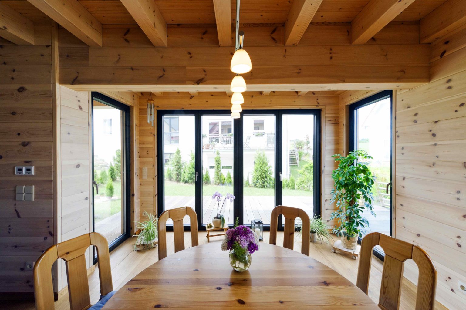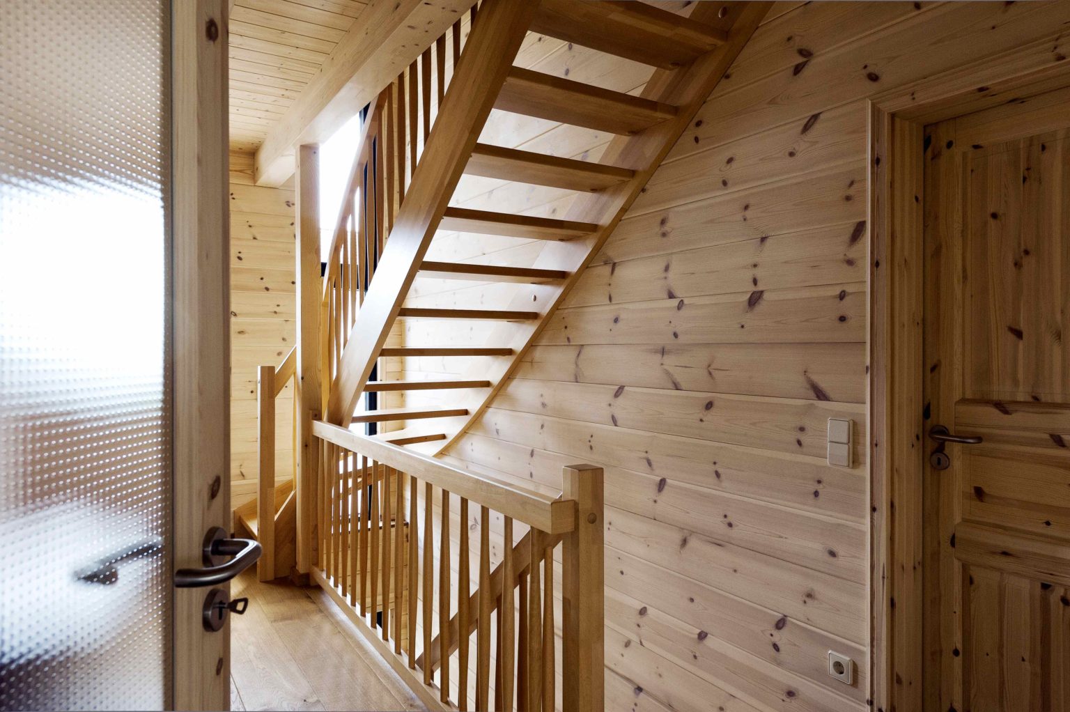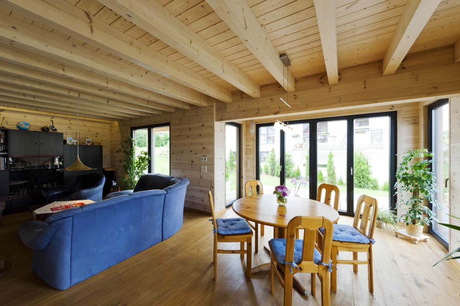 Neben den massiven Außenwänden aus nordischer Polarkiefer – deren Holz ist durch das langsamere Wachstum in der Kälte besonders dicht und hart – und den Fenstern aus Merantieholz, haben die Eigentümer von Holzhaus „im Heckengäu“ noch die Fußböden mit geölten Eichendielen ausgelegt, die Trennwände (leichtes Ständerwerk) mit den horizontalen Kiefernholzplanken des Hausherstellers verkleidet, eine Geschosstreppe aus hellem Buchenholz einbauen lassen, ausschließlich Türen aus Naturholz (und teilweise Glas) gewählt und sogar Badezimmermöbel (Wanne, Dusche, Sauna, Toilettensitz) aus Massivholz gefunden. Das restliche Mobiliar stammt noch aus dem alten Haus und ist – natürlich – größtenteils auch aus Holz gefertigt. Die vorhandene Küche bestimmte sogar bei der Hausplanung die genauen Maße des offenen Wohn/Ess/Koch-Bereichs! Um die gewünschte Helligkeit im Holzhaus zu garantieren, strich die Hausherrin die von Natur aus schon sehr hellen Kiefernwände und offenen Balkendecken innen mit einer UV-Schutz-Lasur an, die zusätzlich einige weiße Pigmente besitzt, so dass die Wände noch einen Tick heller wurden und zudem nicht nachdunkeln können. Die Holztüren bekamen dieselbe Lasur, fallen also nicht groß auf in den Wänden.