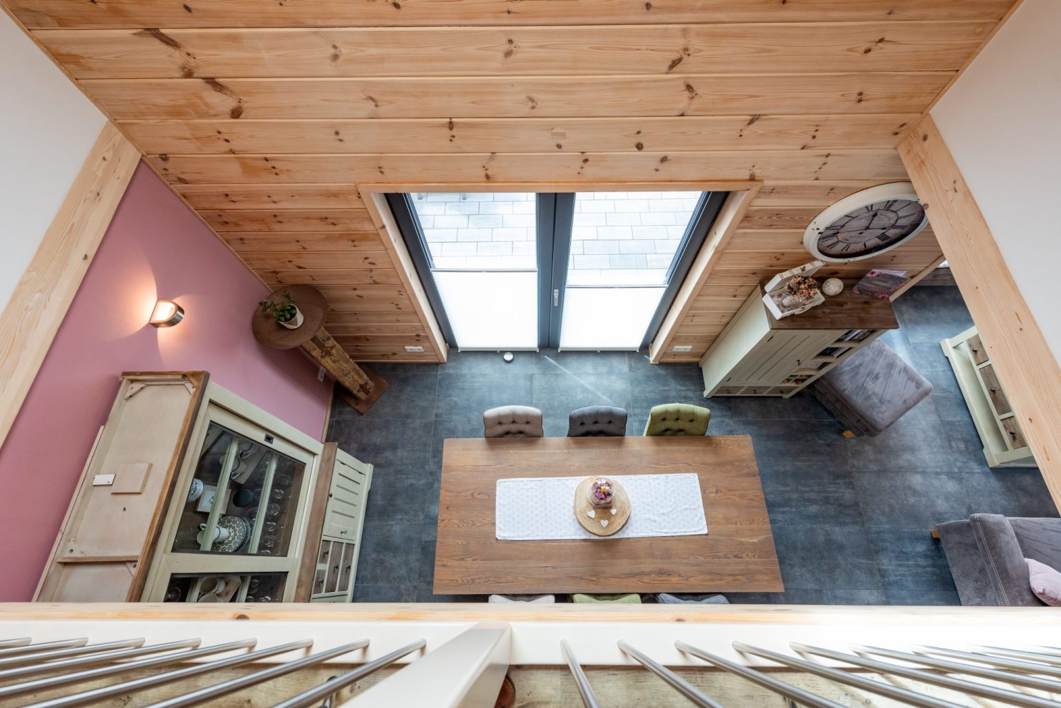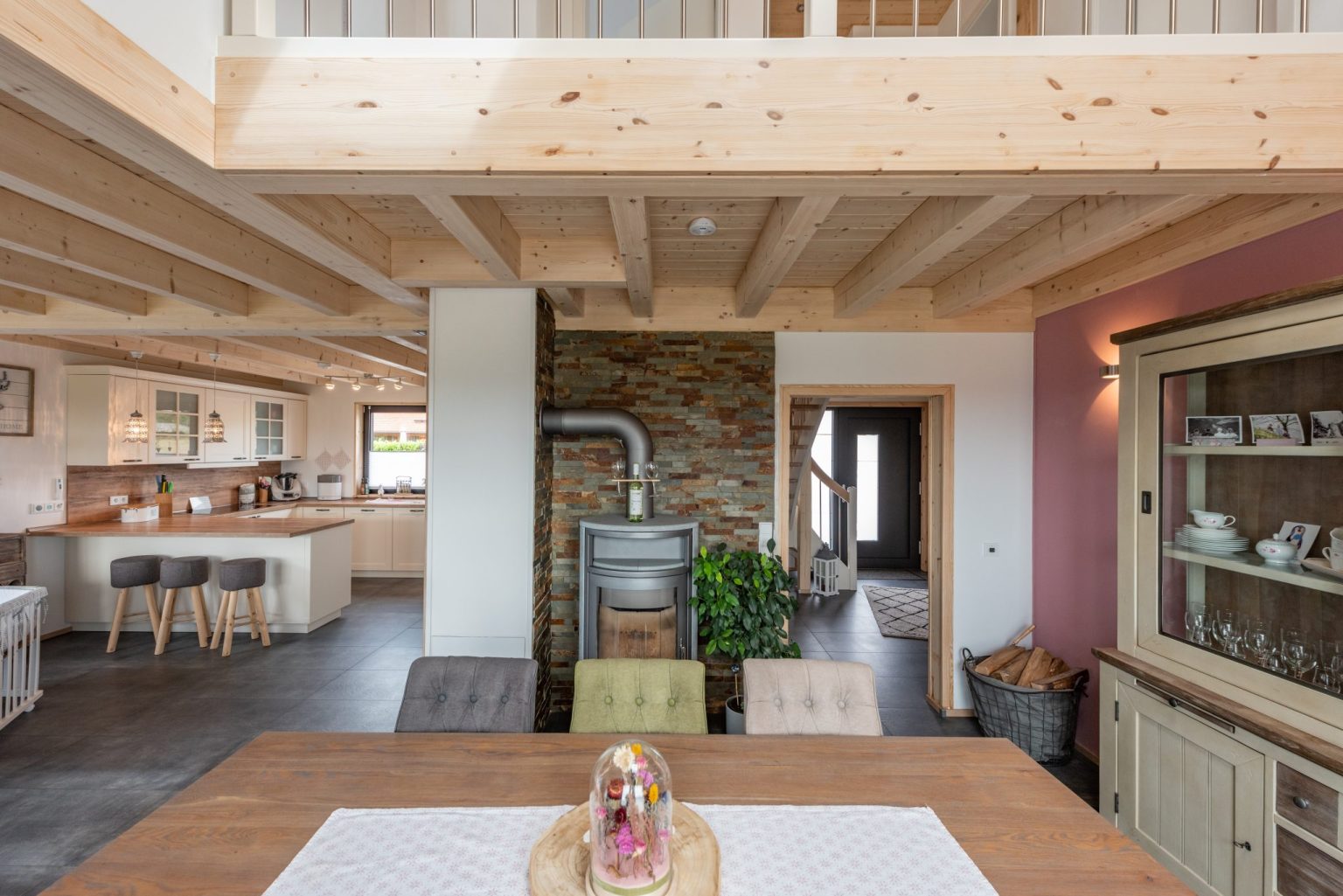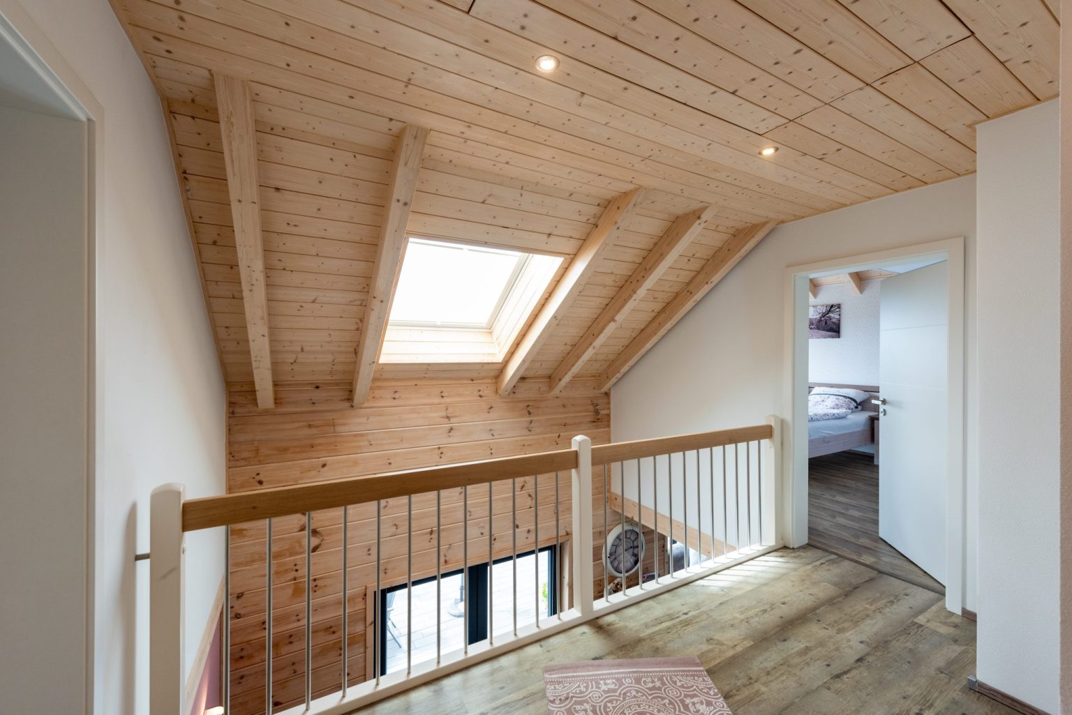 Holzhaus „im Hohen Westerwald“ besitzt einen kompakten, rechteckigen Grundriss, dem an der Terrassenseite durch ein großflächig verglastes Zwerchhaus ein Winkel hinzugefügt wurde. Dieser zweigeschossige Erker mit eigenem Satteldach ergänzt das eineinhalbgeschossige Gebäude mit einem dritten Giebel. Die Kombination von anthrazitfarbenen Elementen (Dacheindeckung, Fensterrahmen, Rollladenkästen, Rollläden und Haustüre) mit den hellen, organischen Blockwänden (Lasur im Farbton „Fichte“), ergibt ein ruhiges, modernes aber auch bodenständiges und heimeliges Bild, das sich im Hausinnern unter Hinzufügen von weißen Elementen (manche Türen, Wände sowie Möbel) fortsetzt. Da kommt der einzige Farbtupfer, in Form eines Wandanstrichs in kräftigem rosé, im Essbereich besonders gut zur Geltung. Sehr harmonisch, lichtdurchflutet und trotz der anthrazitfarbenen Bodenfliesen (im gesamten Erdgeschoss) ohne hart wirkende Kontraste, kommt die Ausstattung drinnen daher. Da im Dachgeschoss kein offener Sichtdachstuhl gewählt wurde, sondern weiß gestrichene Decken und Dachschrägen, ist es dort oben besonders hell. Während im Erdgeschoss neben den Kiefernwänden offene Sichtbalkendecken beeindrucken, besitzt im Dachgeschoss nur das Zwerchhaus einen imposanten Sichtdachstuhl. Hier befindet sich das Schlafzimmer von Isabell und Sascha Held: Ein sehr behaglicher Raum, der von dem schönen Dachstuhl des Zwerchhauses und dessen bodentiefer Verglasung profitiert. Im Erdgeschoss ist der Erker sogar an drei Seiten bodentief verglast, sodass reichlich Licht in die dort befindliche Sofaecke und die offene Küche gelangt. Insgesamt ist der L-förmige offene Wohnbereich (Küche, Wohnzimmer und Esszimmer in einem Raum) gut natürlich belichtet, dafür sorgen die Fenster nach Süden (Terrasse) und Westen sowie der bis zur Dachschräge offene Luftraum über dem Essbereich, wo ein Fensterquadrat im Dach nochmal reichlich Tageslicht hereinlässt. Der Hauseingang von Holzhaus „im Hohen Westerwald“ befindet sich an der Nordseite und führt in eine geräumige Diele mit Treppenaufgang ins Dachgeschoss und Zugängen zum offenen Wohnbereich, zum Hauswirtschaftsraum, der mit der offenen Küche verbunden ist, ins Arbeitszimmer und ins Gäste-Bad/WC. Im Dachgeschoss befinden sich, außer dem Schlafzimmer der Hauseigentümer mit Ankleide en Suite, noch zwei große Kinderzimmer und ein weiteres Badezimmer. Alle Räume sind von der Galerie aus erreichbar und sehr hell.