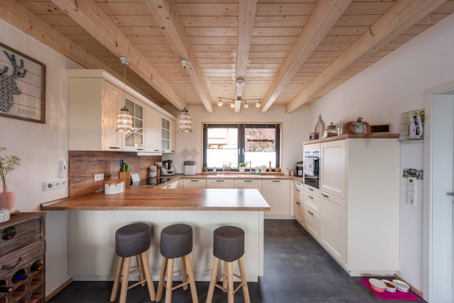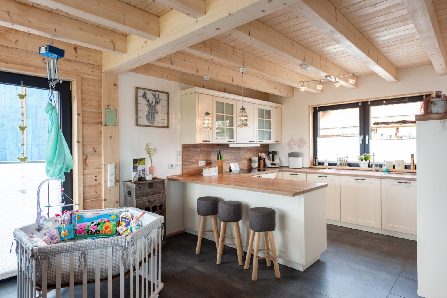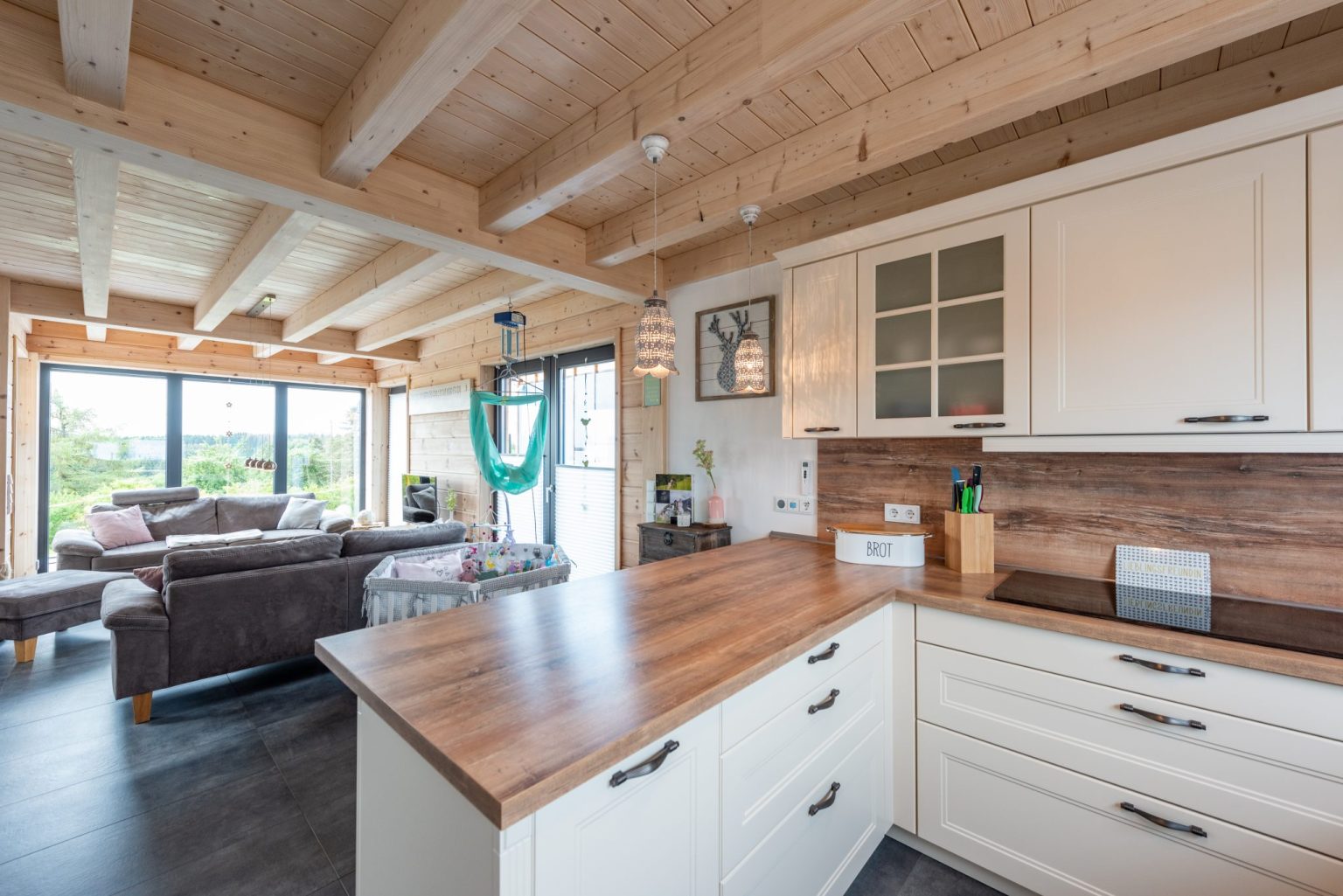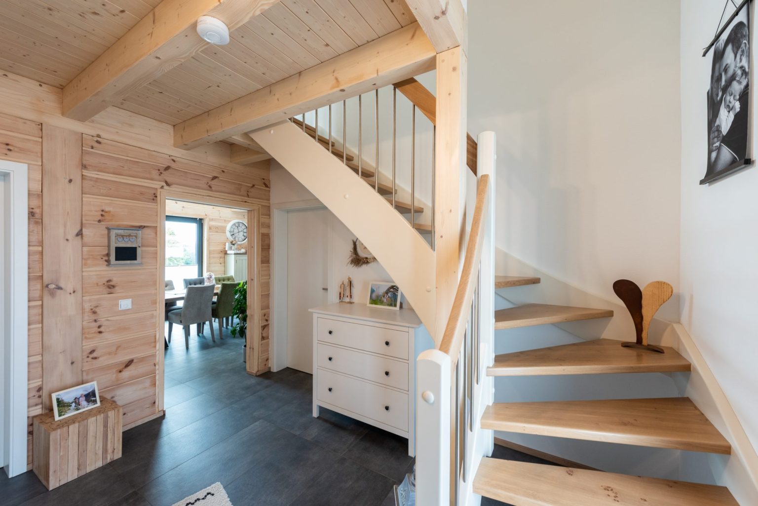„Klimaschutz hatte für uns zum Zeitpunkt des Hausbaus keine große Bedeutung, da es uns damals schwerfiel, das Thema einzuordnen. Ausschlaggebend überhaupt zu Bauen war der Gedanke an Altersvorsorge, weswegen nur ein wertstabiles Haus in solider, langlebiger Bauweise in Frage kam.“, sagt die Hausherrin. Heute erfreuen sie und ihr Mann sich zusätzlich an dem wärmenden und gesunden Wohnklima in ihrem Fullwood Wohnblockhaus und den sehr gut dämmenden Wänden, Fenstern und Dach. „Wir hatten uns für die im Kern gedämmte Kombiblockwand entschieden und für einen Naturfaserdämmstoff.“, fährt die Dame des Hauses fort. „Als Baustufe wählten wir die Ausbauvariante, sodass Fullwood im Prinzip die Haushülle hergestellt hat und wir den gesamten Ausbau selbst durchführen konnten. Die einzelnen Gewerke organisierten wir nicht nur, sondern führten sie im großen Teil sogar selber aus. Unsere Familien, Freunde und Nachbarn haben an unserem Bauprojekt mitgewirkt und uns sehr unterstützt! Durch den hohen Anteil an Eigenleistung und da das Grundstück bereits in unserem Besitz war, konnten wir unser Holzhaus-Projekt umsetzen.“, ergänzt sie. Die Hausmontage an sich dauerte Dank des professionellen Richtmeisters von Fullwood und der vielen Helfer nur vier Tage. Dann begann mit dem Ausbau die zeit- und arbeitsintensive Phase, welche sich rückblickend aber mehr als gelohnt hat: „Letztlich können wir sagen, dass es die richtige Entscheidung war mit Fullwood Wohnblockhaus zu bauen! Der Werkstoff Holz ist gut zu verarbeiten und leicht zu pflegen, seine Optik finden wir besonders ansprechend und die wohltuende Wärme sowie den zarten Duft, den er abgibt – Das erfreut uns täglich auf's Neue. Obschon wir den angenehm frischen Kiefernduft nur noch nach längerer Abwesenheit so richtig wahrnehmen, zum Beispiel nach einer Urlaubsreise. Dies alles sorgt für das einzigartige, angenehme Wohnklima, das uns noch heute an unserem Holzhaus gefällt.“, schwärmt Isabell Held. Jederzeit wieder würden sie und ihr Mann Sascha mit Fullwood bauen, so glücklich sind die beiden heute in ihrem Haus und so zufrieden waren sie sowohl mit der individuell abgestimmten Haus- und Bauplanung als auch mit der guten Betreuung während der Bauphase. „Es gab tatsächlich keinerlei nennenswerte Probleme. Wenn kleinere Probleme auftraten, konnten diese zusammen mit Fullwood schnell und unkompliziert gelöst werden.“, betont die Hauseigentümerin.
