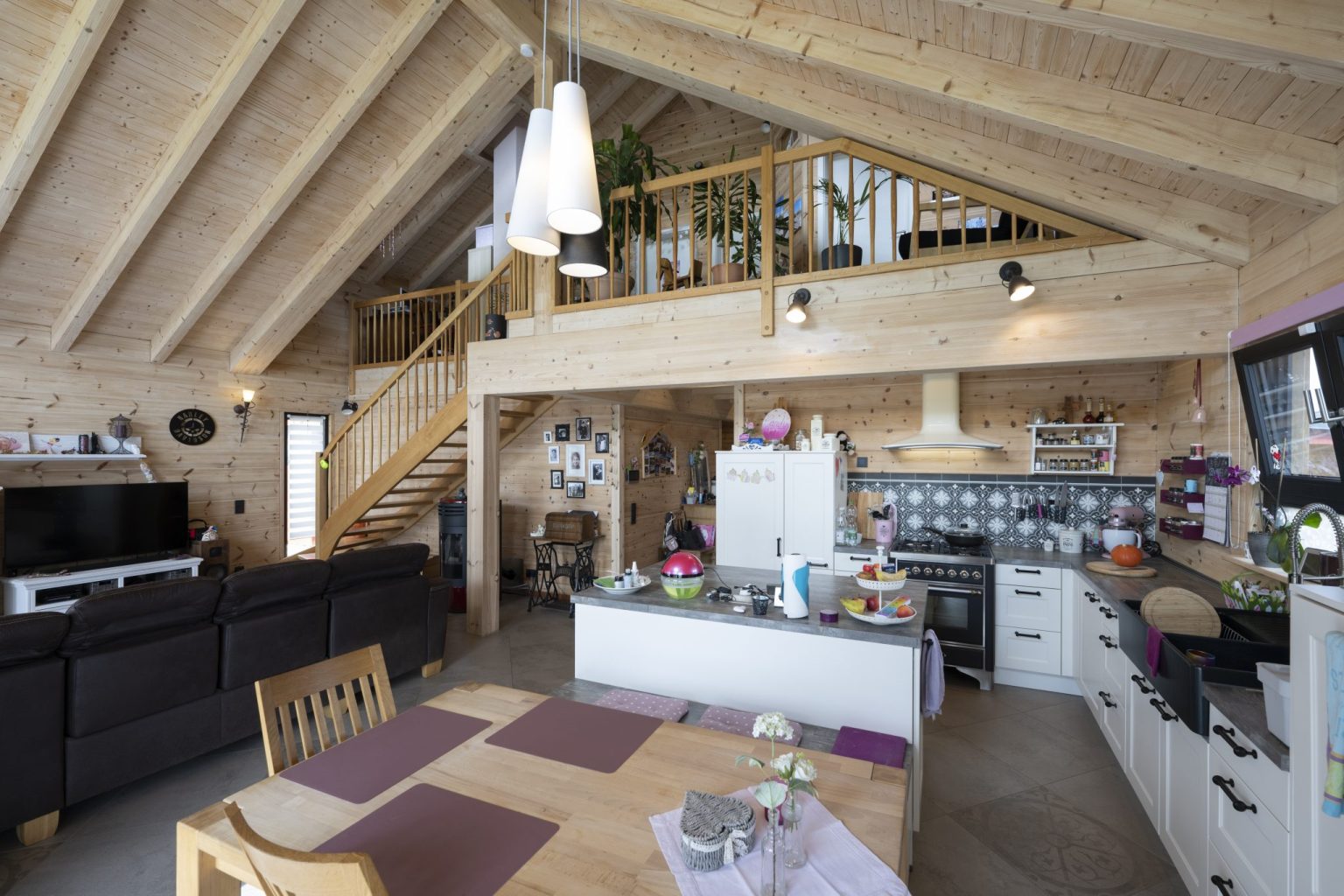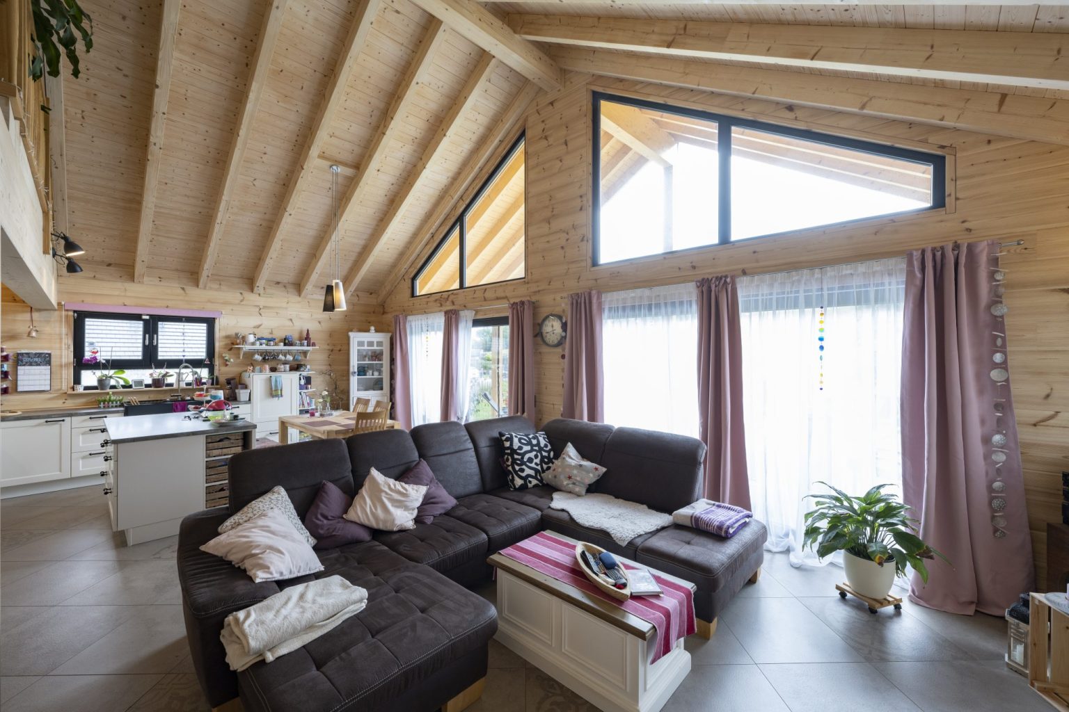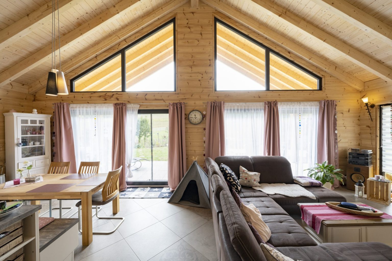 Nach Aussage der Eigentümer von Holzhaus „im Jagsttal“ hatten diese in ihrem Altbau fast doppelt so hohe Heizkosten trotz halb so großer Wohnfläche. Allein diese Tatsache spricht schon für ein modernes Fullwood Wohnblockhaus. Aber auch in Punkto Ökologie und Nachhaltigkeit sowie Wohngesundheit trumpfen die Häuser des deutschen Holzhaus Spezialisten auf. Beheizt wird das Gebäude mittels Fußbodenheizung mit einem Pelletofen und das Warmwasser in Küche und Badezimmer per Durchlauferhitzer. Die Installation einer PV-Anlage steht bevor. Freilich leisten auch die Wärmeschutzfenster und die Dachdämmung ihre Beiträge zu dem unerwartet niedrigen Heizenergieverbrauch. Unerwartet deshalb, weil theoretische Berechnungen des Jahresprimärenergiebedarfs stets höher liegen als der tatsächliche Bedarf am Ende ist. Dies liegt auch am psychologischen Effekt der Holzwände: die gefühlte Temperatur ist 2-3 Grad Celsius höher, was einen großen Unterschied beim Heizen macht. Neben der wohlig warmen Atmosphäre in ihrem Holzhaus schwärmen die Bewohner außerdem vom feinen Duft der chemisch unbehandelten Polarkiefernwände. Damit diese schön naturhell bleiben, wurden sie drinnen von den Hauseigentümern eigenhändig mit UV-Schutzlasur gestrichen und außen mit einem leicht aufhellenden Schutzanstrich versehen. So haben Nachdunkeln und Vergrauen keine Chance. Da die Hausbesitzer generell helle Räume aber auch viel Holz mögen, verkleideten sie auch die Trennwände (leichter Ständerbau) mit Kiefernholz, ließen den Dachstuhl offen sichtbar, wählten offene Sichtbalkendecken, entschieden sich für Holzfenster (Merantie) und bauten bodentiefe Fenster an der kompletten Giebelseite zum Garten ein. So verwöhnt reichlich natürliches Licht den offenen Wohnbereich, den Flur und die Galerie im Dachgeschoss.