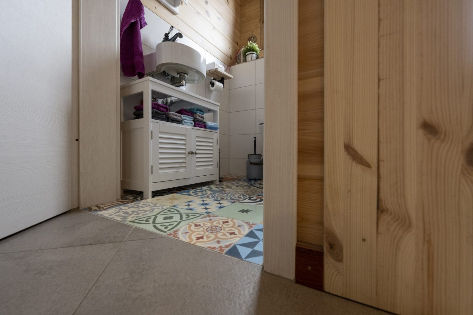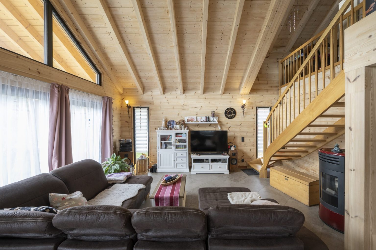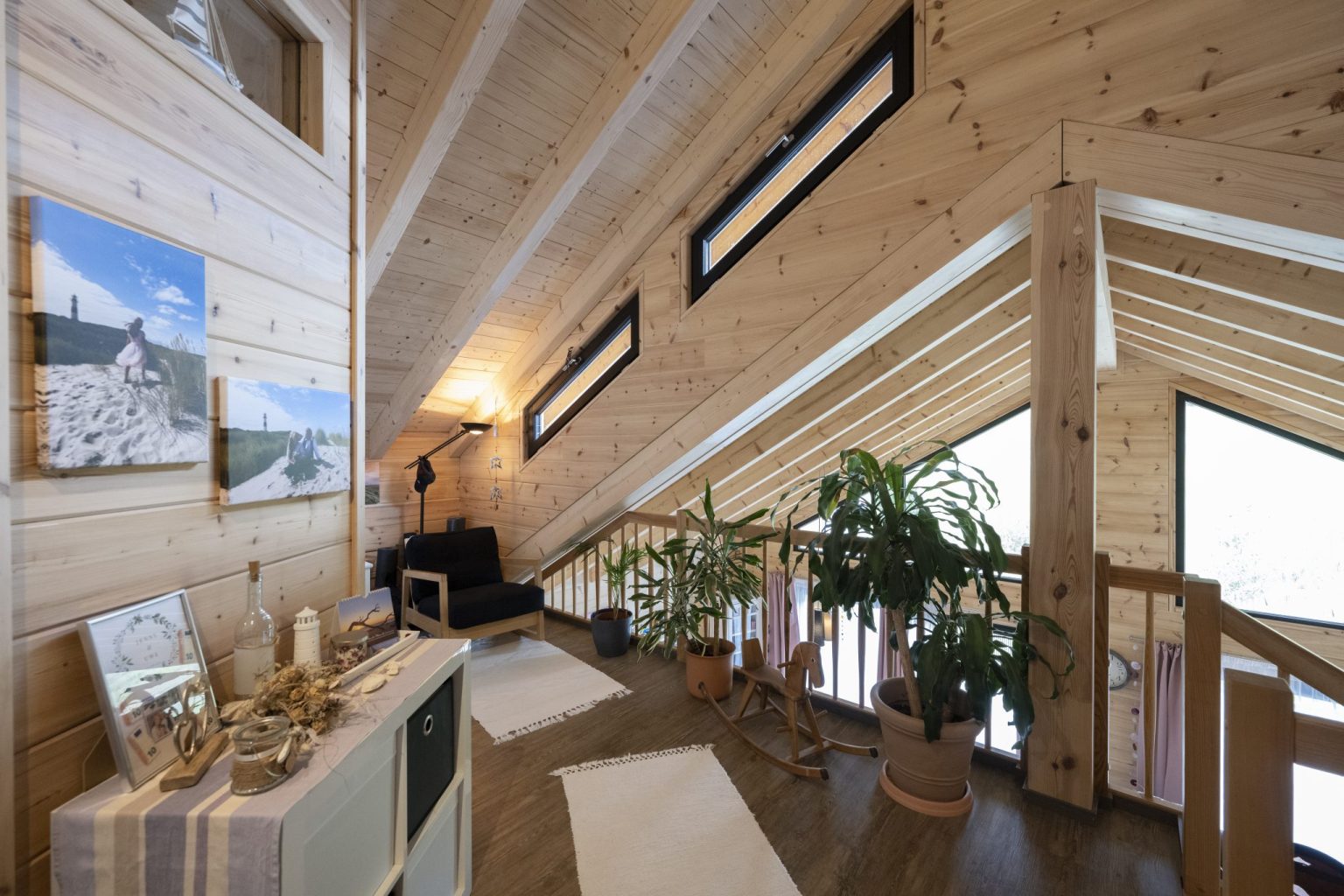 Nach Aussage der Eigentümer von Holzhaus „im Jagsttal“ hatten diese in ihrem Altbau fast doppelt so hohe Heizkosten trotz halb so großer Wohnfläche. Allein diese Tatsache spricht schon für ein modernes Fullwood Wohnblockhaus. Aber auch in Punkto Ökologie und Nachhaltigkeit sowie Wohngesundheit trumpfen die Häuser des deutschen Holzhaus Spezialisten auf. Beheizt wird das Gebäude mittels Fußbodenheizung mit einem Pelletofen und das Warmwasser in Küche und Badezimmer per Durchlauferhitzer. Die Installation einer PV-Anlage steht bevor. Freilich leisten auch die Wärmeschutzfenster und die Dachdämmung ihre Beiträge zu dem unerwartet niedrigen Heizenergieverbrauch. Unerwartet deshalb, weil theoretische Berechnungen des Jahresprimärenergiebedarfs stets höher liegen als der tatsächliche Bedarf am Ende ist. Dies liegt auch am psychologischen Effekt der Holzwände: die gefühlte Temperatur ist 2-3 Grad Celsius höher, was einen großen Unterschied beim Heizen macht. Neben der wohlig warmen Atmosphäre in ihrem Holzhaus schwärmen die Bewohner außerdem vom feinen Duft der chemisch unbehandelten Polarkiefernwände. Damit diese schön naturhell bleiben, wurden sie drinnen von den Hauseigentümern eigenhändig mit UV-Schutzlasur gestrichen und außen mit einem leicht aufhellenden Schutzanstrich versehen. So haben Nachdunkeln und Vergrauen keine Chance. Da die Hausbesitzer generell helle Räume aber auch viel Holz mögen, verkleideten sie auch die Trennwände (leichter Ständerbau) mit Kiefernholz, ließen den Dachstuhl offen sichtbar, wählten offene Sichtbalkendecken, entschieden sich für Holzfenster (Merantie) und bauten bodentiefe Fenster an der kompletten Giebelseite zum Garten ein. So verwöhnt reichlich natürliches Licht den offenen Wohnbereich, den Flur und die Galerie im Dachgeschoss.