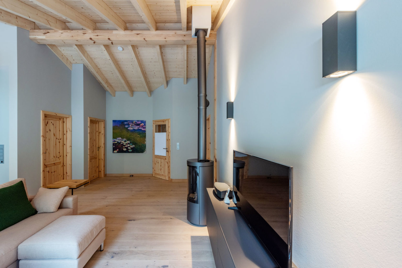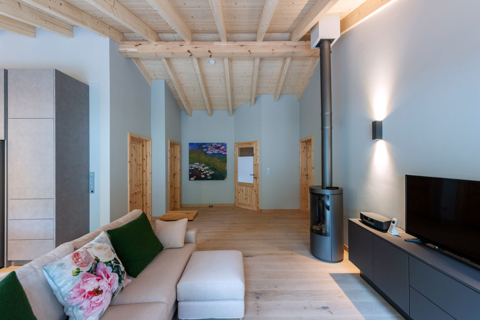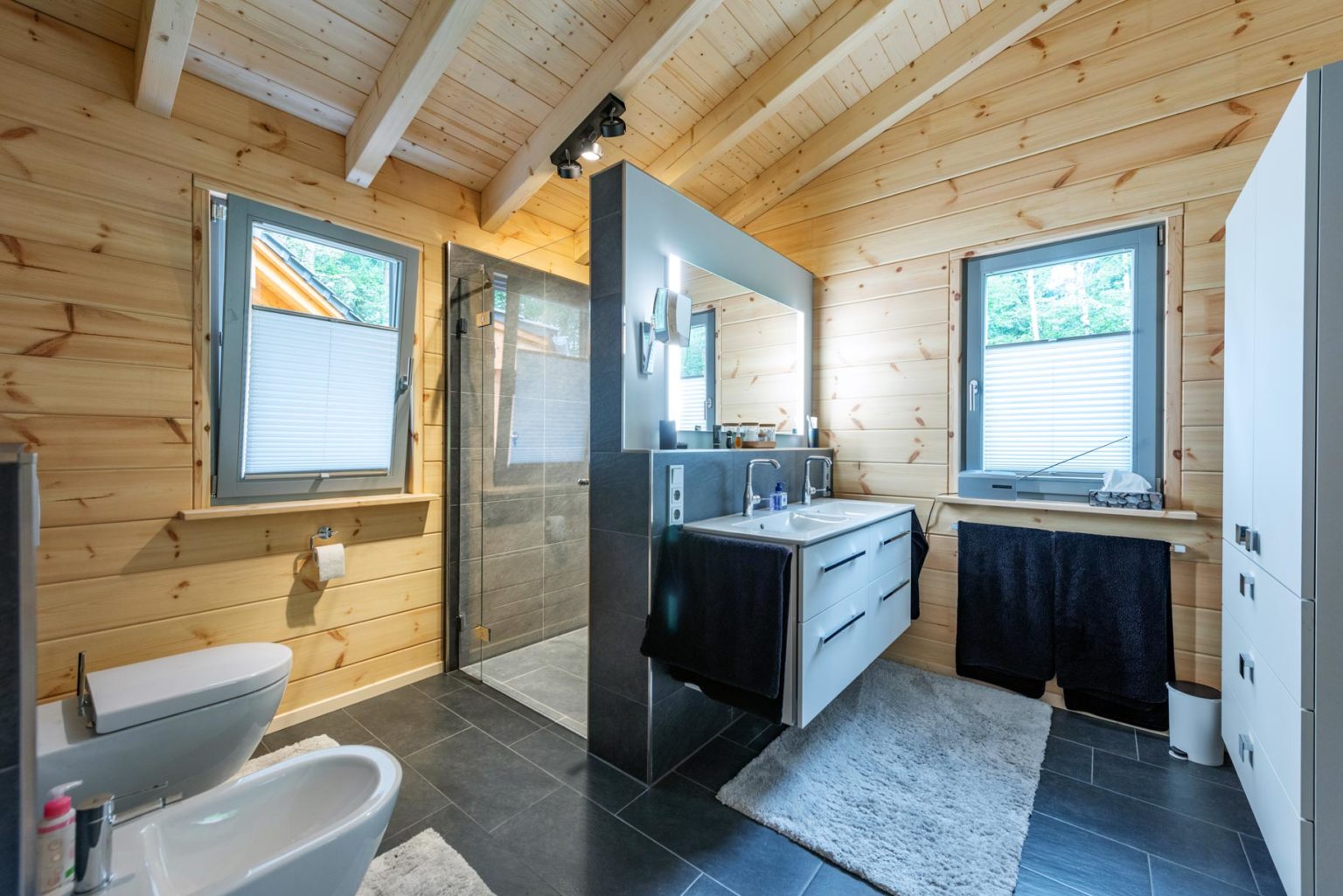 Nachdem die wenigen Wandelemente, Balken und restlichen Bauteile passgenau im Werk vorgefertigt wurden, kamen sie termingetreu auf dem Bauplatz an und wurden in drei Tagen von den Fullwood-Profis montiert. Darauf folgte dann die Dacheindeckung, der Fenstereinbau und das Stellen der Innenwände. Da auch die Baustufe bei Fullwood individuell an die Bedürfnisse der Bauherrschaft angepasst wird, hatte sich diese im Vorfeld für eine „Vollmontage“ entschieden, bei der man sich um nichts kümmern muss. Alles klappte perfekt und zur vollsten Zufriedenheit der Hauseigentümer! Für die anschließenden Ausbauarbeiten engagierte das Ehepaar dann selber örtliche Fachhandwerksfirmen. Beheizt wird Holzhaus „im Wald“ über eine Fußbodenheizung, die mit Gas betrieben wird.
