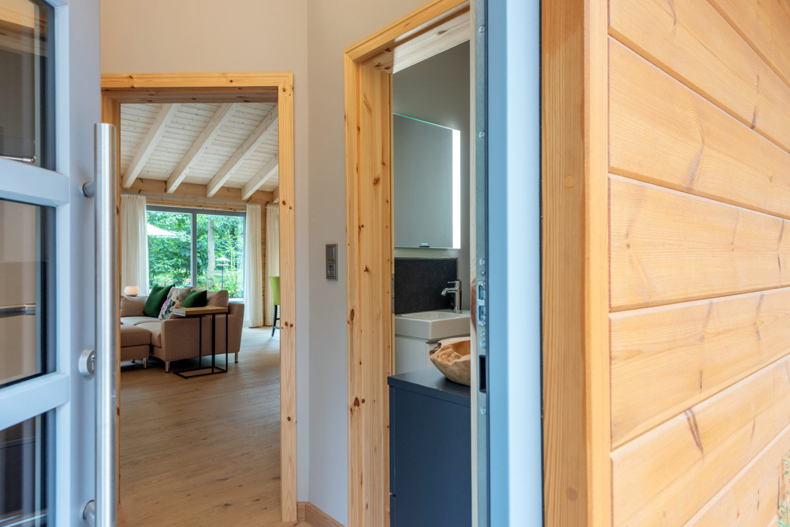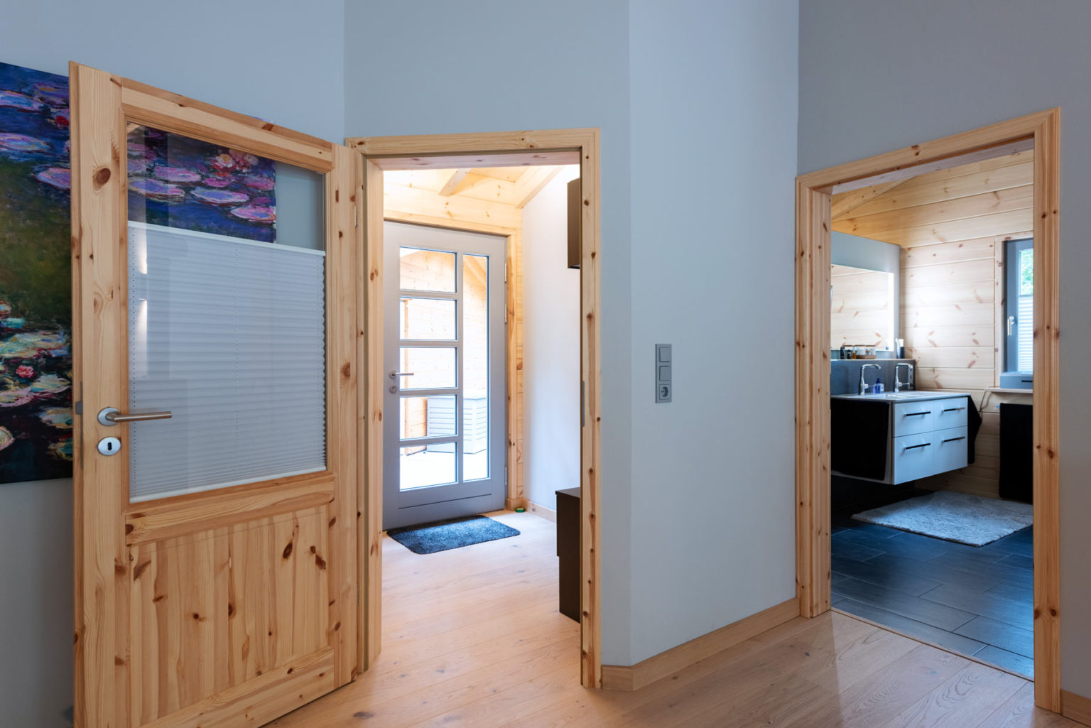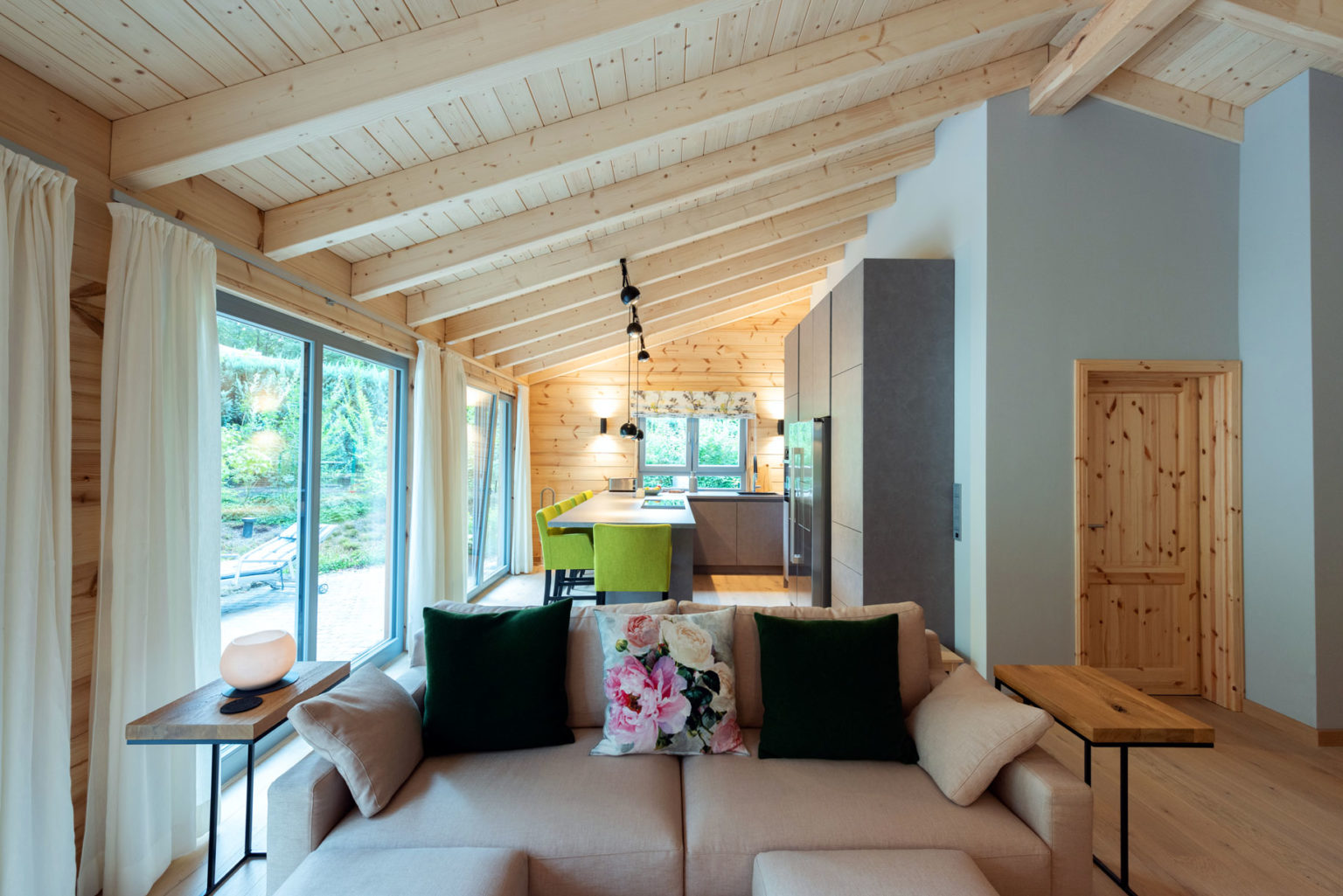 Der schlichte, rechteckige Grundriss mit sehr hohen Decken (Dachschrägen) und bis zur sichtbaren Firstpfette offenem Luftraum beinhaltet einen kleinen, geschlossenen Flur (Windfang); einen offenen Wohnbereich mit Küche, Essbereich und Sofaecke; ein großes Badezimmer mit angeschlossenem Schlafzimmer; ein Gästezimmer; einen Hauswirtschaftsraum und ein Gäste-WC. Bis auf das Gäste-WC sind alle Zimmer vom Wohnbereich aus zugänglich, wobei das Schlafzimmer ausschließlich durch das große Bad erreichbar ist. Die Traufseite des Wohnbereichs ist an der gesamten Länge zu Terrasse und Garten hin fast vollständig bodentief und Wand-hoch verglast. Der Übergang von drinnen nach draußen ist somit komplett transparent und – besonders bei geöffneten Fenstertüren im Sommer – fließend. Auf Wunsch der Eigentümer schmücken offene Sichtbalken die hohen Dachschrägen. Sämtliche Holzwände, -balken und -verschalungen wurden mit aufhellendem UV-Schutz gegen Nachdunkeln behandelt. So bleibt das Polarkiefernholz so hell, als sei es frisch gefällt. Damit es dem Eigentümerpaar nicht doch zu viel Holz wird – denn sogar die Fußböden sind mit fußwarmen, hell gebleichten Eichenholzdielen versehen – wählten sie tapezierte Trennwände (leichte Ständerbauweise) mit hellem Farbanstrich im Hausinnern. Das lockert auf und unterstreicht die moderne, geradlinige (Innen-) Architektur von Holzhaus „im Wald“. Außen wurden die Blockwände in einem warmen Kiefernton gestrichen, der den natürlichen Vergrauungseffekt des Holzes verhindert. Für die Fenster und Haustüre suchten die Hausbesitzer ein zeitloses hellgrau aus, das mit den schiefergrauen Tondachziegeln harmoniert und kombinierten drinnen Türen aus hellem Kiefernholz dazu.