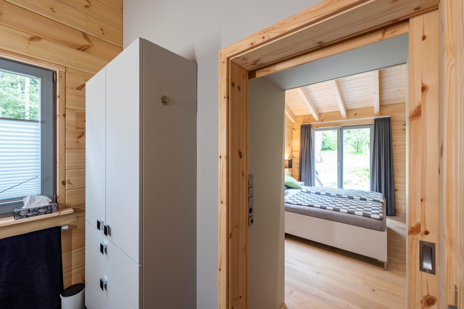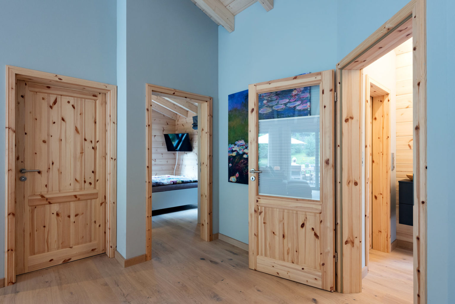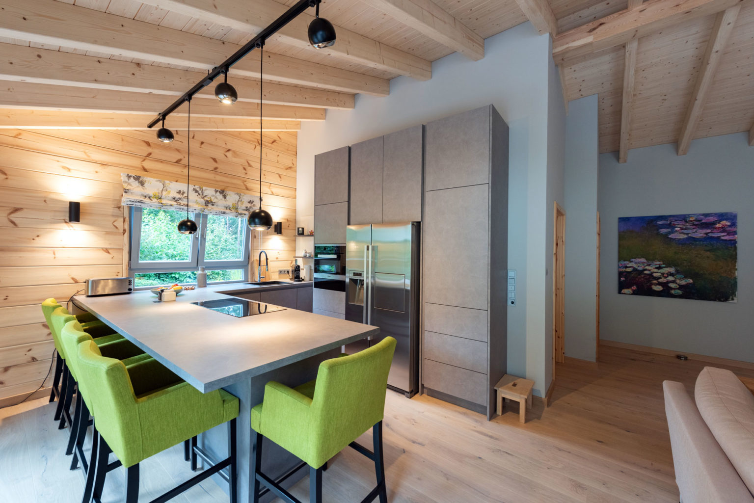Der schlichte, rechteckige Grundriss mit sehr hohen Decken (Dachschrägen) und bis zur sichtbaren Firstpfette offenem Luftraum beinhaltet einen kleinen, geschlossenen Flur (Windfang); einen offenen Wohnbereich mit Küche, Essbereich und Sofaecke; ein großes Badezimmer mit angeschlossenem Schlafzimmer; ein Gästezimmer; einen Hauswirtschaftsraum und ein Gäste-WC. Bis auf das Gäste-WC sind alle Zimmer vom Wohnbereich aus zugänglich, wobei das Schlafzimmer ausschließlich durch das große Bad erreichbar ist. Die Traufseite des Wohnbereichs ist an der gesamten Länge zu Terrasse und Garten hin fast vollständig bodentief und Wand-hoch verglast. Der Übergang von drinnen nach draußen ist somit komplett transparent und – besonders bei geöffneten Fenstertüren im Sommer – fließend. Auf Wunsch der Eigentümer schmücken offene Sichtbalken die hohen Dachschrägen. Sämtliche Holzwände, -balken und -verschalungen wurden mit aufhellendem UV-Schutz gegen Nachdunkeln behandelt. So bleibt das Polarkiefernholz so hell, als sei es frisch gefällt. Damit es dem Eigentümerpaar nicht doch zu viel Holz wird – denn sogar die Fußböden sind mit fußwarmen, hell gebleichten Eichenholzdielen versehen – wählten sie tapezierte Trennwände (leichte Ständerbauweise) mit hellem Farbanstrich im Hausinnern. Das lockert auf und unterstreicht die moderne, geradlinige (Innen-) Architektur von Holzhaus „im Wald“. Außen wurden die Blockwände in einem warmen Kiefernton gestrichen, der den natürlichen Vergrauungseffekt des Holzes verhindert. Für die Fenster und Haustüre suchten die Hausbesitzer ein zeitloses hellgrau aus, das mit den schiefergrauen Tondachziegeln harmoniert und kombinierten drinnen Türen aus hellem Kiefernholz dazu.