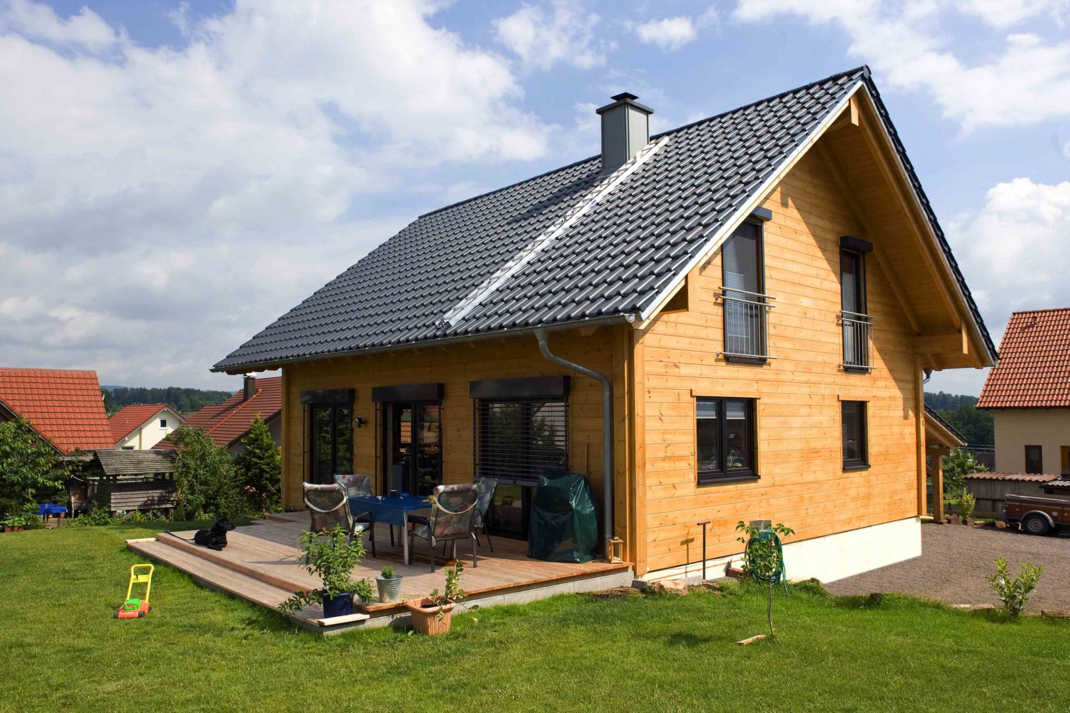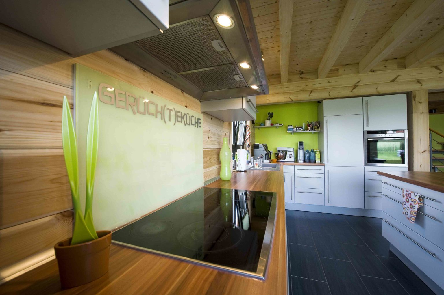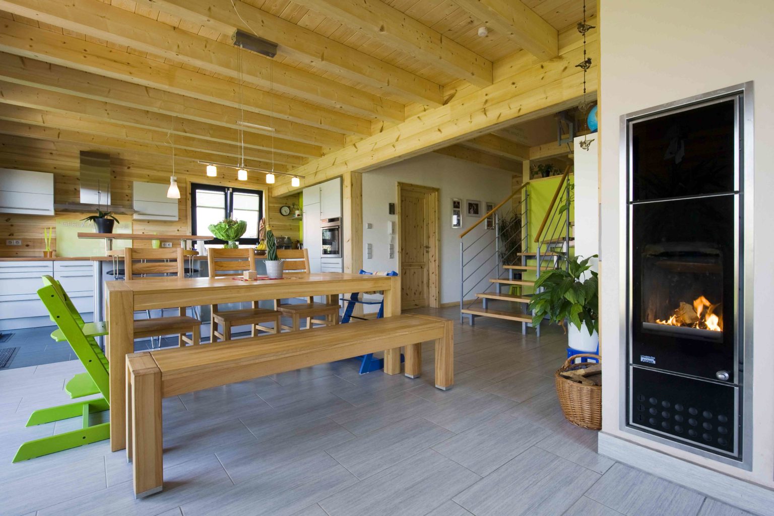 Natürlich sind der Familie die wärmenden Sonnenstrahlen sehr willkommen für ihre auf dem Holzhaus Dach installierte Solaranlage zur Warmwasserbereitung. Diese speist neben Küche und Bad auch die Fußbodenheizung. Zusätzlich wird mit Pellets und Scheitholz im Kombinationsofen beheizt. Und als weiterer Umweltbeitrag, der nebenbei auch noch Geld spart, wird Regenwasser gesammelt und für Toilette, Waschmaschine und Garten genutzt. Hier hat man die Zukunft immer im Blick, wie es sich für eine moderne, zeitgemäß lebende und verantwortungsvolle Familie gehört! Neben allen vernünftigen, sachlichen und funktionalen Überlegungen ist es den Holzhaus Besitzern zudem gelungen, ein optisch ansprechendes und ausgewogenes Heim zu schaffen, dessen individuelle Gestaltung von gutem Geschmack zeugt.