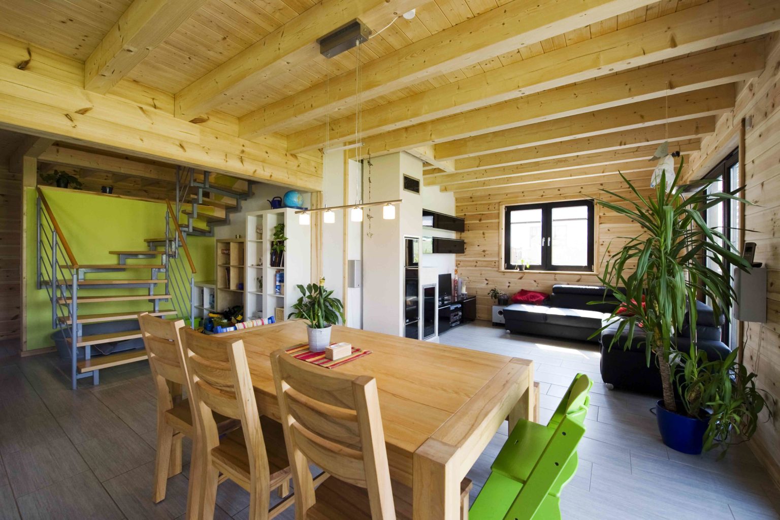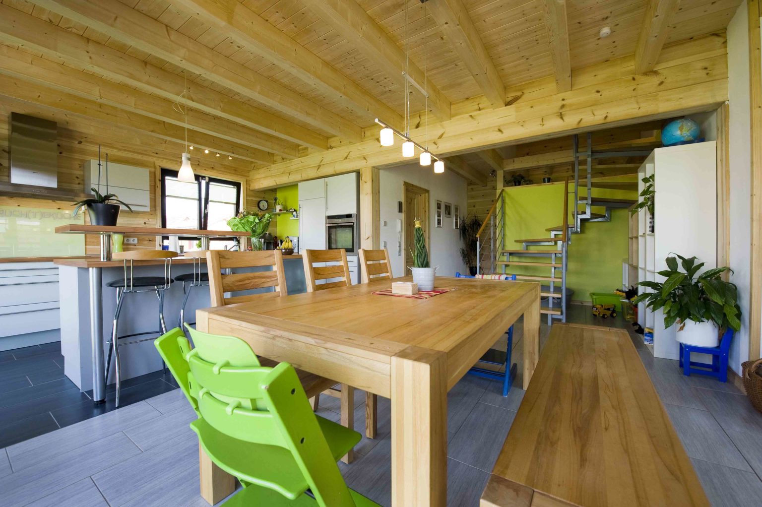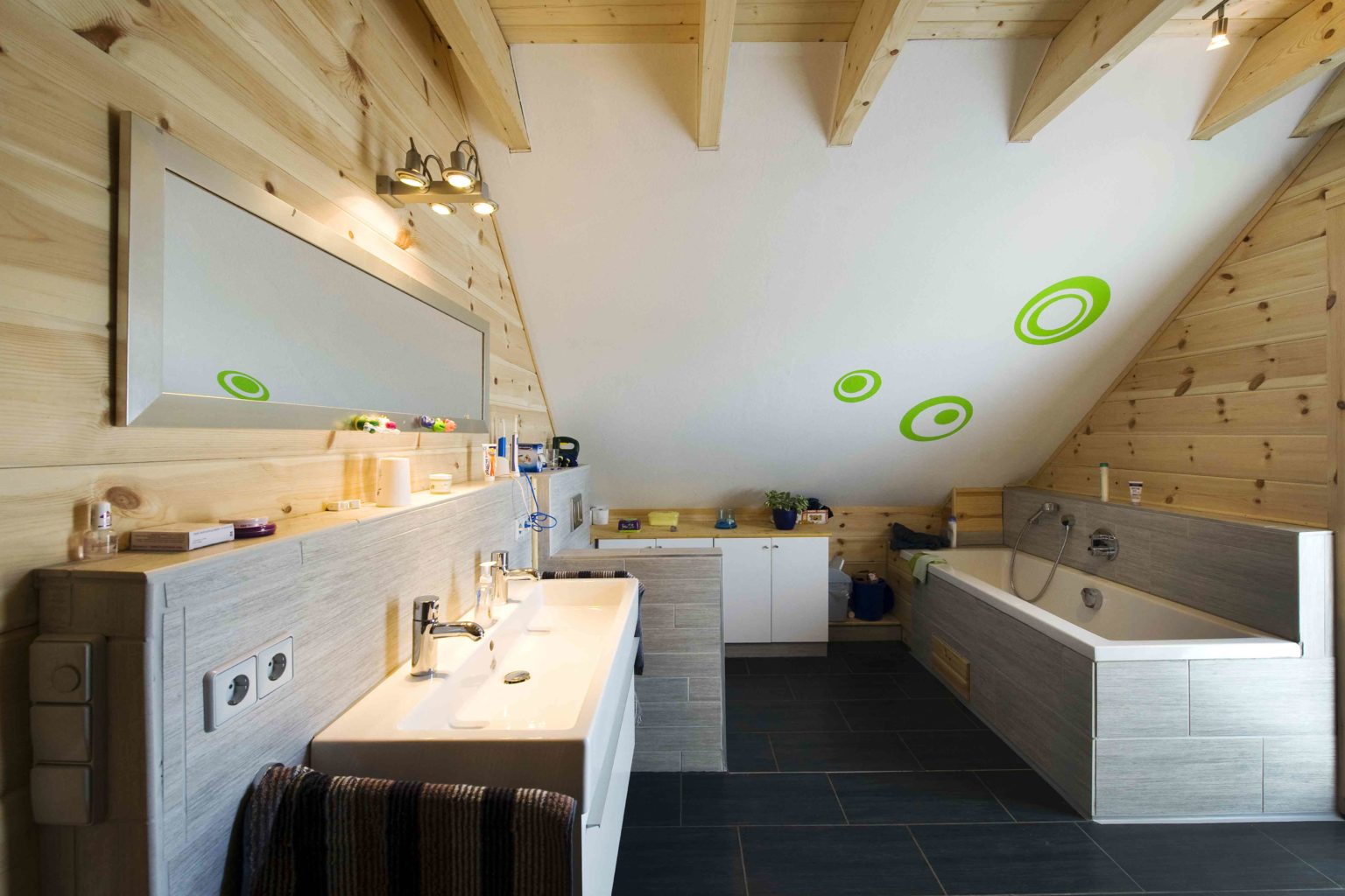Klare Linien und kubische Formen lassen den Wohnbereich geordnet und ruhig wirken. Der helle, warme Naturholz-Ton der Wände gleicht das zurückhaltende Hellgrau der gefliesten Böden aus; die teilweise weiß verputzten Trennwände aus Ständerwerk bringen zusätzliche Helligkeit und Leichtigkeit hinein; und das knallige, frische Apfelgrün der restlichen Trennwände bringt Schwung ins Haus. Das Schwarz der Fensterrahmen findet sich im Sofa und dem Kaminofen wieder, während einzelne rote Farbtupfer das Ganze aufpeppen. Durchs gesamte Haus ziehen sich diese Farben und Formen und bewirken, neben dem angenehmen Raumklima, das in massiven Holzhäuser von Fullwood herrscht, eine angenehme Atmosphäre. Um eine optimale räumliche Nutzung zu erhalten, wurden die Holzbalken-Decken sowohl im Erdgeschoss als auch im Dachgeschoss in „normaler“ Höhe gewählt, ohne offenen Luftraum, welcher Platz im Dachgeschoss genommen hätte, und ohne Sicht bis zum First, denn ein Dachboden zum Krabbeln war den Hauseigentümern als zusätzlicher Stauraum wichtig. Sämtliche Dachschrägen wurden weiß tapeziert, damit auch hier nichts optisch drückt. Auf einen Keller, der dank leichter Hanglage gut belichtet und vielseitig nutzbar ist, legte man gleichfalls Wert, denn bei fünf Personen und einem Hund kommt einiges zusammen.