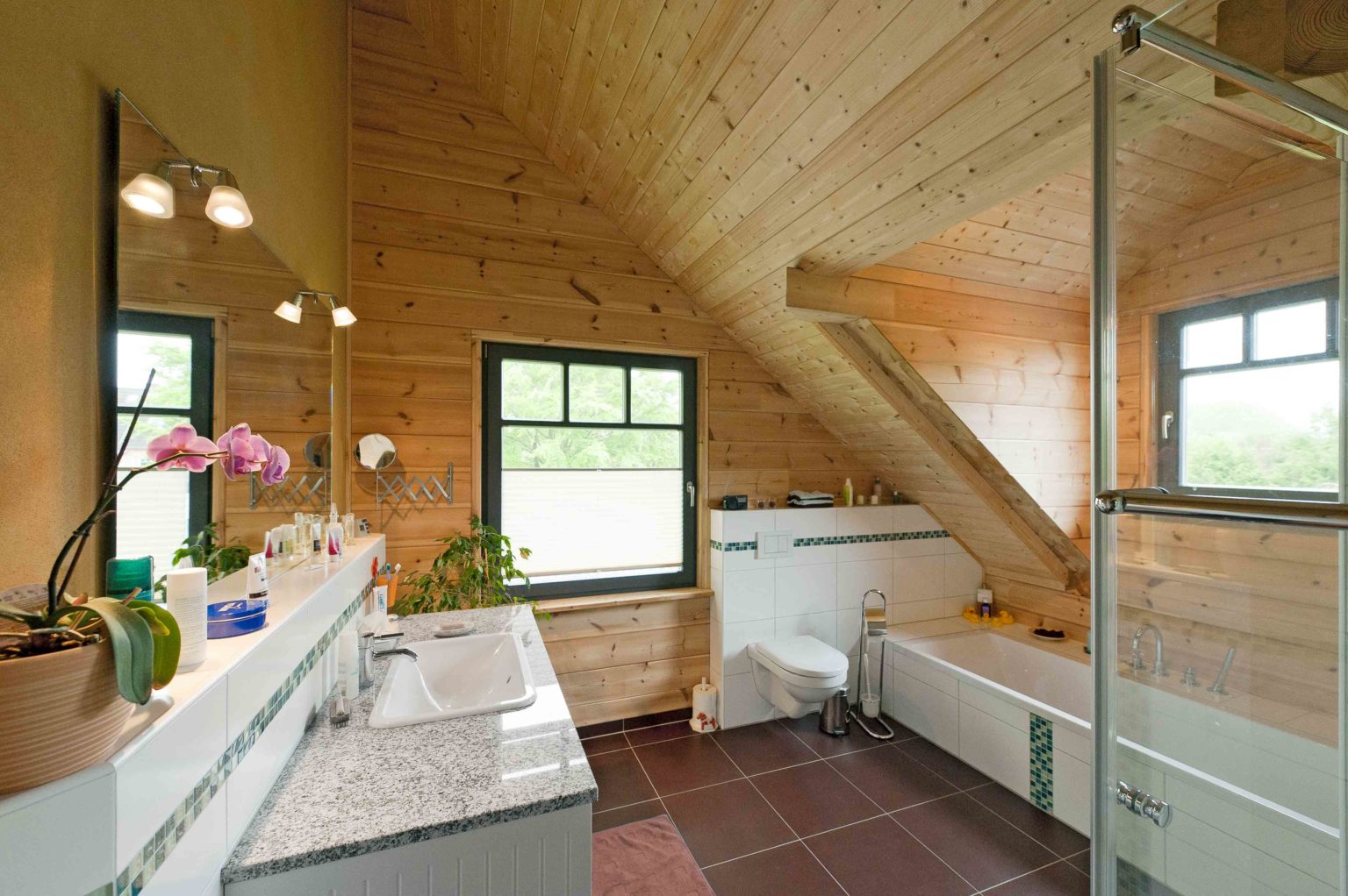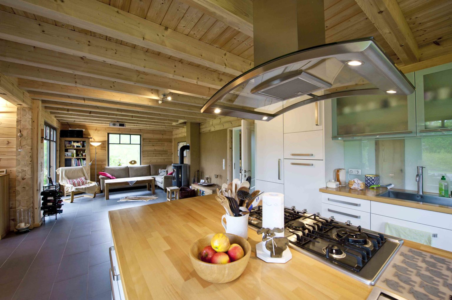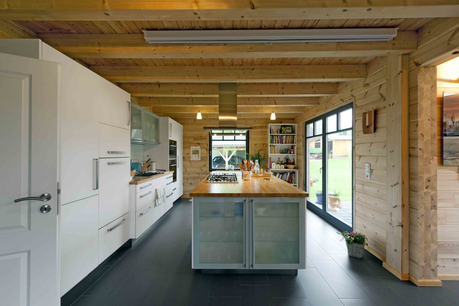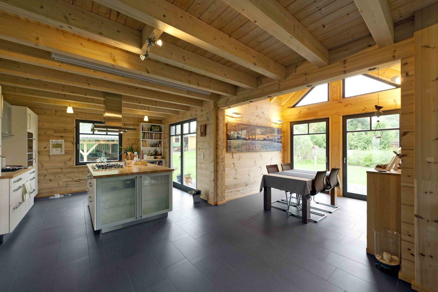Zusammen mit einem befreundeten Bauingenieur entwarfen die Hauseigentümer ihr Holzhaus ganz nach den eigenen Vorstellungen, so dass die Holzhaus Firma nur noch zu prüfen und zu erarbeiten brauchte, was machbar war. Ein helles Heim mit viel Tageslicht wünschten sich die Holzhaus Besitzer, weshalb sie an der Südseite ihres Holzhauses große, bodentiefe Glasflächen einsetzten. Das bringt nicht nur ein Maximum an Sonnenlicht, sondern spart auch Heizenergie im Winter, wenn die tiefer stehende Sonne hereinscheint. Für das Ehepaar stand von vorneherein die Entscheidung für eine offene Küche fest, sodass auch beim Kochen die Kommunikation mit Gästen möglich ist. So entstand gleichzeitig ein großzügiger Wohnbereich, in dem Küche, Esszimmer und Sofaecke fließend ineinander übergehen. Besonders schön: Der Esstisch befindet sich im angeschlossenen Zwerchhaus, das nach Süden hin fast komplett verglast ist. Ganz konsequent wählte das Eigentümerpaar überwiegend Naturmaterialien für Ausbau, Dekoration und Möbel aus. Heute freuen die beiden sich besonders über die unnachahmliche Behaglichkeit, die von den massiven Kiefernwänden ausgeht, und empfinden die gefühlte Temperatur in ihrem Hause deutlich höher als beispielsweise in konventionellen Steinhäusern. Kein Wunder, da Holz eine höhere Oberflächentemperatur hat und allein rein optisch „wärmt“. Während die Holzwände im Innenbereich lediglich mit UV-Schutz gegen Nachdunkeln behandelt wurden, trug man außen einen Schutzanstrich mit minimaler weißer Pigmentierung auf, der Holzhaus „Kieler Förde“ noch einen Tick heller erscheinen lässt und gleichzeitig vor unerwünschter Vergrauung schützt. Dieser Anstrich wurde aus rein ästhetischen Gründen vorgenommen und ist für die Wertbeständigkeit und Lebensdauer der Massivholzwände nicht notwendig.