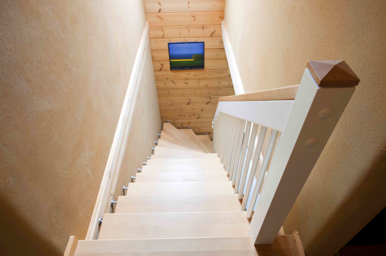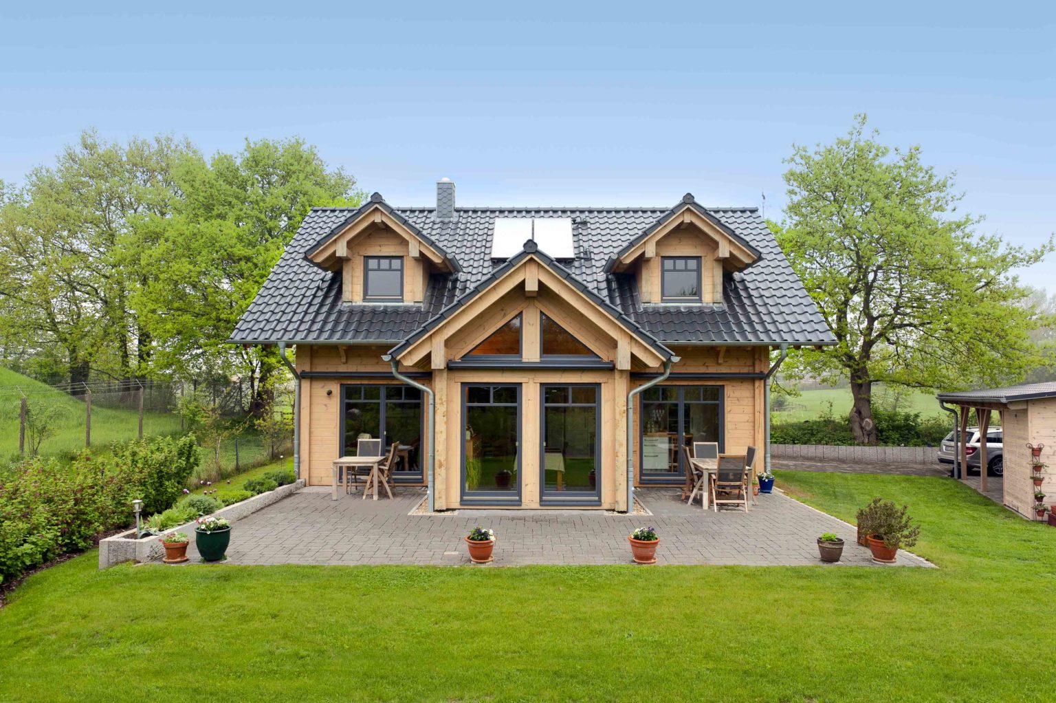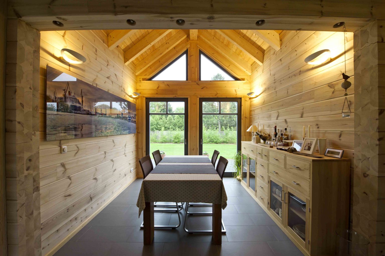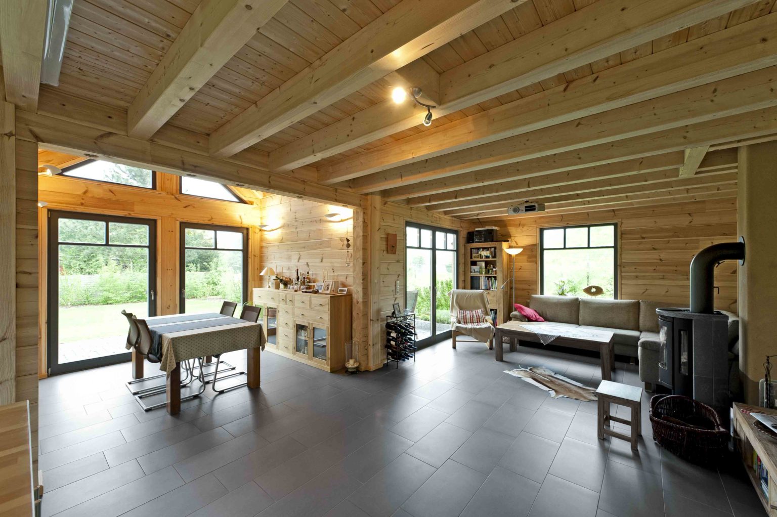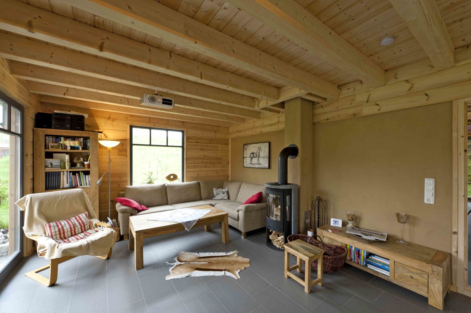 Zusammen mit einem befreundeten Bauingenieur entwarfen die Hauseigentümer ihr Holzhaus ganz nach den eigenen Vorstellungen, so dass die Holzhaus Firma nur noch zu prüfen und zu erarbeiten brauchte, was machbar war. Ein helles Heim mit viel Tageslicht wünschten sich die Holzhaus Besitzer, weshalb sie an der Südseite ihres Holzhauses große, bodentiefe Glasflächen einsetzten. Das bringt nicht nur ein Maximum an Sonnenlicht, sondern spart auch Heizenergie im Winter, wenn die tiefer stehende Sonne hereinscheint. Für das Ehepaar stand von vorneherein die Entscheidung für eine offene Küche fest, sodass auch beim Kochen die Kommunikation mit Gästen möglich ist. So entstand gleichzeitig ein großzügiger Wohnbereich, in dem Küche, Esszimmer und Sofaecke fließend ineinander übergehen. Besonders schön: Der Esstisch befindet sich im angeschlossenen Zwerchhaus, das nach Süden hin fast komplett verglast ist. Ganz konsequent wählte das Eigentümerpaar überwiegend Naturmaterialien für Ausbau, Dekoration und Möbel aus. Heute freuen die beiden sich besonders über die unnachahmliche Behaglichkeit, die von den massiven Kiefernwänden ausgeht, und empfinden die gefühlte Temperatur in ihrem Hause deutlich höher als beispielsweise in konventionellen Steinhäusern. Kein Wunder, da Holz eine höhere Oberflächentemperatur hat und allein rein optisch „wärmt“. Während die Holzwände im Innenbereich lediglich mit UV-Schutz gegen Nachdunkeln behandelt wurden, trug man außen einen Schutzanstrich mit minimaler weißer Pigmentierung auf, der Holzhaus „Kieler Förde“ noch einen Tick heller erscheinen lässt und gleichzeitig vor unerwünschter Vergrauung schützt. Dieser Anstrich wurde aus rein ästhetischen Gründen vorgenommen und ist für die Wertbeständigkeit und Lebensdauer der Massivholzwände nicht notwendig.