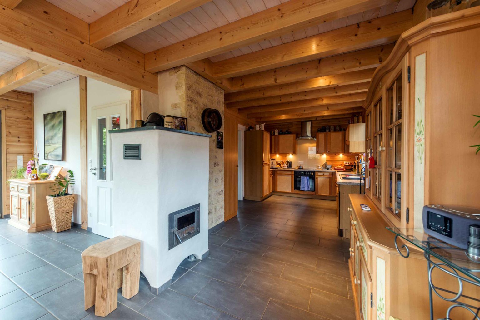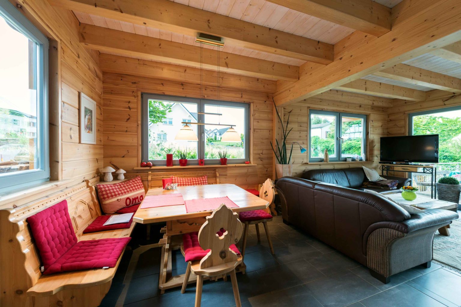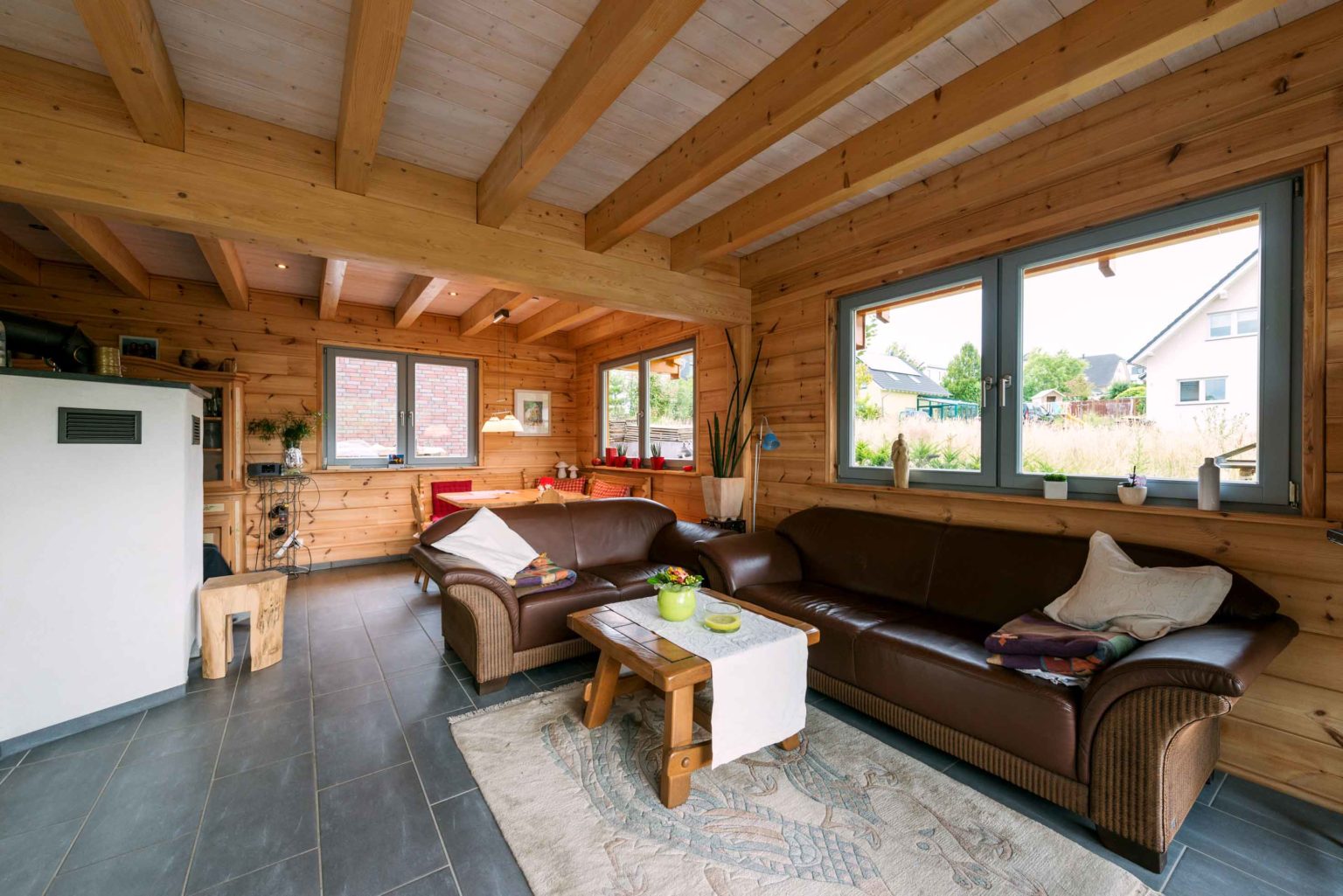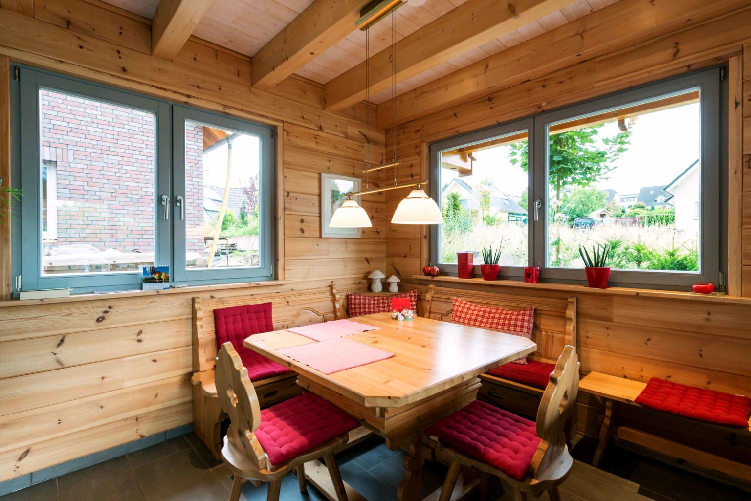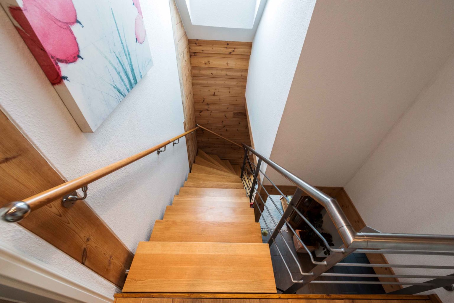 ​Im Erdgeschoss und im Untergeschoss von Holzhaus „Kirchturmblick“ verlegten die Fliesenleger einheitlich hellgraue Fliesen, die wunderbar zu den Fenstern passen und einen Ausgleich zur warmen Holzfarbe bringen. Die Geschosstreppe aus Edelstahl und Eichentritten sowie Eichenhandlauf entlang der Wand nimmt das Material- und Farbkonzept von außen auf – ihre Schweißnähte sind bewusst sichtbar gehalten. Im Dachgeschoss dominieren weiß verputzte Wände, dafür wurden Eichendielen verlegt, außer im Badezimmer. Oben befinden sich ein sehr großes Schlafzimmer, ein Gästezimmer – dort schlafen immer die Enkelkinder - und ein geräumiges Badezimmer, während das Erdgeschoss mit einer großzügigen Diele, einem Gäste-WC und einem L-förmigen, offenen Koch/Ess/Wohn-Bereich aufwartet. Durch die L-Form ist die Küche von der Couchecke nicht einsehbar und von der gemütlichen Essecke im originalen Tiroler Stil nur teilweise zu sehen. Ein großer, verputzter Kaminofen dient zusätzlich als Raumteiler und Sichtschutz zum Küchenschlauch. Bei dem Ofen handelt es sich um einen Wärmespeicherofen mit Stahleinsatz und Spezialsteinen. Damit heizen die Hauseigentümer das Erdgeschoss überwiegend. Außerdem verfügt Holzhaus „Kirchturmblick“ auch über eine Fußbodenheizung, die mit Gas oder, an sonnigen Wintertagen und in den Übergangszeiten, mit solar erwärmten Wasser betrieben wird. In alle Geschosse fällt viel natürliches Licht durch die zahlreichen Fenster – auch Dachfenster -, die teilweise bodentief sind. So ist es in Holzhaus „Kirchturmblick“ immer gemütlich aber nie dunkel. Seine Eigentümer lieben das Wohnen in ihrem individuellen Eigenheim und empfinden es dort deutlich behaglicher und auch wärmer, als in einem Steinhaus. Nach Südtirol zieht es sie in letzter Zeit nicht mehr so, zumindest nicht mehr wegen der Holzhäuser.