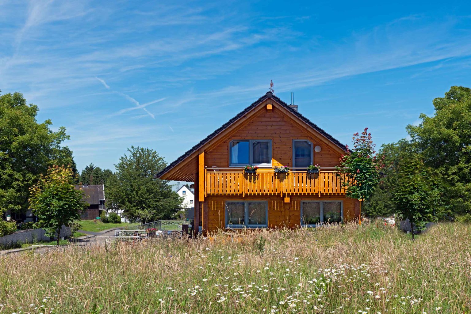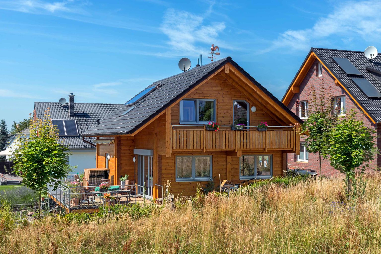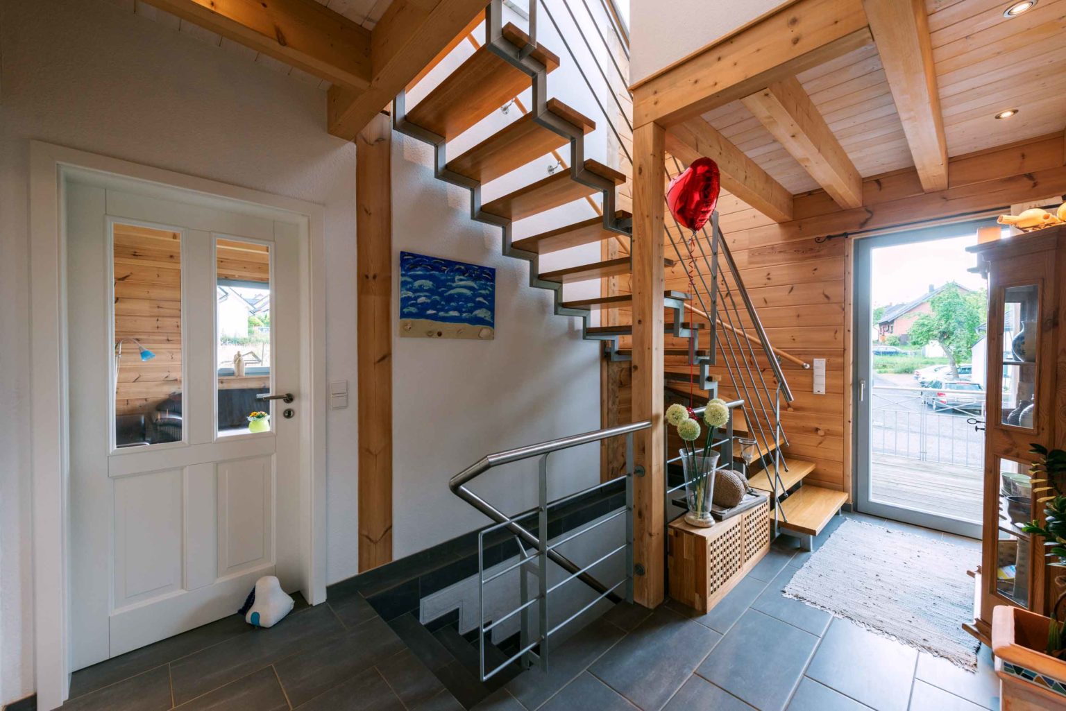 Das Eigentümerpaar entschied sich für eine Richtmeistermontage, bei der Hausherr, Sohn und Schwiegersohn unter Anleitung des Fullwood-Richtmeisters die fertigen Wandelemente montierten. Montagmorgen um Punkt 8 Uhr wurden die Vollholzwände, Dachsparren, benötigten Balken und Schrauben etc. geliefert, und Mittwochabend um 18 Uhr konnte schon Richtfest gefeiert werden. Zum Glück war Holzhaus „Kirchturmblick“ da schon dicht, da es zu regnen begann. Außer Fliesenarbeiten und Sanitärinstallationen machte das Familienteam sogar den Innenausbau selbst. Außen wurden die winddichten Polarkiefernwände mit Wetterschutz in der Farbe „Eiche hell“ gestrichen, innen trug der Hausherr einen UV-Schutz gegen Nachdunkeln auf und lasierte die Holzdecke weiß. Die Holzmaserung schimmert durch und die Deckenbalken blieben naturhell. Vereinzelte Trennwände (leichtes Ständerwerk) wurden weiß tapeziert, so dass es im Holzhaus schön hell ist. Für das Balkongeländer wählten die Hauseigentümer Lärchenholz und der Handlauf ist aus verzinkten Schwarzeisen mit silbrig-grauer Pulverbeschichtung, die farblich zu den hellgrauen Fenstern und Haustüre passt. Die Dacheindeckung in dunkelgrau passt ebenfalls gut dazu.