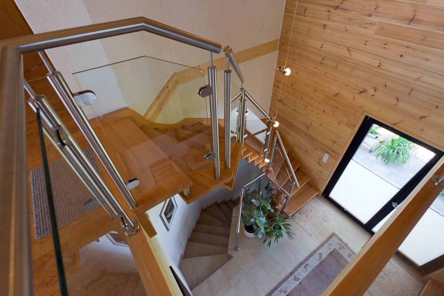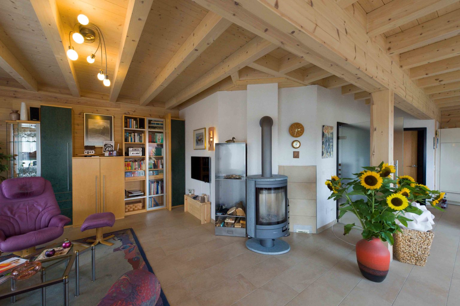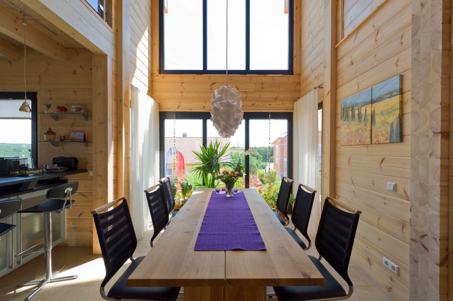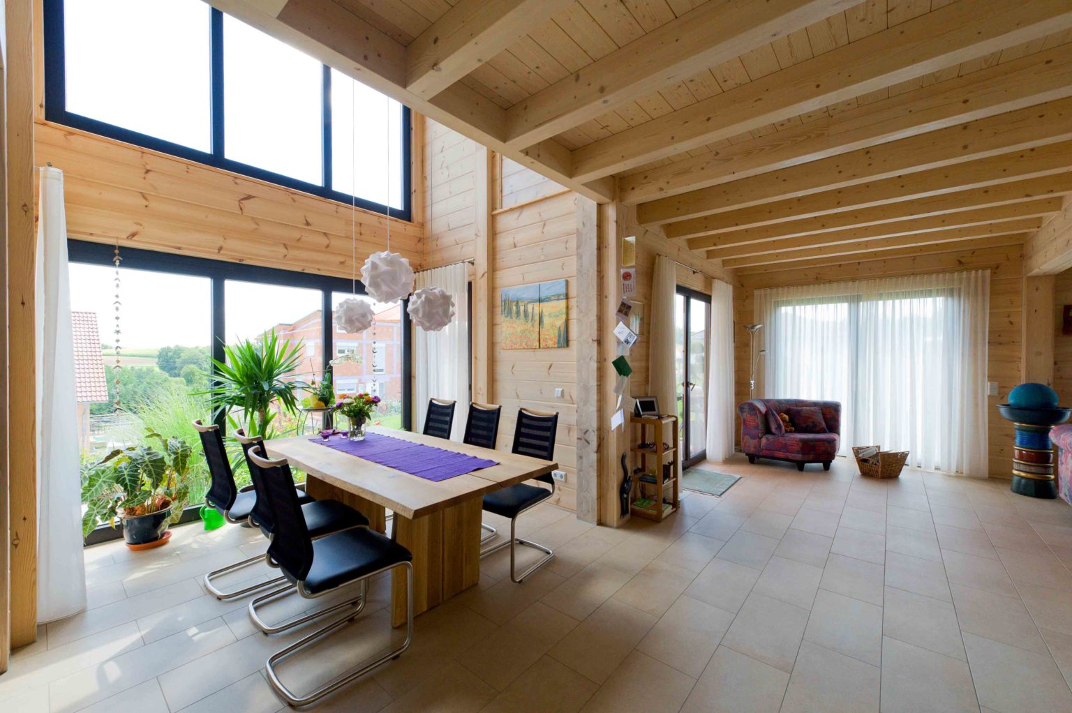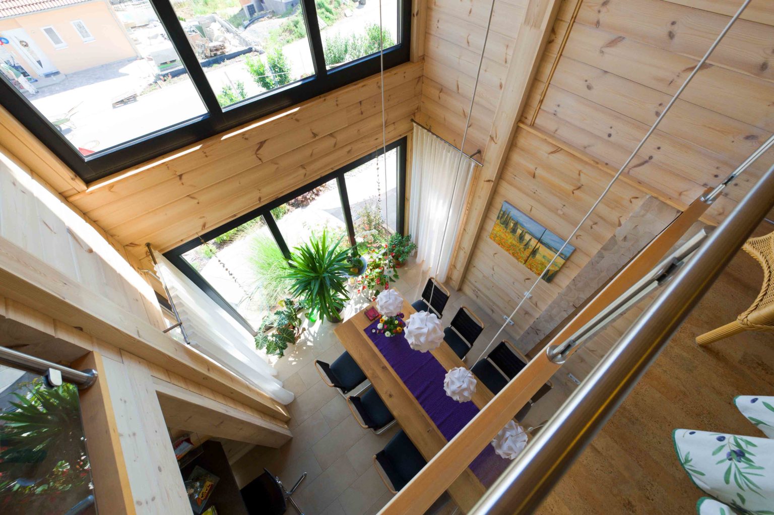 Das Rechteck des Grundrisses wird an der Südseite mit einem über zwei Geschosse ragenden, voll verglasten, dritten „Quergiebel“ ergänzt, der 120 cm hervortritt. Gleichzeitig wurde die Wand links davon im Erdgeschoss 130 cm nach innen versetzt, so dass dort, an der Süd-West-Ecke des Hauses, eine halb überdachte, windgeschützte Terrasse Platz findet. Drinnen erstreckt sich vom Erdgeschoss bis zum offenen First ein fast 6 m hoher Luftraum im Giebelhaus. Der sehr großflächige, offene Wohn-, Ess- und Kochbereich des Erdgeschosses besitzt, abgesehen vom erwähnten Luftraum, auch die großzügige Geschosshöhe von 2,63 m; es wurde extra eine Balkenlage mehr verbaut als normalerweise üblich. So gingen die Eigentümer von Holzhaus „Kocherblick“ ganz auf Nummer sicher, dass auch ja nichts optisch „drückt“. Trotz all der Weitläufigkeit und Luftigkeit wirkt dennoch nichts ungemütlich; dafür sorgt die sinnliche, warme Ausstrahlung der umgebenden Holzwände, die ein Geborgenheit vermittelndes Ambiente zaubern. Auch das Wohnklima profitiert von der natürlichen Feuchteregulierung des massiven Kiefernholzes. Zusätzliche Helligkeit bringen die mit weißem Naturputz bedeckten Ständerwände, welche im Holzhaus zur Raumteilung stehen. Das durch die größtenteils bodentiefen Fenster, welche den offenen Wohnbereich umgeben, üppig hereinfallende Tageslicht reflektiert auf den weißen Wandflächen wunderbar strahlend und bringt die Holzwände schön zum Leuchten. Selbst das Treppenhaus profitiert im Erdgeschoss noch von der Helligkeit im Wohnbereich, da es durch eine doppelflügelige Glastür von diesem getrennt ist. Im Obergeschoss, zu dem sich eine halb gewendelte, offene, leicht und modern wirkende Treppe aus Holz, Glas und Stahl hinaufschwingt, ist der Durchgang zur dortigen Galerie offen, so dass auch hier Licht ins Treppenhaus gelangt. Dazu besitzt das Treppenhaus selbst auch Fenster, die nach Norden gerichtet sind. Der Boden des gesamten Wohnbereichs sowie des Treppenhauses ist mit den gleichen, sandfarbenen Fliesen ausgelegt, was den weitflächigen Eindruck verstärkt. Auch das Gäste-WC, im Erdgeschoss vom Treppenhaus erreichbar, ist mit diesen Fliesen ausgestattet. Lediglich die Galerie und das Schlafzimmer im Obergeschoss bekamen einen fußwarmen, natürlichen Korkboden.